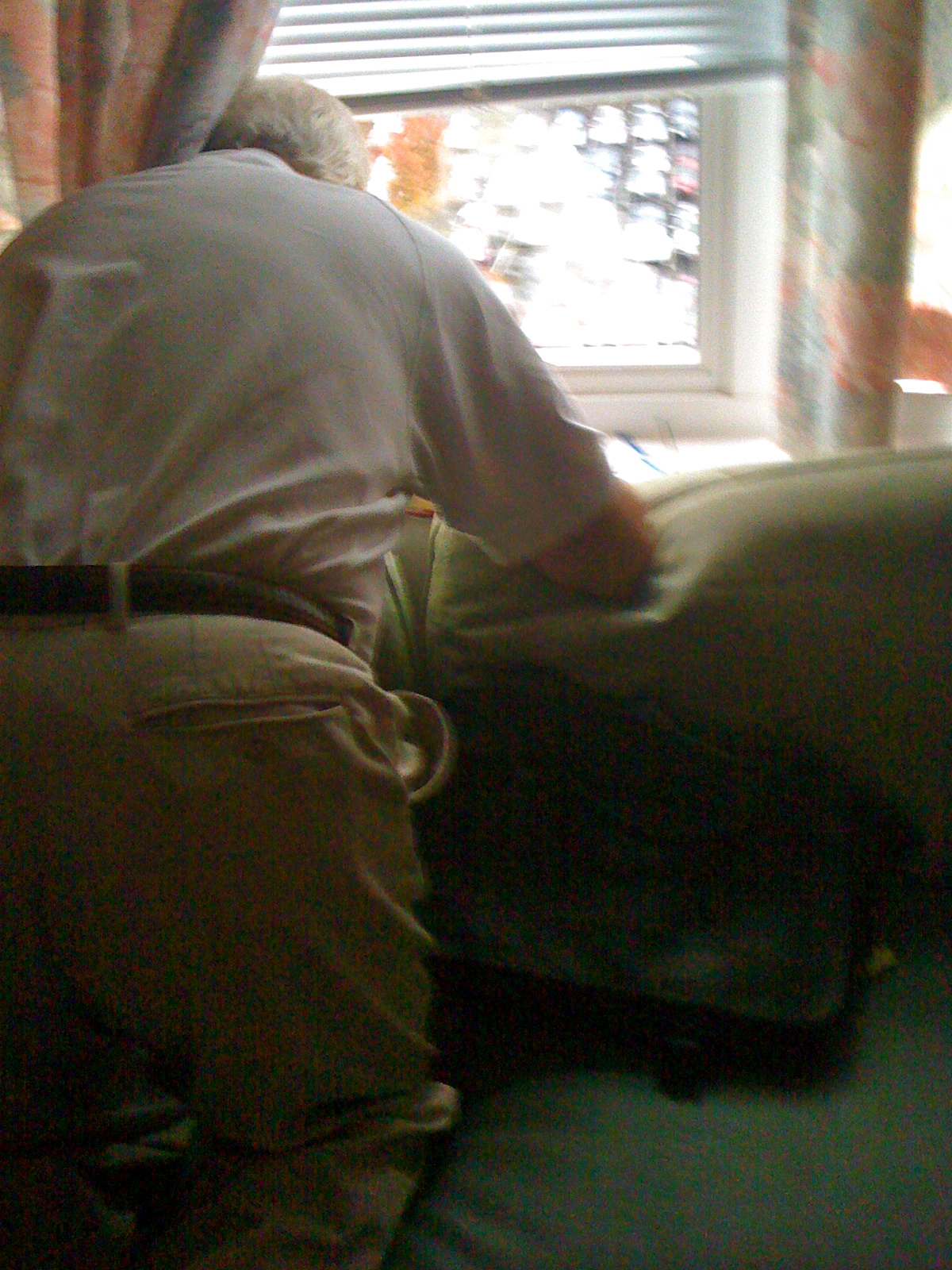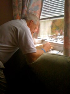 Yesterday Sara had her spleen removed to fix her sickness she’s been dealing with for the last 5 years.  She came through the surgery like a champ!   She was in pain and had some vomiting but was able to come home from the hospital this afternoon.   When we were at the hospital visiting Sara needed to go to the bathroom.  Well, you know how hospital gowns are.  So we told Papa to turn around and avert his eyes.  When we were finished helping Sara we found him like this!