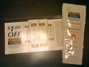 Another way to get coupons for your coupon stash is to ask for freebies. There are a TON of freebie websites and email newsletters out there. Just Google Freebies and you’ll be sure to find one you’ll like. I subscribe to Shop For Freebies. com’s daily newsletter. Couponing to Disney also alerts me to freebies. When you receive a freebie or sample in the mail most of the time there is a coupon included. Like today I received a sample of Gold Bond body wash. I’ve never used this brand or product but I LOVE samples so what the hay?! Samples are great for travel because once you use it up you just throw out the package and you don’t have to return home with big bottles. Anyway, included with my sample was this coupon for $1.00 off the product. Not too shabby for 30 seconds of inputting my name and address!