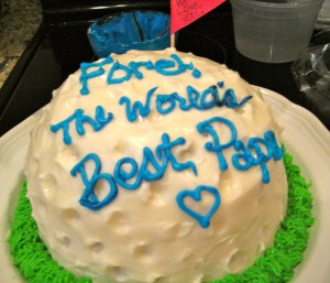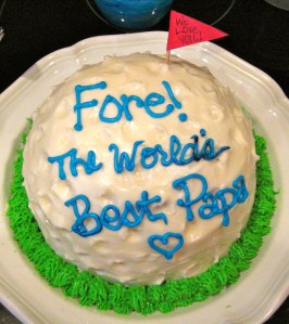 For Papa for Father’s Day this year I decided to make him a golf ball cake since he’s a huge golfer.  I’ve never made a golf ball cake before so I was a little nervous.  I baked a cake Saturday night in my Pampered Chef Batter Bowl.   I sprayed flour/baking spray into the bowl first and the cake popped right out when it was done.  Perfect!  Then Sunday morning I  carved the top of it (or I guess technically it was the bottom of the batter bowl) and made it more round.   I made cream cheese icing then colored some of it blue and some green and left the rest white.  I made a little flag out of a toothpick and a piece of paper.  Then I iced it.  For the dimples I used the end of a spoon dipped in hot water (so it wouldn’t pull any icing away).  He loved it!