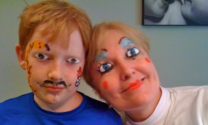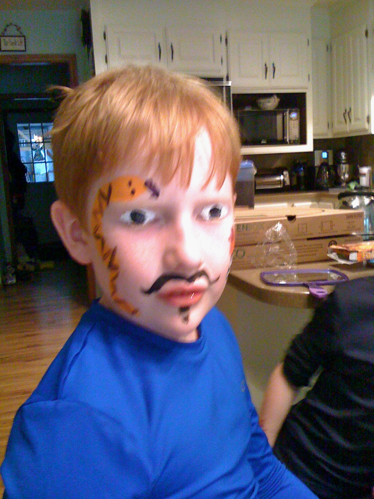 I face paint at festivals and parties on occasion. Sometimes I need an assistant. So the other day (could have been a couple weeks ago by now) I was over at my sister Sara’s house. She volunteered to help me face paint at an upcoming event but she wanted to practice first. Luckily she has 2 children we can paint. Someone had a fabulous idea of painting eyes on Jacob’s eyelids.