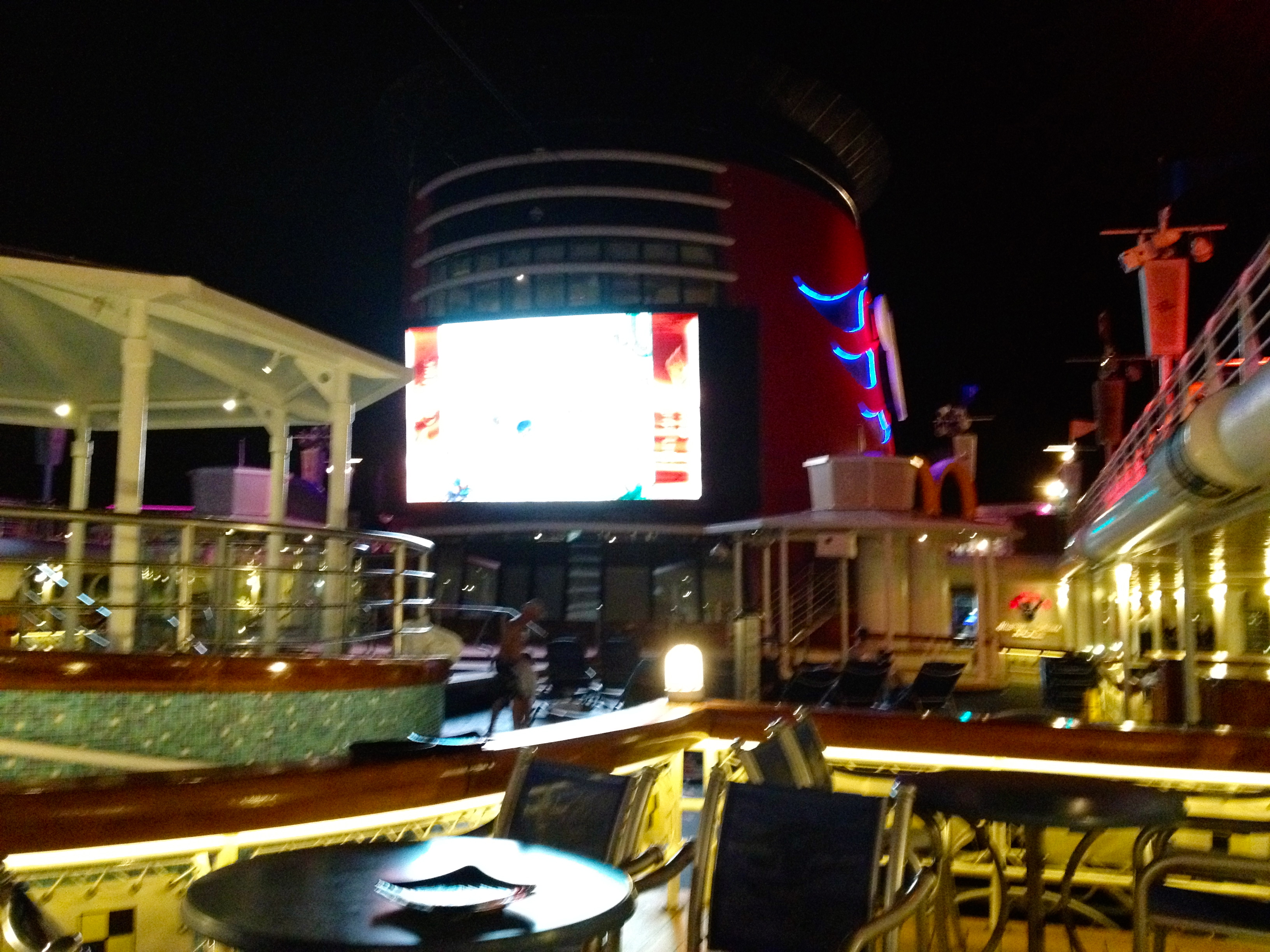 The room host also leaves the next day’s Personal Navigator. It’s a newsletter of sorts that tells you everything that’s going on onboard the next day. We changed clothes and went up on deck 10 to chill out. The winds were incredible! They were so strong that there were no chairs out for people so we went down to deck 9 and hung out a bit, watching Funnel Vision (the giant tv over Goofy’s Pool).