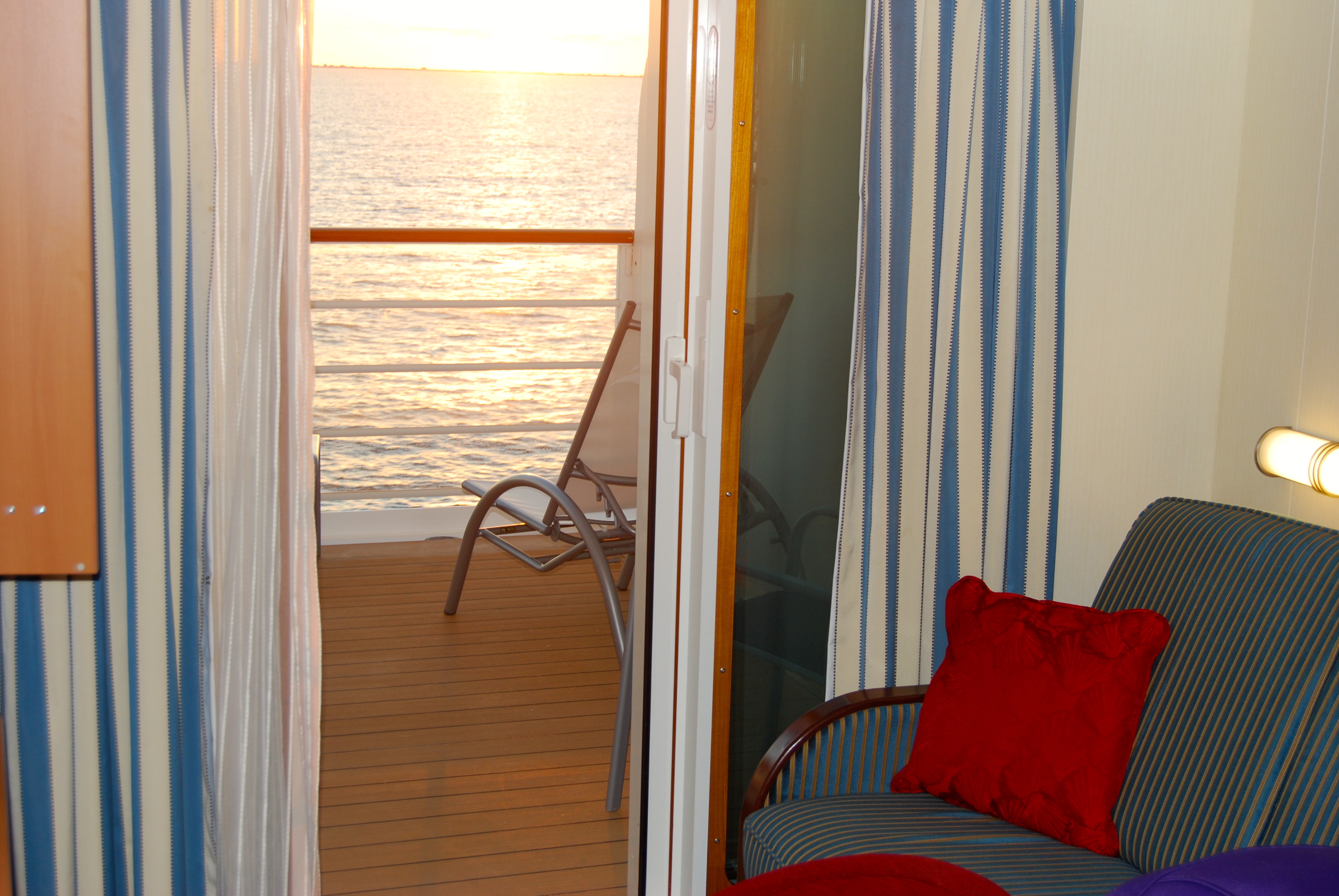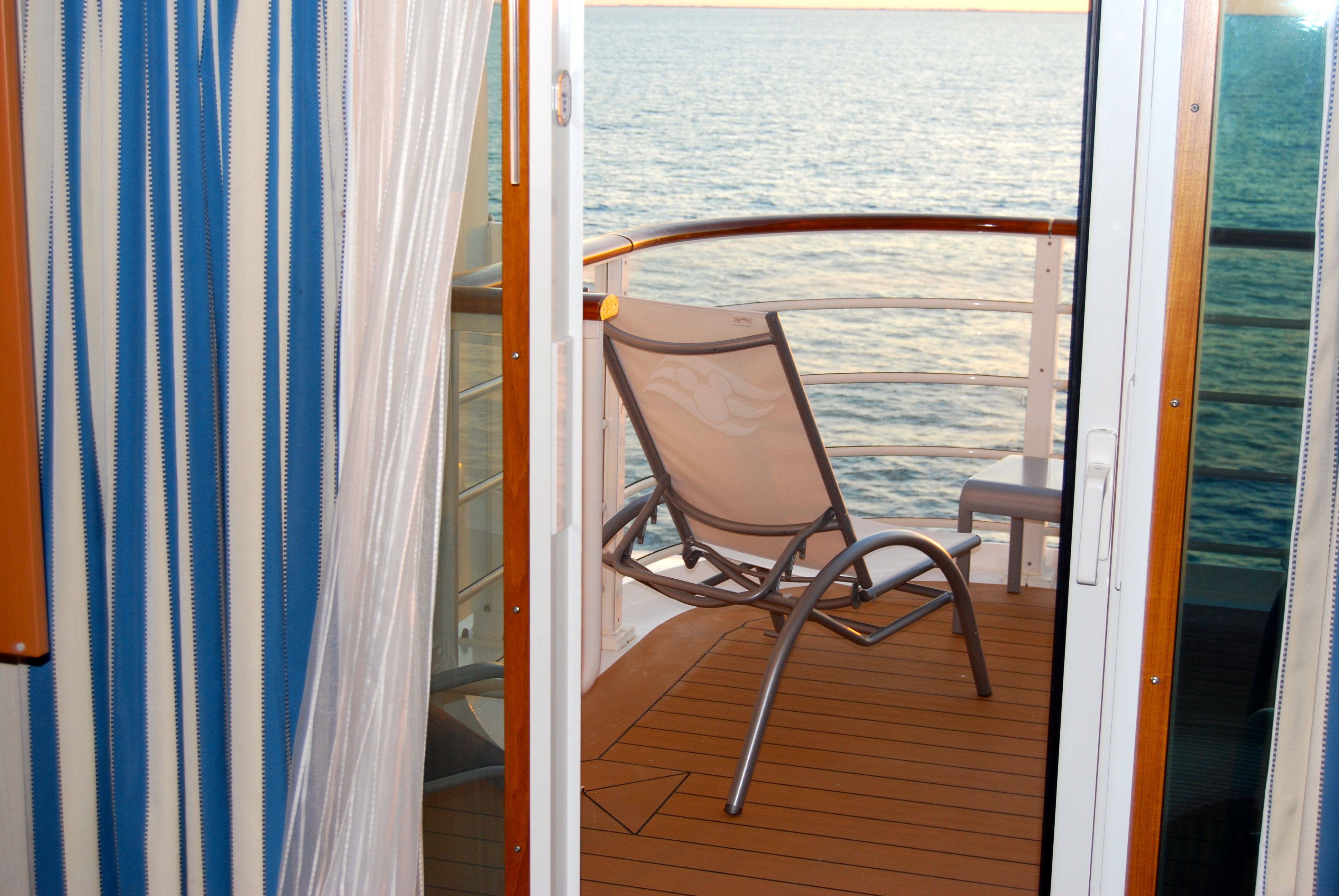 The balcony is much bigger than on regular balcony rooms and we just couldn’t believe how much room we had out there! Lisa really set us up well! Lisa is my friend first and also our travel agent. She told us the stateroom she found for us had a great verandah and boy was she right! Normal verandahs come with 2 straight back chairs and a small table.