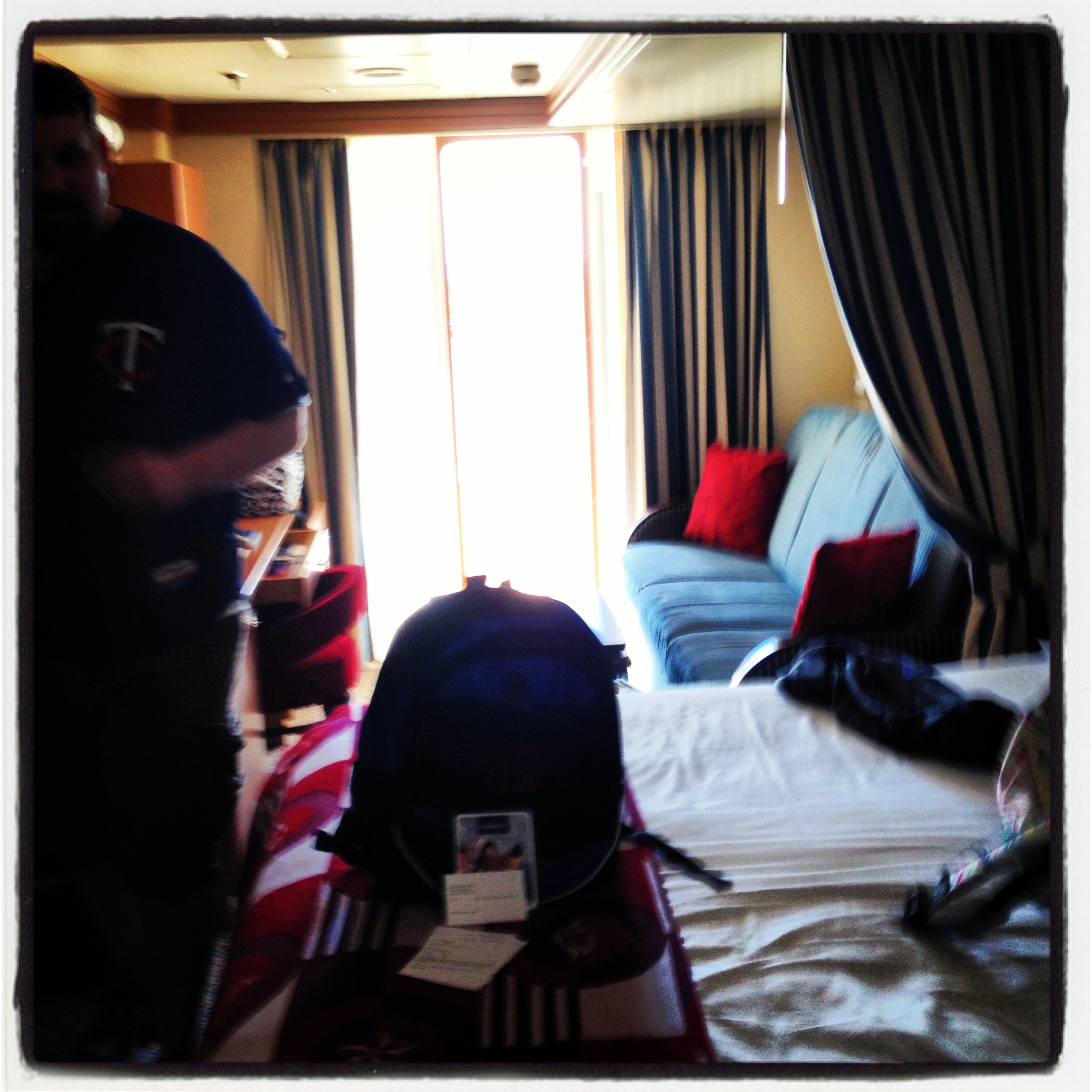 We went in, checked it out and deposited our carryon luggage. See the backpack on the bed there next to CSP? That was the free gift from Disney for being a repeat cruiser. In the bag was 2 bags of pretzels and a key chain. We used that back pack all week!