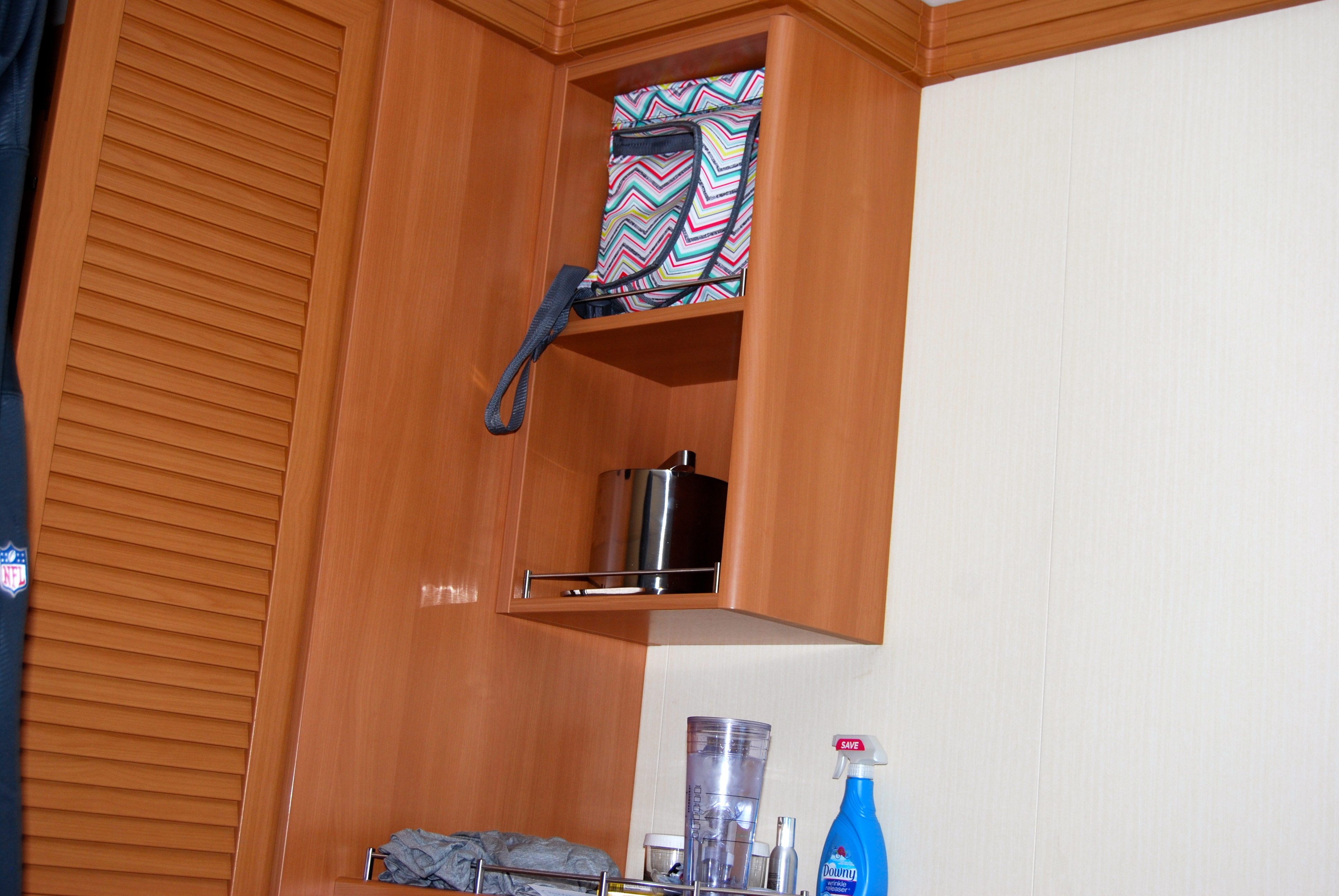 This set of shelves hangs over a set of 3 drawers. In this picture you’ll notice at the top is the Organizing Pack from Thirty One. I used it to carry my camera. It’s a backpack and it was awesome. Under that is the ice bucket. On the top of the drawers you’ll notice a bottle of Downy Wrinkle Releaser. If you don’t want to spend a bunch of time ironing on your cruise I recommend this product highly. Beside it is my big Starbucks tumbler. The cups provided at the beverage station on deck 11 are like tiny shot glasses. But if you bring your own cup you can fill it up and quit running back and forth for drinks. You still have to use their cups to fill up your cup for sanitary reasons.