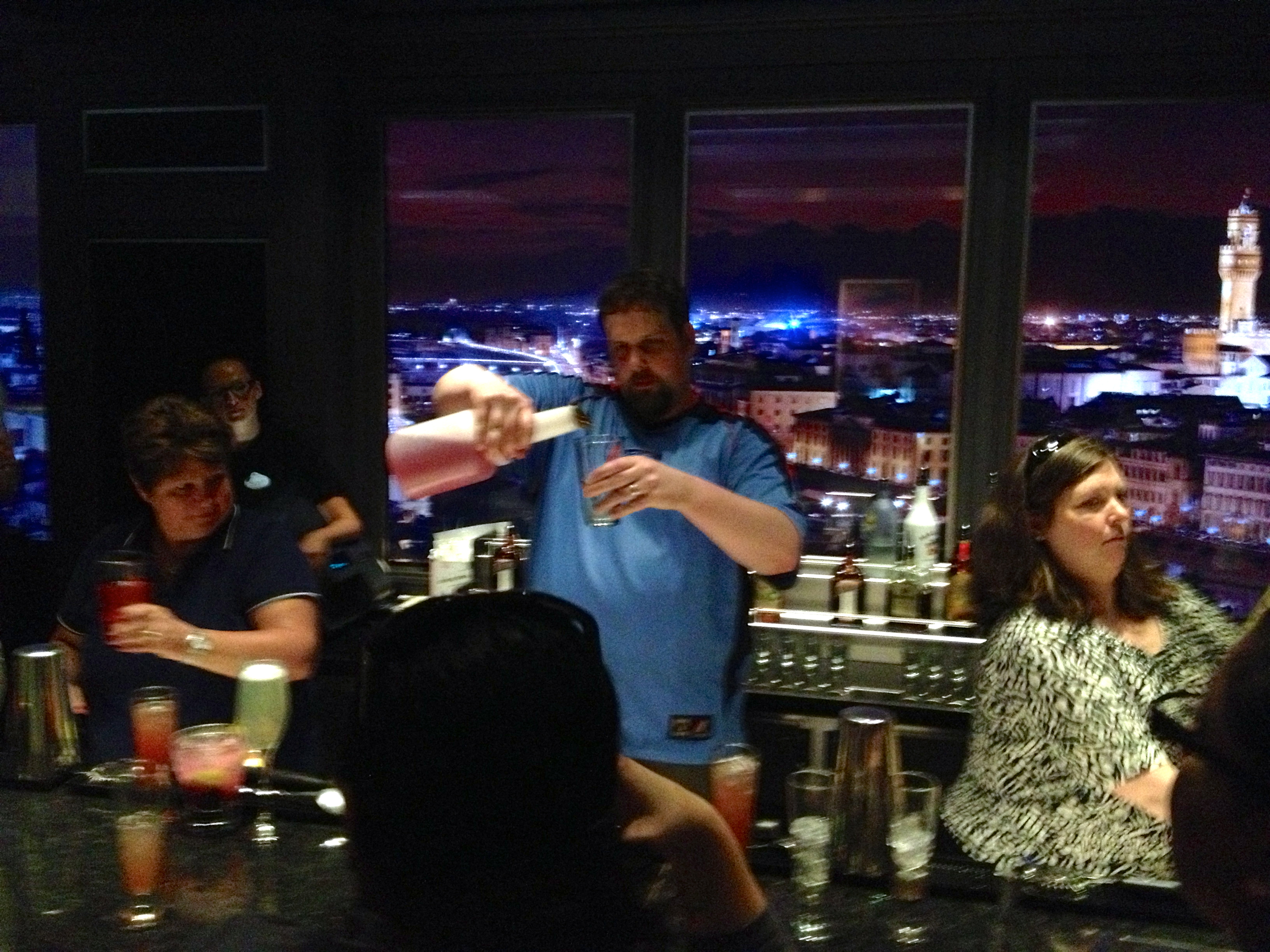 We woke up late and we had to rush to get to our Mixology class in time. On the Navigator it said the class was just a half hour but it turned out to last from 3:30 to 5pm! It was SO much fun! It was in the Skyline Lounge. Our bartender had us count off in 5s. Then he called all the Ones up behind the bar. One by one each group made a drink following our bartender’s instructions. He was from Northern England and had the best accent. I think his name was Darin so let’s call him that. The class was $15 each and we each got 5 drinks. What a bargain! Had we bought these drinks separately in a bar they would have been over $5 each! I made a drink called High Tide- it’s a Disney drink. Cranberry juice, pineapple juice, Malibu rum, and Amaretto. SO yummy! CSP made the very manly cosmo martini.