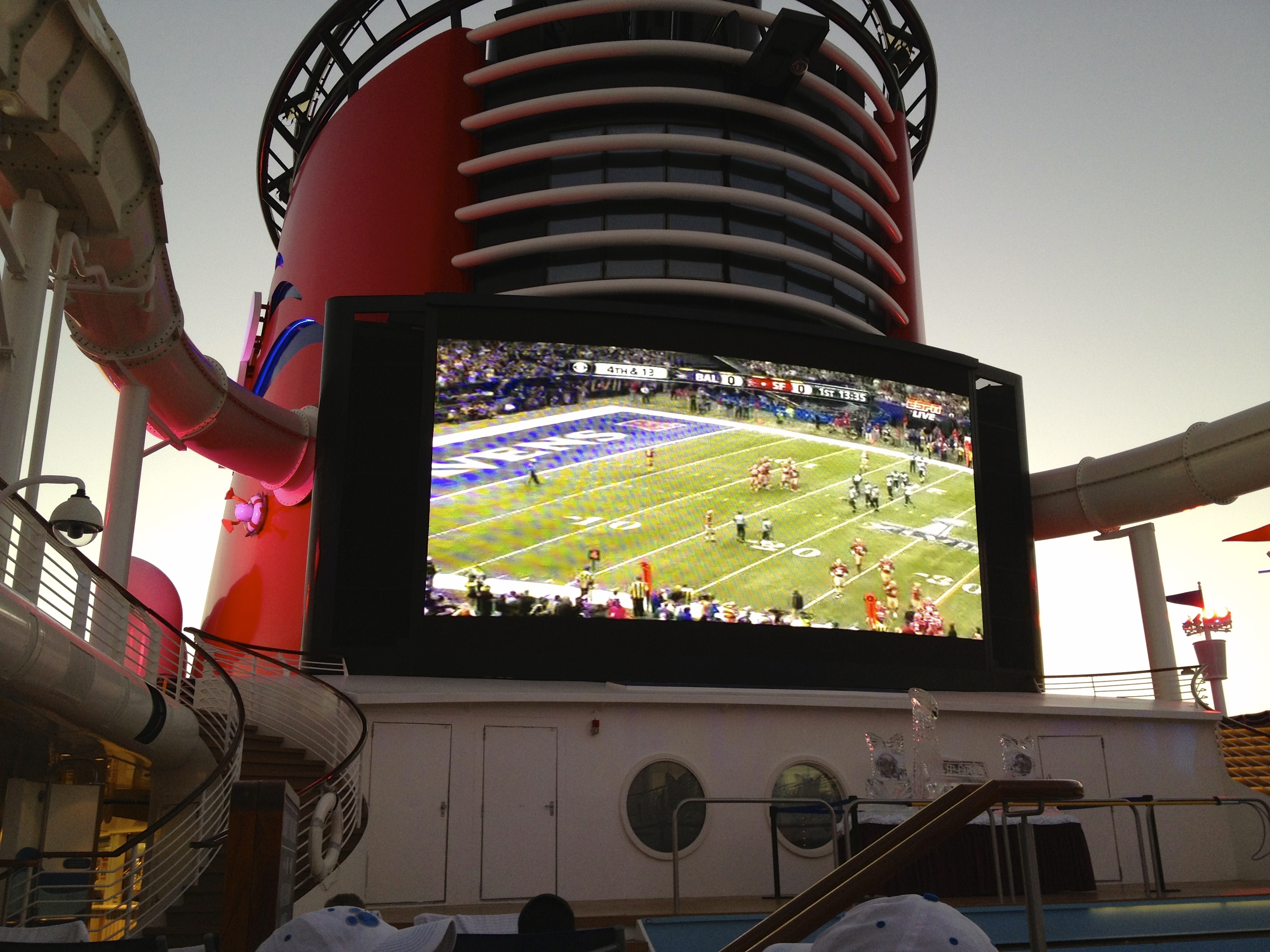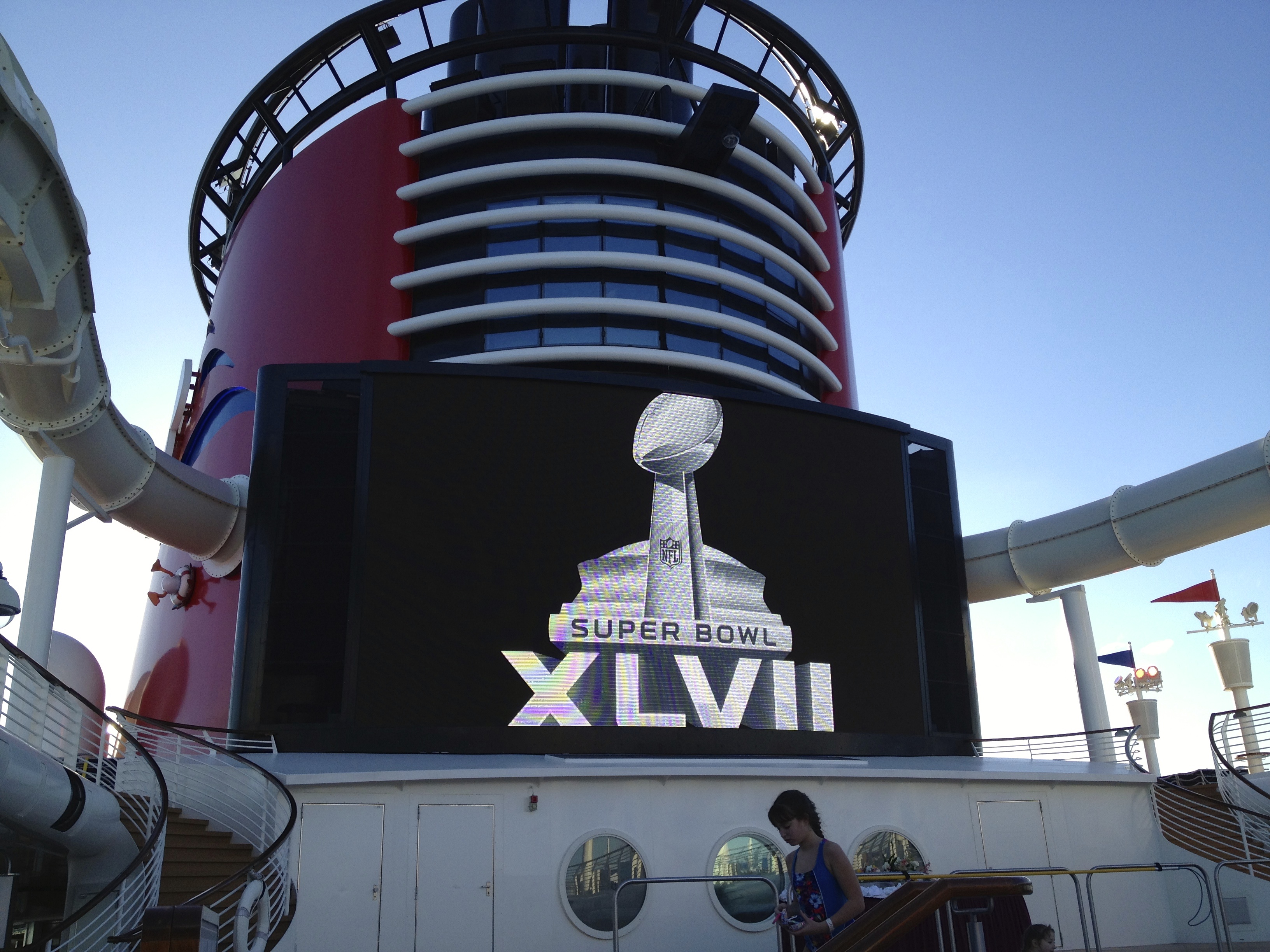 We scored awesome seats right by Donald’s pool in front of the big screen. It was formal night that night so watching the Super Bowl meant we’d be missing our dress up dinner, but CSP was so excited about watching the game on the big screen that I couldn’t bear to make him miss it. We sat down at 5 pm ish in what was apparently Ravens territory. There were lots of Ravens fans around. Some 49 fans but mostly Ravens fans. It was fun to watch people on the AquaDuck