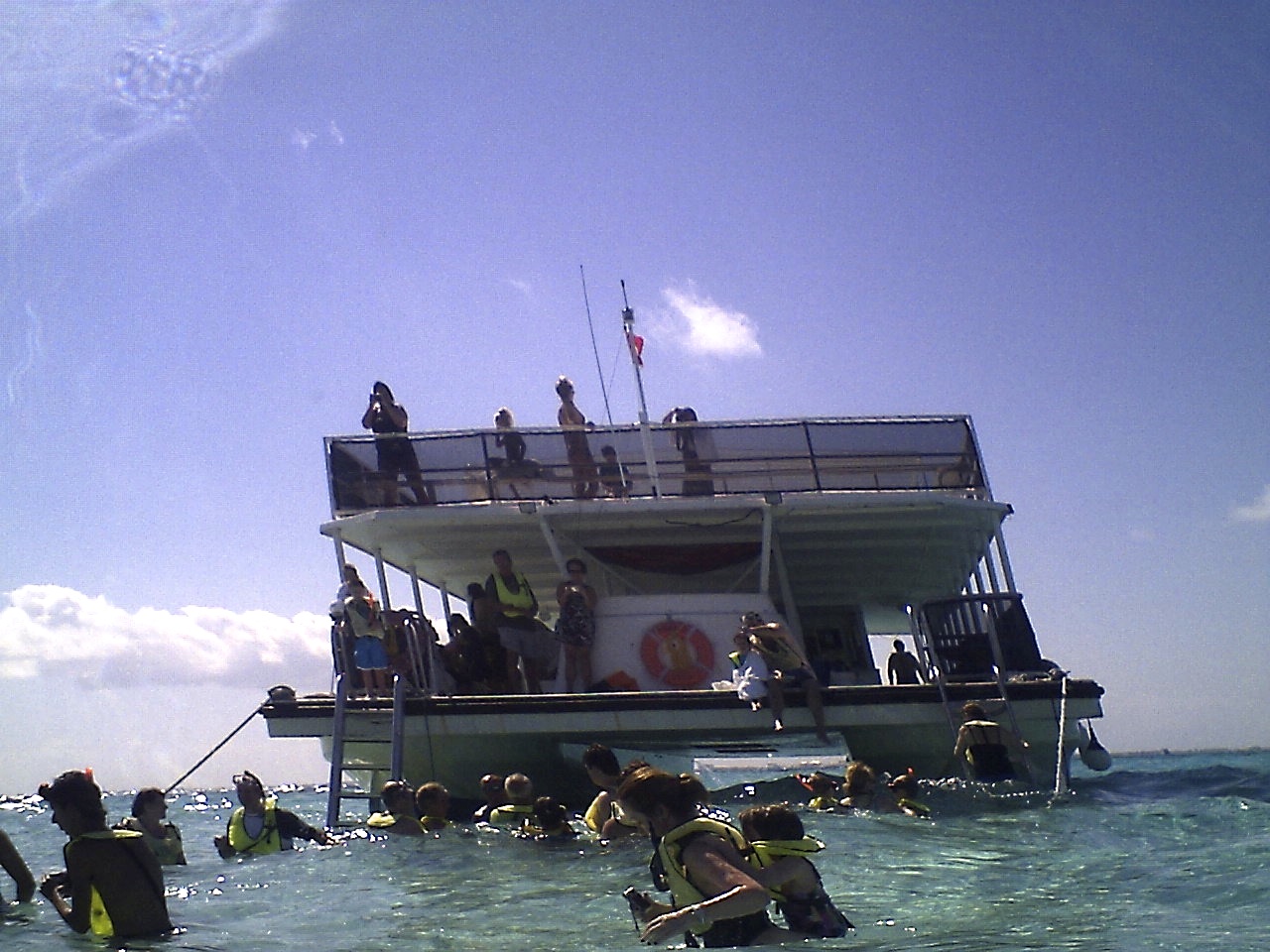 So, we pulled up to Stingray City and dropped anchor. Everyone put on life vests and grabbed snorkel gear (if so desired). We climbed down the ladder into the crystal clear, waist deep water. The wind was whipping pretty good, causing some waves, but overall the conditions were perfect! This is the tour boat: