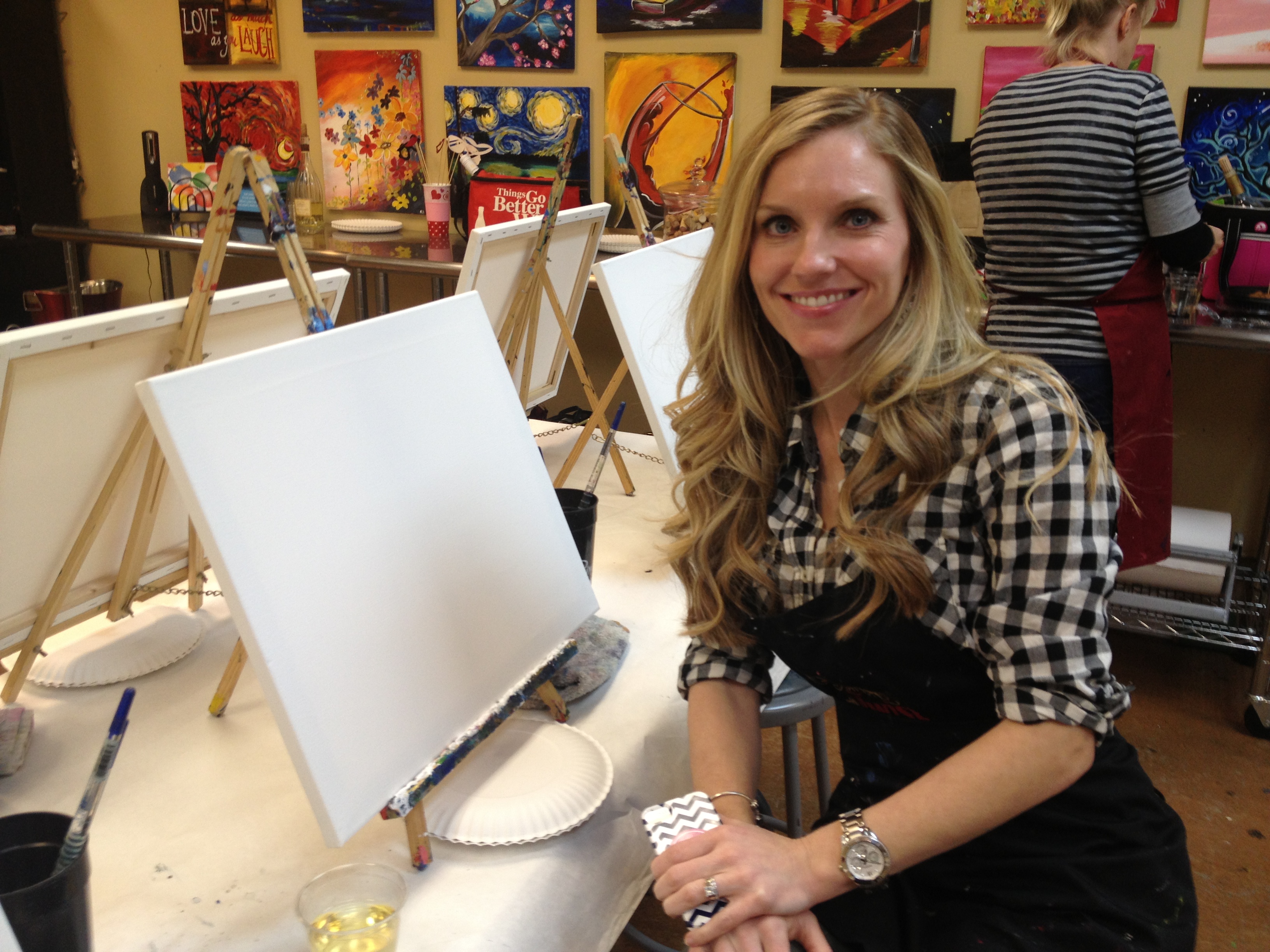 That’s my friend Christina.  They provide electric corkscrews.  Well I’d never used an electric one and my wine bottle was spinning all over the counter!  We drank a bottle of moscato my in-laws gave me for Christmas.  I’d been looking for an occasion to pop the cork!  SO good.  An instructor stands up on a stage in front of the group and paints the same painting you’re painting, step by step.  She calls out steps to you.  So we started with the middle of the canvas.  The sunset. IMG_3518