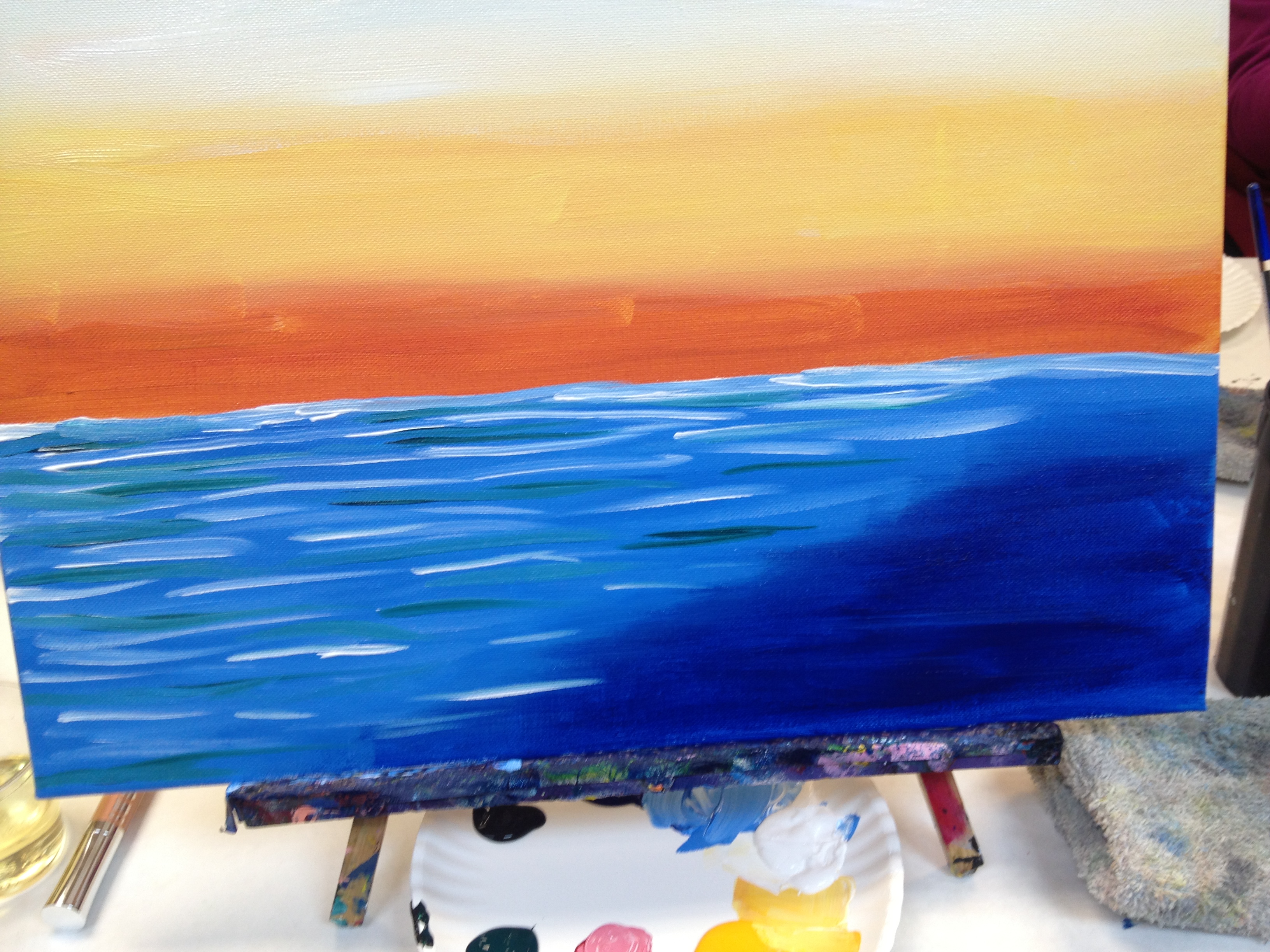 Let me tell you, that white canvas can be intimidating.  That first brush stroke is scary!  But then I got over it and moved on. We mixed our own colors so everyone’s oranges and yellows were slightly different.  Then we moved on to the beach and the water.