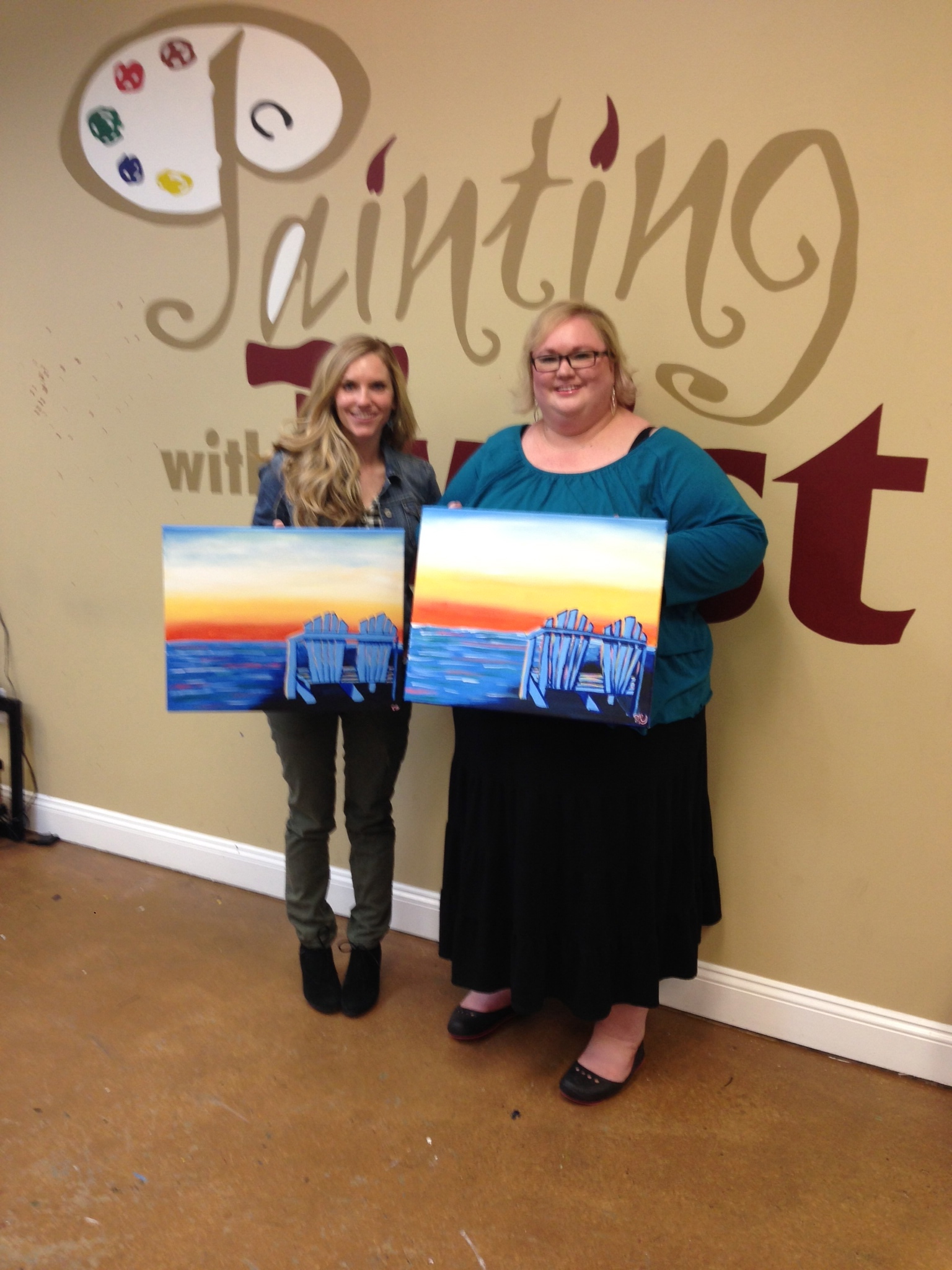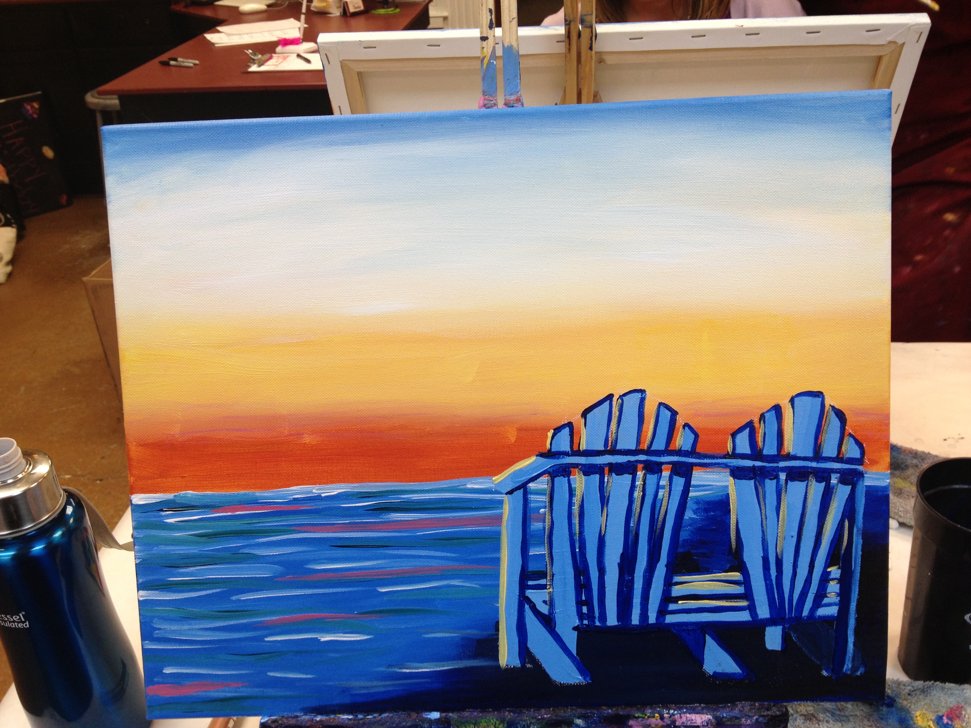 Friday night Christina and I went to Painting With A Twist.  It’s an art class type place where you can bring wine and snacks.  Although I don’t know how you can eat while painting but some did.  So what you do is go online and check their calendar and pick out a painting you want to paint.  We chose Beach Chairs At Sunset and Friday night.IMG_3481 Each class has a different painting.