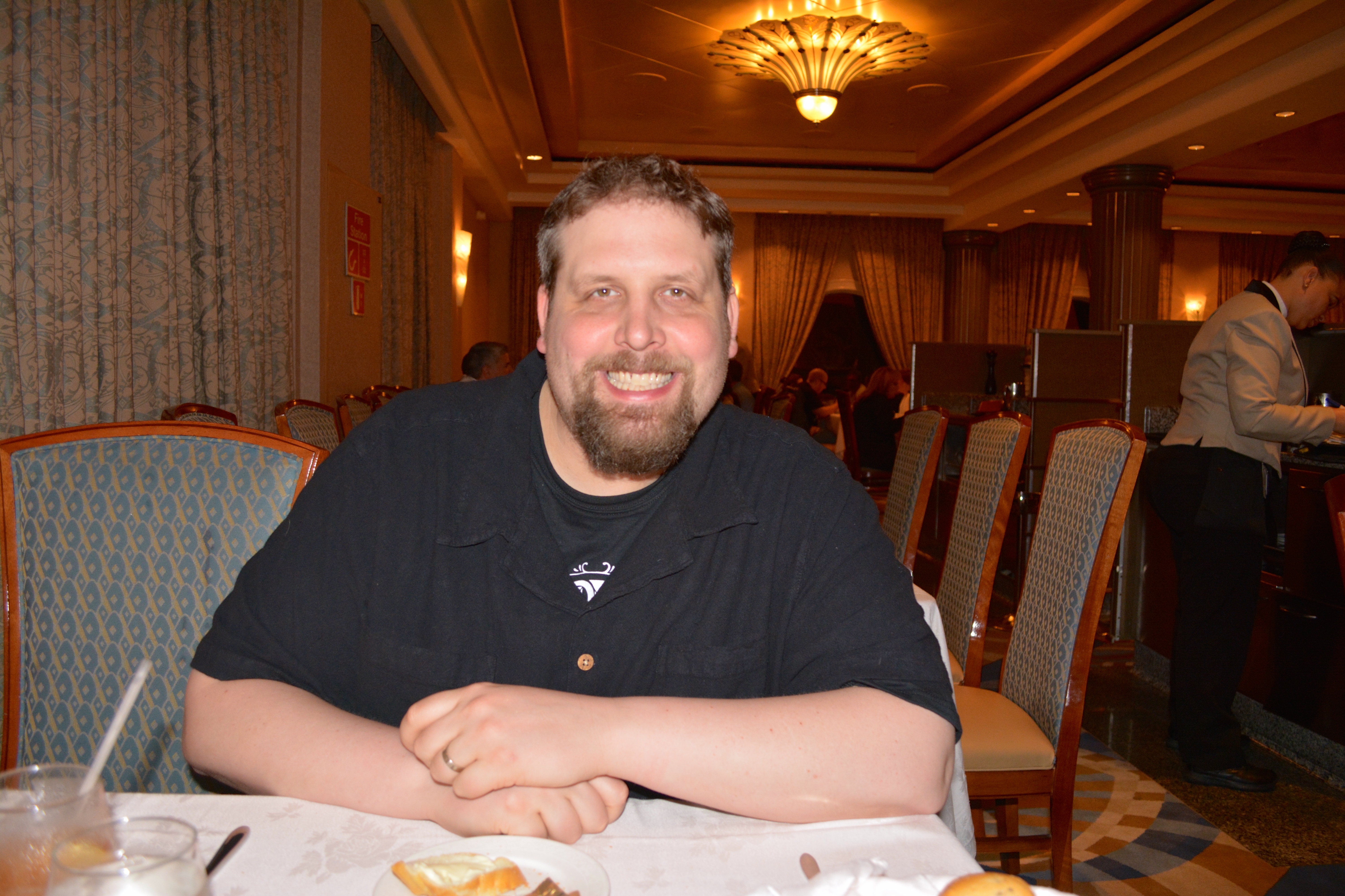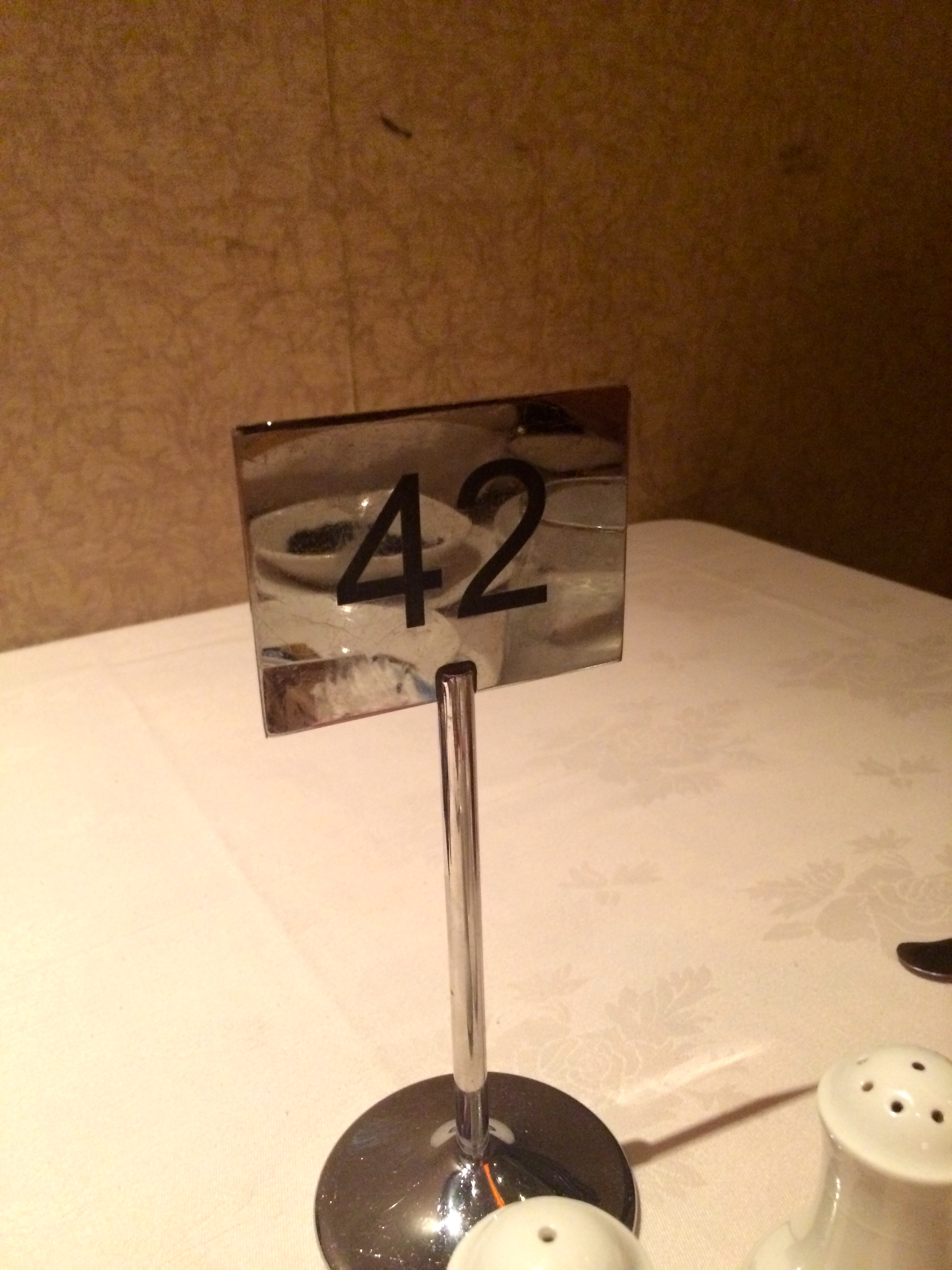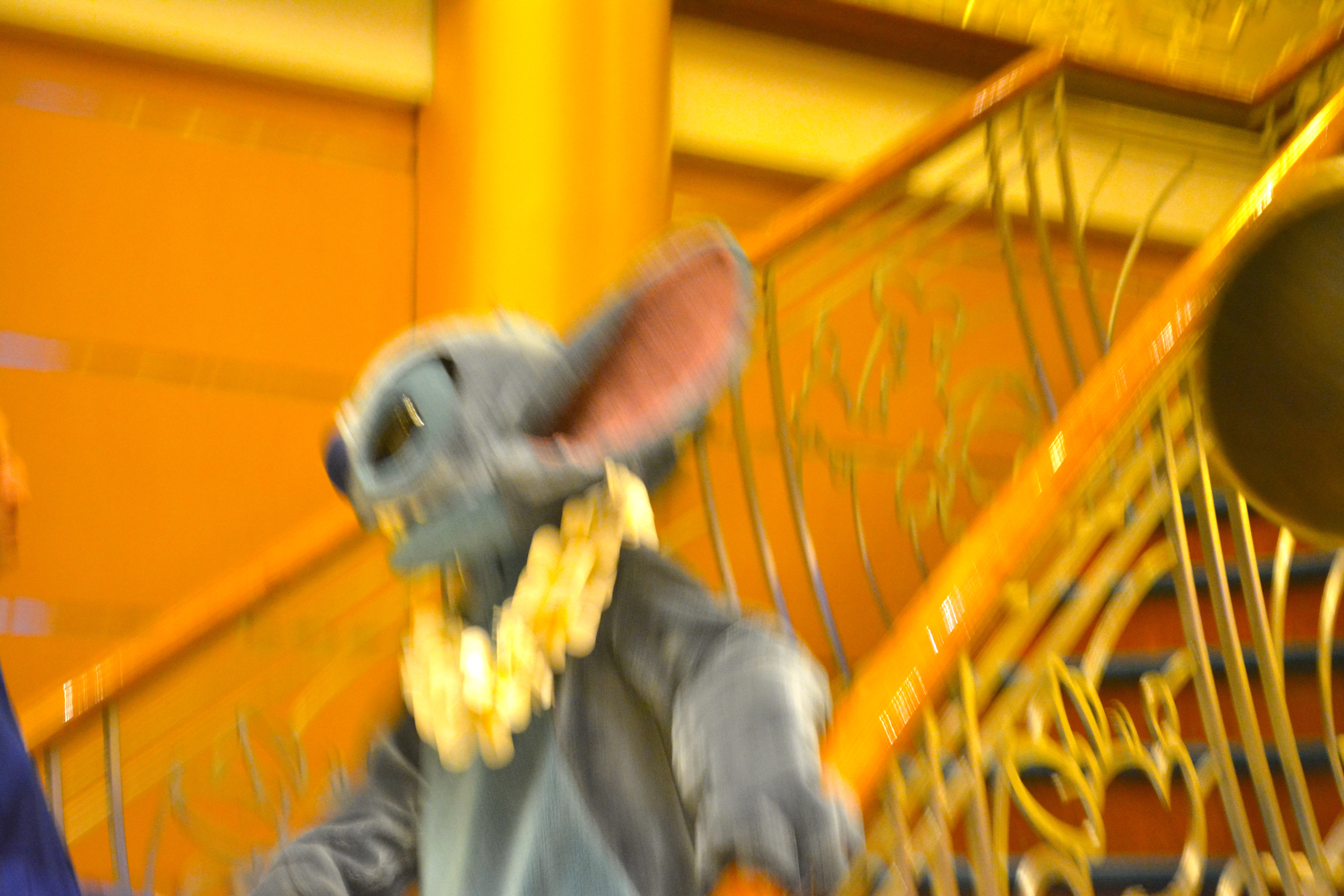 Dinner tonight was at Lumiere’s. On the way in we saw Stitch in the lobby. He’s my favorite! And there was no line! But alas he was heading upstairs for a break so this is the best pic I could get.