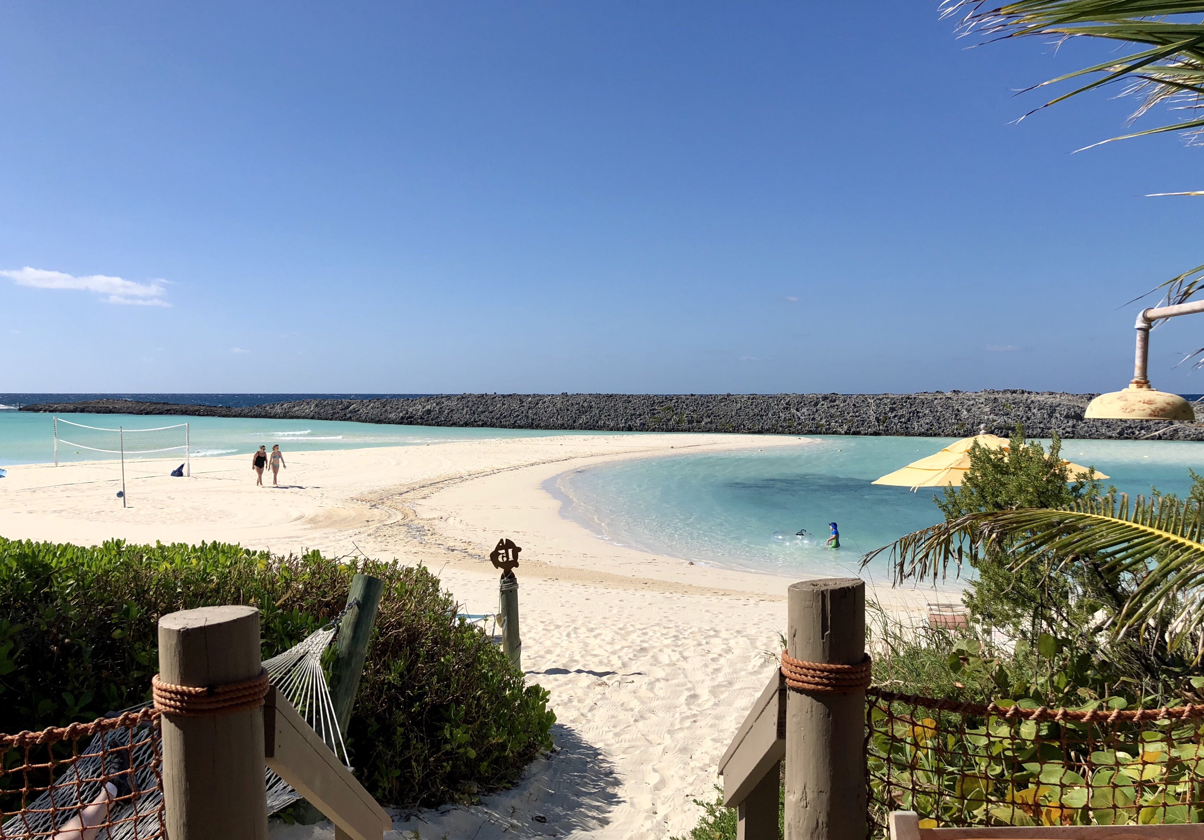 Inside was a map of Castaway Cay, a lot of information, and 2 wristbands for our CABANA!!!! Yep! I miraculously scored a cabana on the family beach (the best side in my opinion)! Gather round and I’ll tell you how it happened. Our new friends Laci and Rusty sailed concierge this cruise. Concierge gets first dibs on the cabanas and there are only 25 on the whole island! 21 on the Family Beach and 4 at Serenity Bay, the adult only beach. Well, Laci and Rusty ended up with 2 cabanas and they only needed one. So they offered up the 2nd cabana to our cruise group! So generous and nice!!! I plead our case, that it’s our 17th anniversary and we reeeeeaaaalllly wanted one and they let us have their spare! Woot!!! I mean, we still paid for it but just getting the cabana is a huge feat in itself so we are immensely grateful!