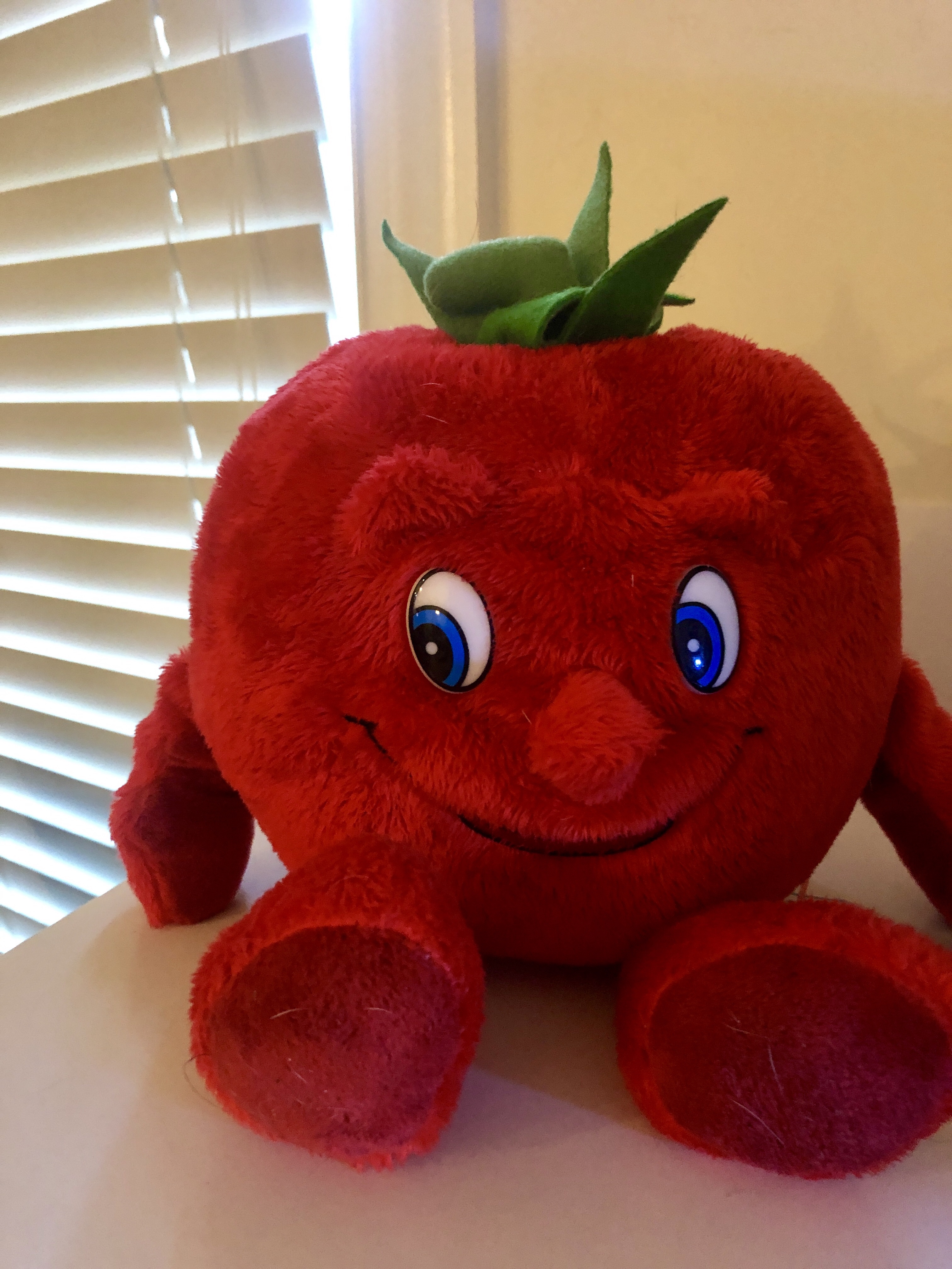This is a plushy tomato toy. Last year on my birthday we stopped in at Lidl for a couple things. I stayed in the car while CSP ran in to shop. He came out with this thing that he found in the clearance bin for like $2 and proudly presented it to me. As a gift. Happy Birthday CSP exclaimed! Aw thanks, Honey! So we got home and I put the tomato on my desk. But it’s been months now and I’m not the biggest tomato fan really. So I put it with the pug toys. Keep in mind this side eye giving tomato is a good 6 inches tall, so he’s not some tiny thing I can easily find a place for on my desk. I mean, thank you, but what do I need with a giant plushy tomato?? Well fast forward to the other day when CSP was tidying up the pug toys. The pugs’ cousin Bea had been here for a week so toys were strewn everywhere. He came upon Mr. Tomato on the floor in the midst of the rest of the toys. “What’s he doing down here??? Why is he on the floor??” CSP picked him up, dusted him off and plopped him down on my printer. “I gave you this on your birthday!!!” He was low key not pleased that I’d let the tomato go to the pugs. So now he’s sitting on my printer, taking up space, eyeing me like I’m some sort of ungrateful gift traitor! Punk ass vegetable!