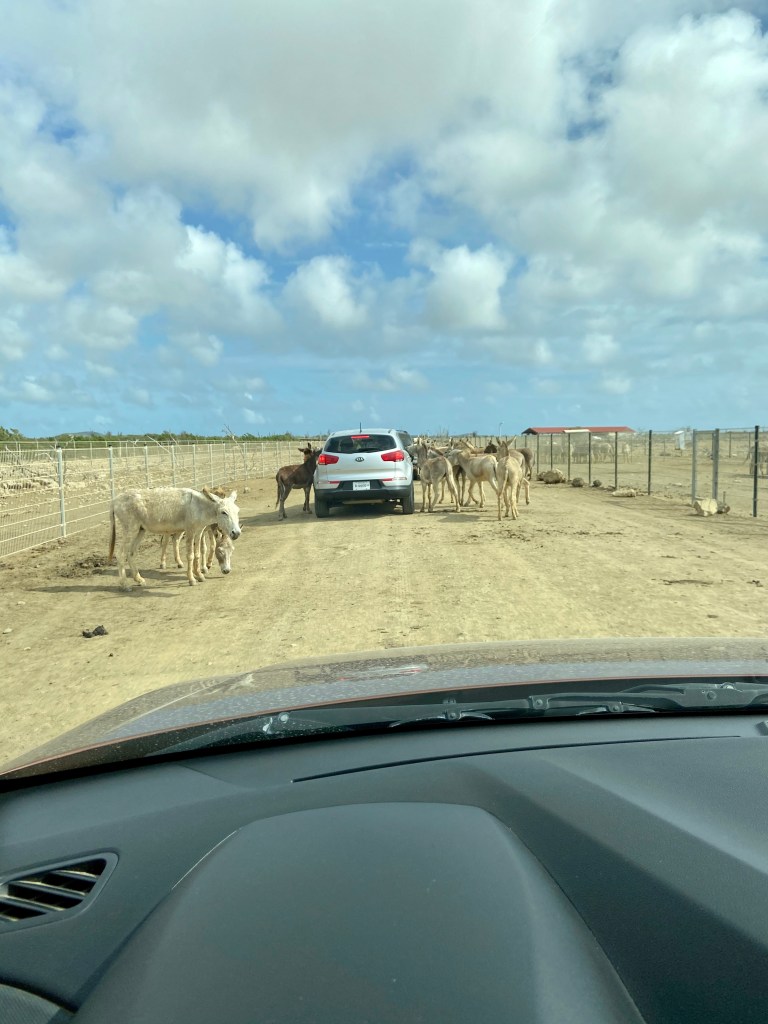 I drove to the Donkey Sanctuary. I’ve been looking forward to this for over a year!!! Ok so back in the 1500s donkeys were brought to Bonaire (pronounced BONE AIR) to help mine the salt. Once cars and machines became a part of the equation they didn’t need the donkeys anymore. But the donkeys were getting hit by cars on the roads and whatnot. So Marina founded the Donkey Sanctuary. There are still over 400 wild donkeys on the island. We met Marina at the ticket counter/gift shop. She only charges $9 each to get in. She needs to be charging $20! It’s so fun! So Marina tells you about the donkeys and the facility and you buy your bag of carrots (buy more than 1- there are 743 donkeys who need carrots!) and get in your car then drive through the sanctuary.