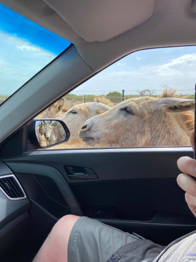 As soon as you drive in your car is MOBBED by donkeys! They stick their heads in your windows
