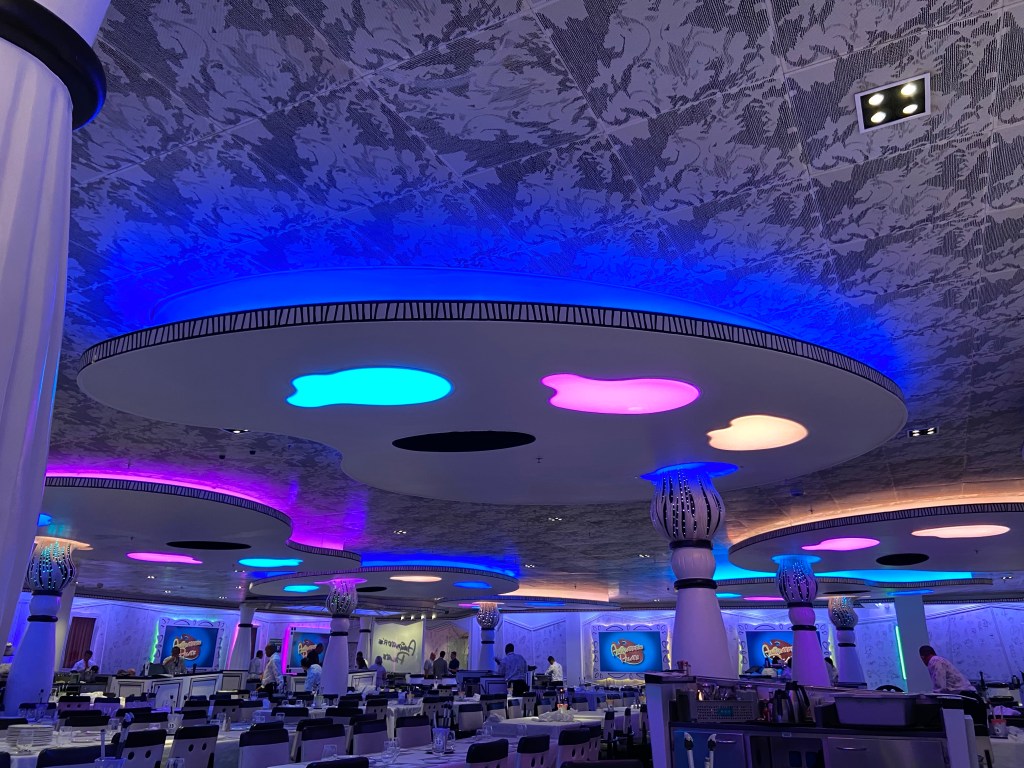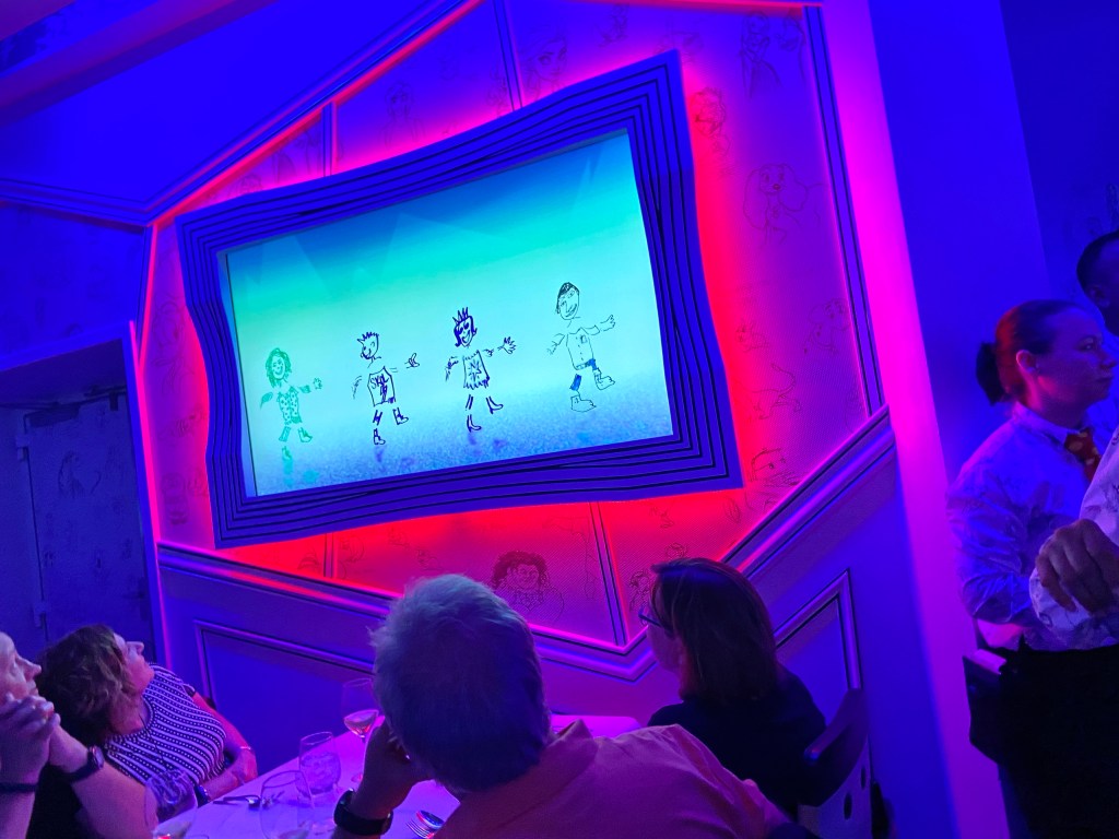 Your servers give you a marker and a big sheet of paper with outlines of a person on it. You draw in your figure and they animate it and project them on the screens around the restaurant. SO cool! CSP’s little guy got to dance with Cinderella!