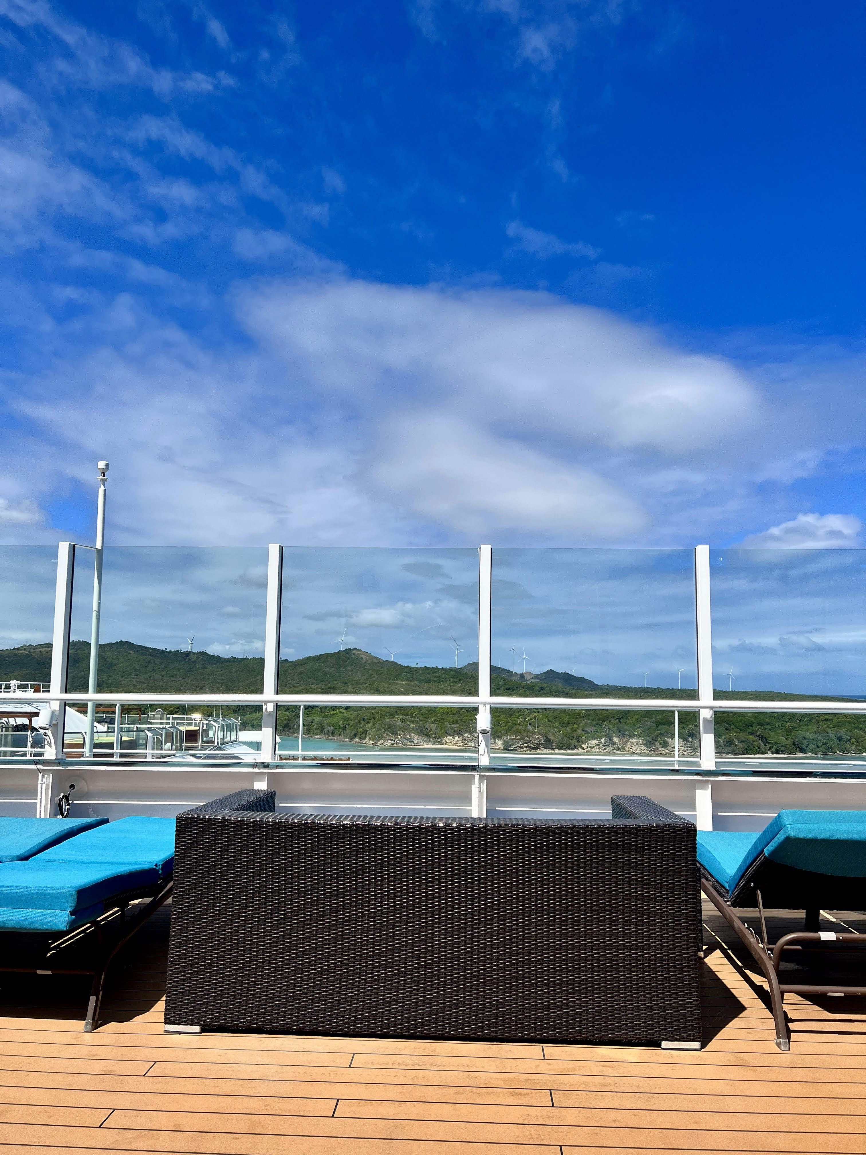 We went down to deck 0 to disembark for the day and when the elevator doors opened the lobby was PACKED with people!!! And the line was NOT moving. I asked a lady in line what was going on. She’d been in line for 15 minutes without moving. Then the cruise director came on over the PA and explained that another ship was currently docking next to us so disembarkation on our ship was halted until the other ship was finished docking. Well my trick knee won’t let me stand in one place for that long so we went up to the Serenity adults only area to wait it out. We scored one of those round loungers with a clamshell roof type thing and climbed in and started reading our books. CSP then decided he didn’t want to get off the ship today so we just hung out up on deck 15 in the Serenity area until about 1 pm.