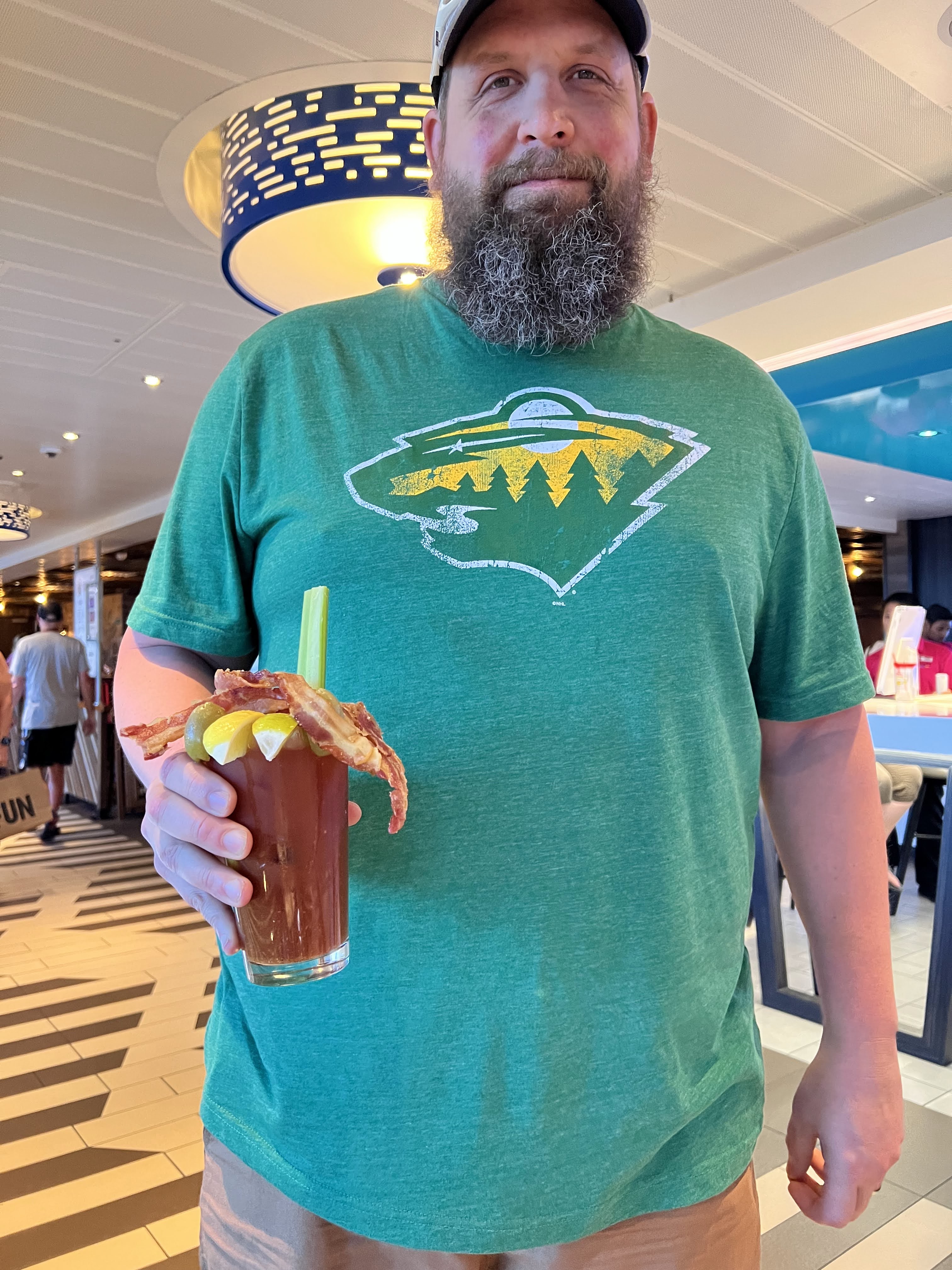 Then we went back down to the lido deck for gelato for me and a slice of cake for CSP. On the way to our room to pack CSP picked up a cheeseburger at Guy’s burger joint. CSP said it was his favorite thing he ate all week! It did look yummy! We went back to our room to shower and get ready for our last dinner, plus pack a bit.