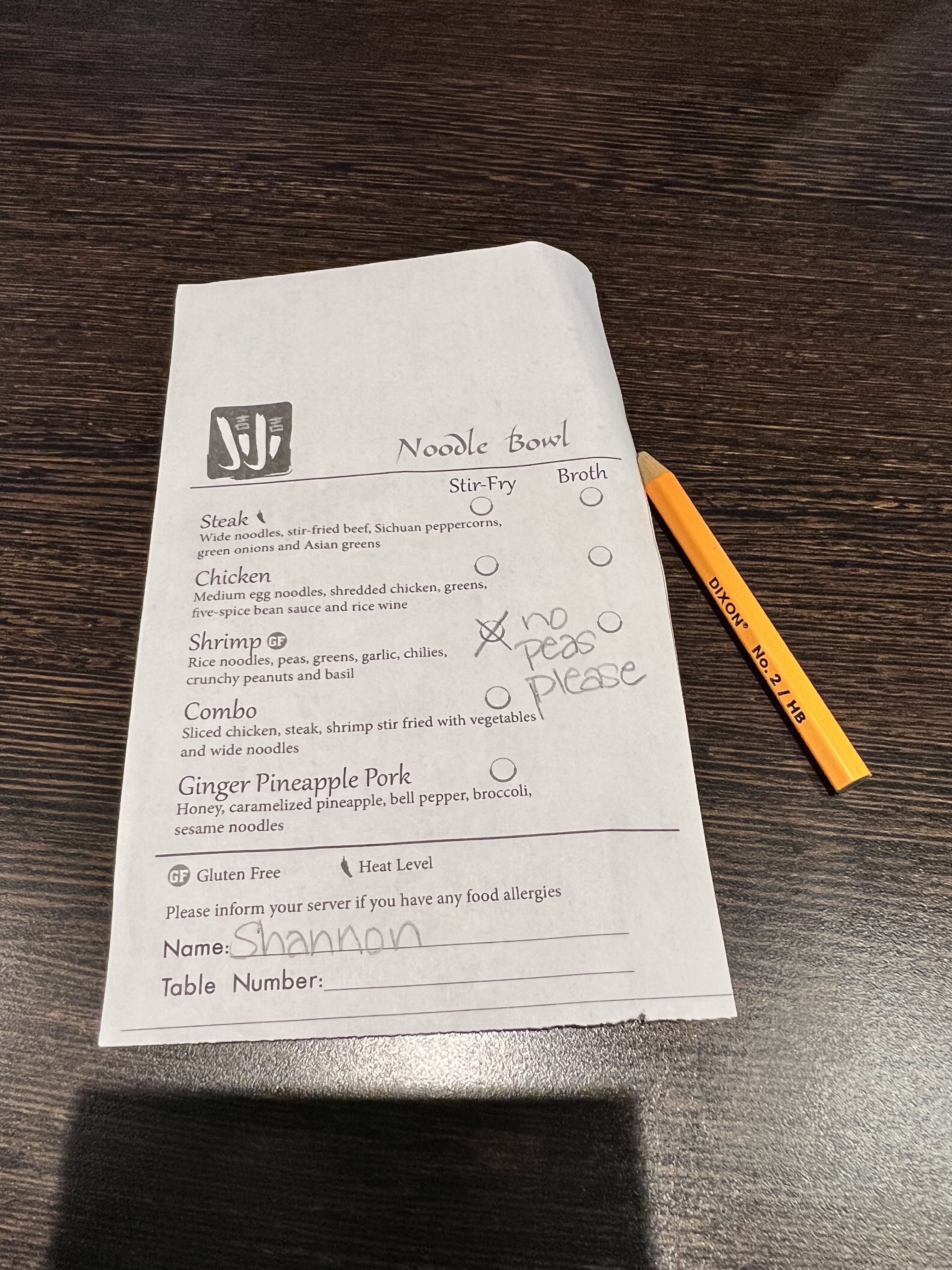 For instance I asked for no peas and they couldn’t accommodate me because it’s premade (according to our server). I had the shrimp stir fry and CSP got the steak broth. I wish I’d had gotten the broth. Who knew it was like ramen? My stir fry had no sauce or flavor, but CSP loved his dish.