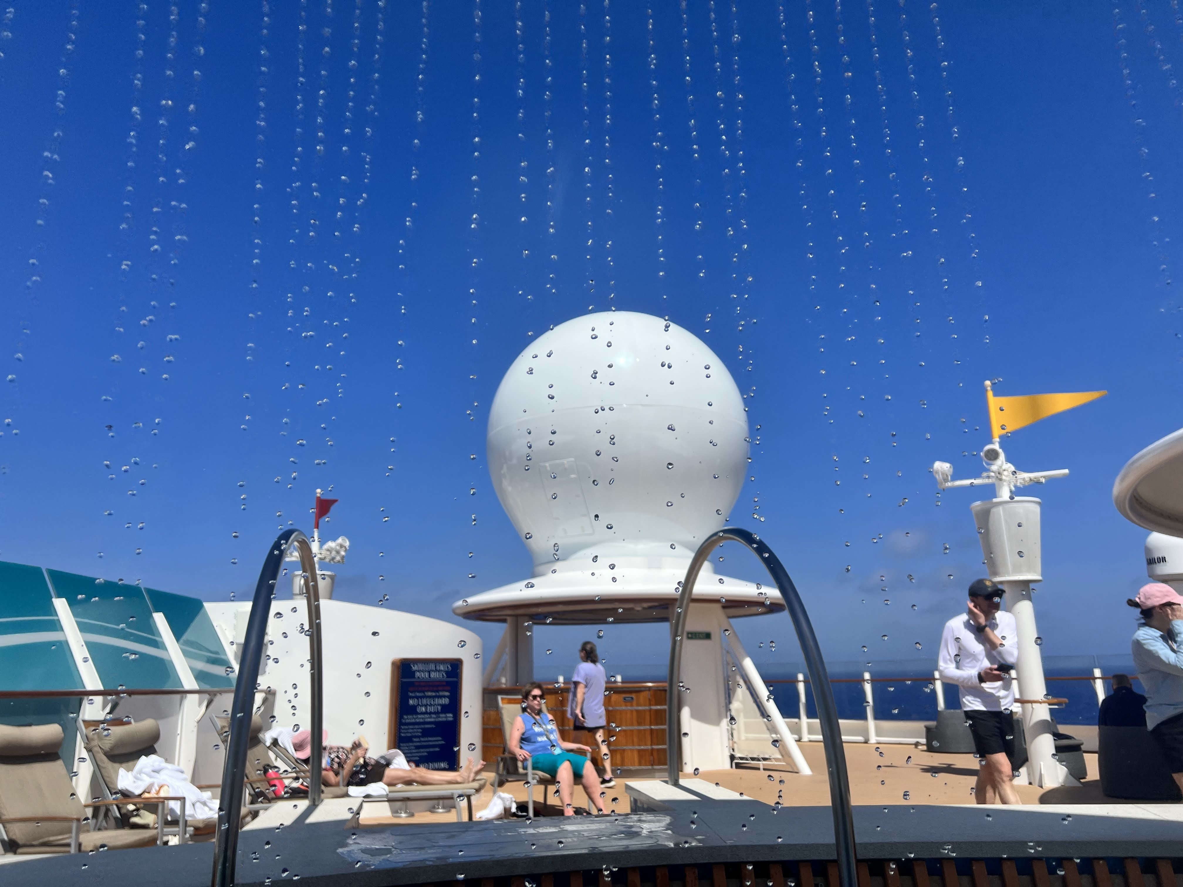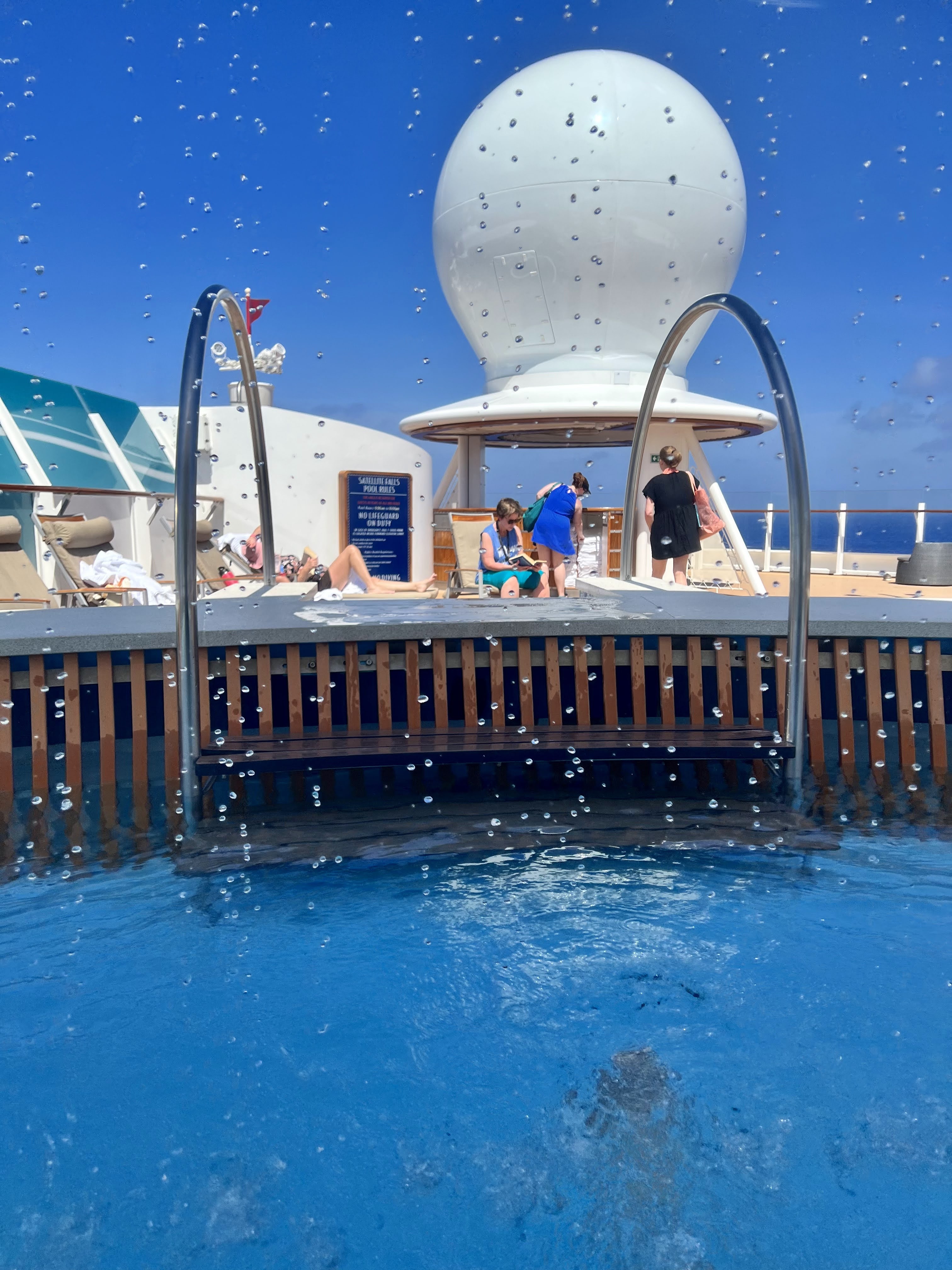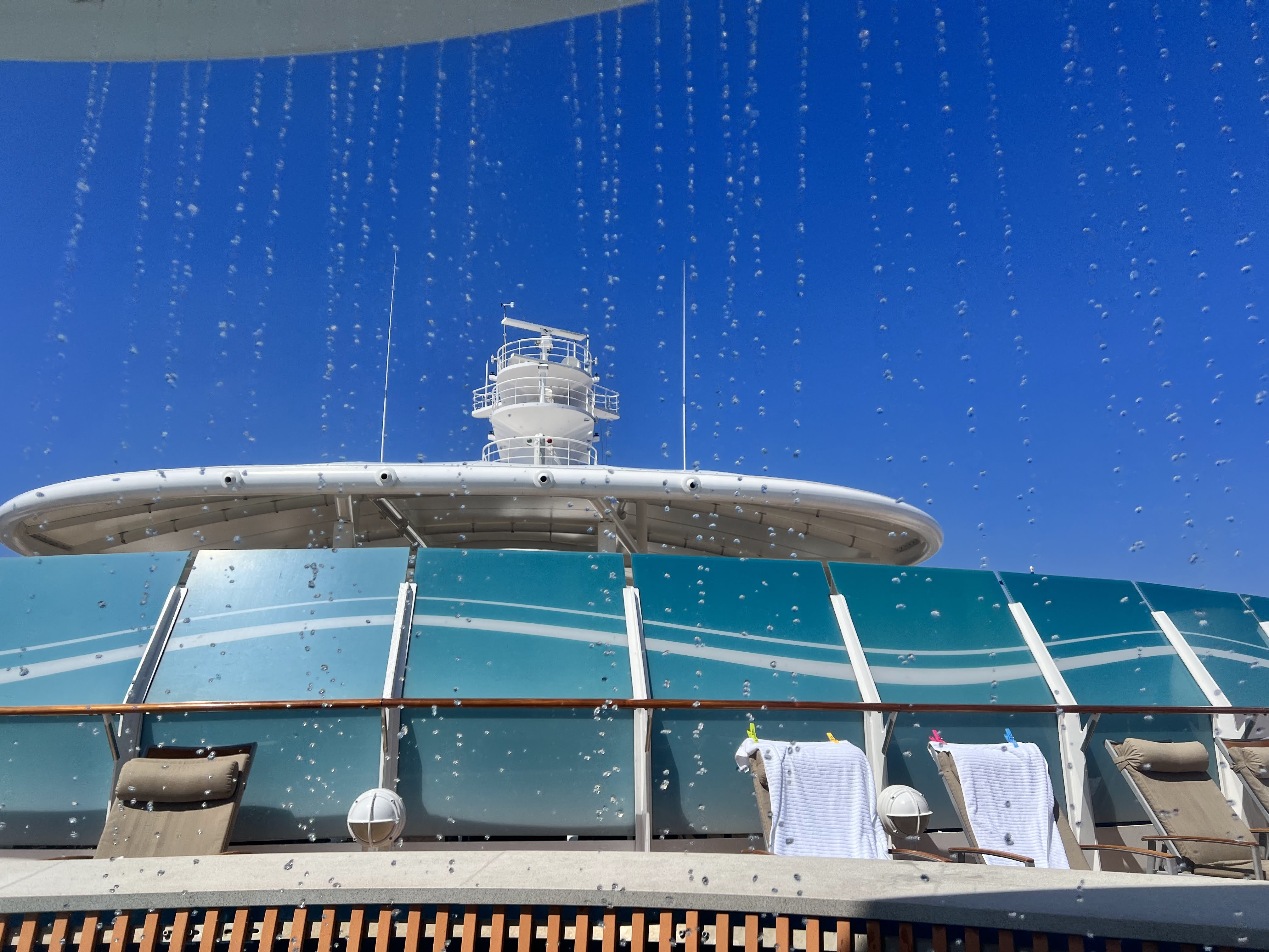 This morning we threw on some clothes and had breakfast at Royal Court. Then we went back to our room to change into our swim suits. We filled up our reusable cups and went up to deck 13 to Satellite Falls– our favorite spot on the Disney Fantasy!!! We found 3 chairs under the shade and hopped into Satellite Falls. Satellite Falls has a rain feature that you step through then you sit on the tiled lounger middle part while the water rains down on your feet. It’s so relaxing. Plus you get great views of the water.