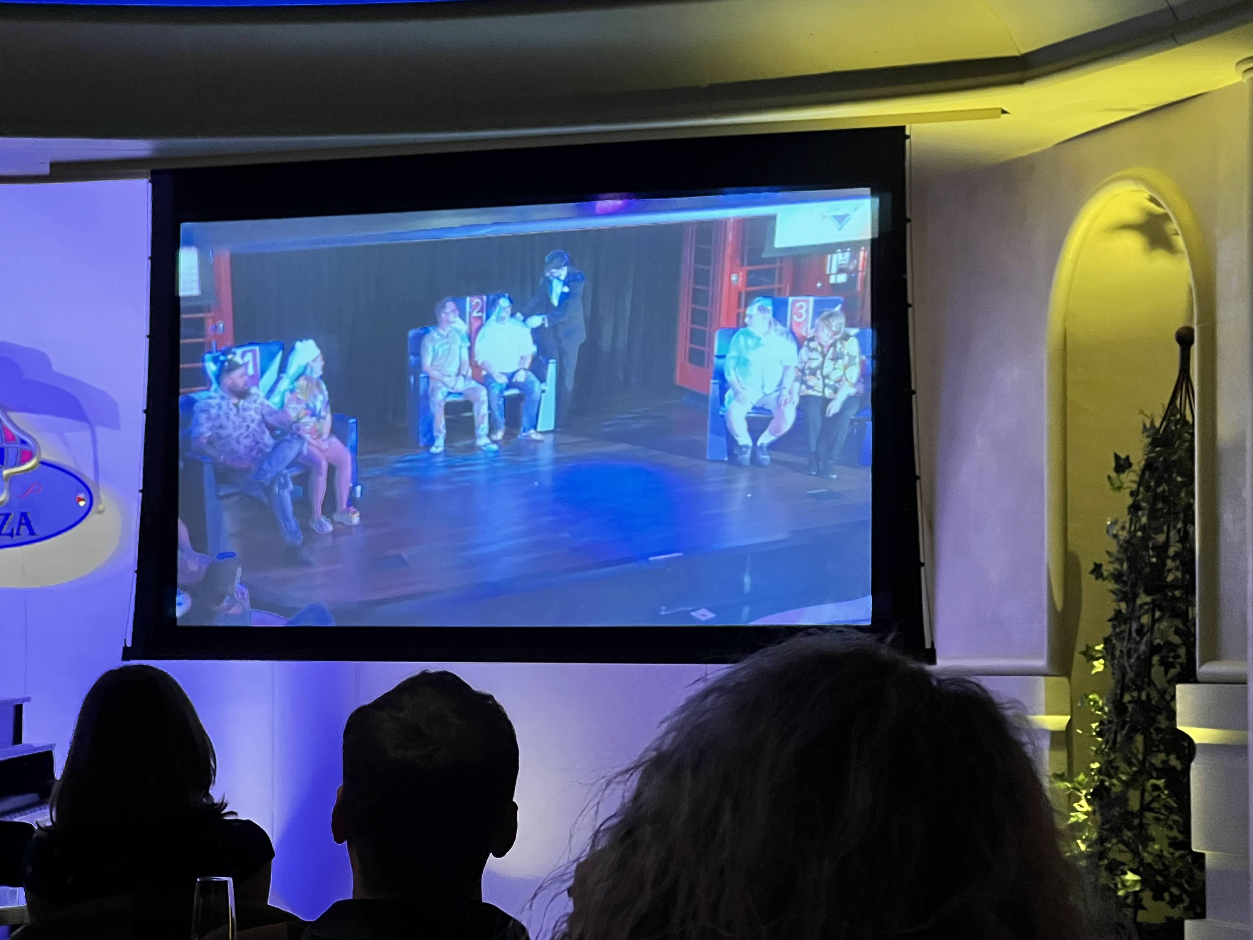 After dinner tonight was one of my favorite cruise shows- Match Your Mate. It’s like the Newlywed game. We rushed to the Tube (one of the adult bars/clubs onboard) but it was PACKED!!! The guy at the door said they would be broadcasting next door in O’Gill’s pub. We raced next door and managed to snag a table. Success!!!