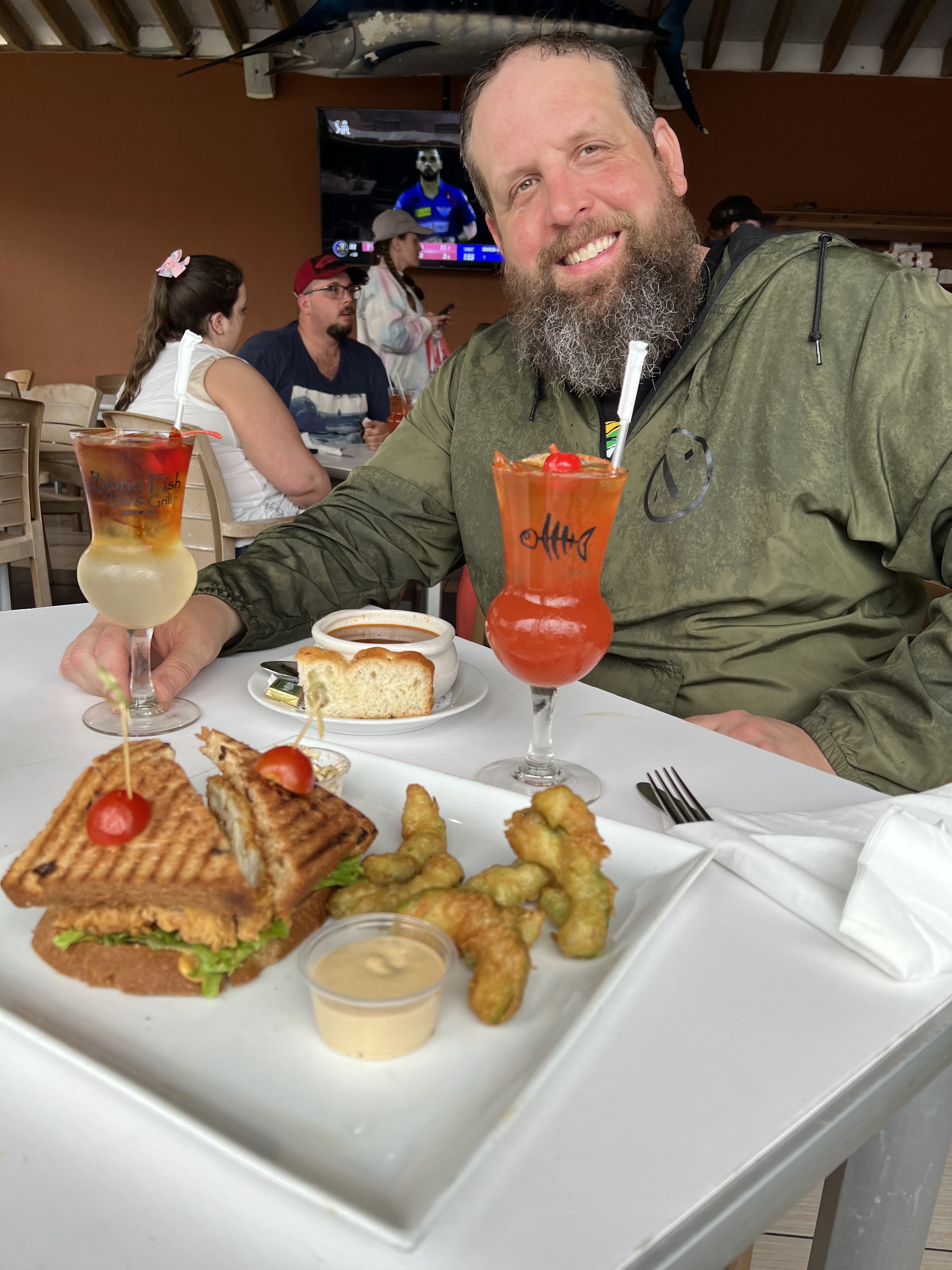 This put a damper on our plans, but MIL & CSP decided to go out walking in the downpour anyway!!! I said BYE to those maniacs and went back to our room to read and relax in my dry clothes! CSP & MIL were hell bent on finding one of Bermuda’s famous fried fish on raisin bread (!!!) sandwiches! So they set out to locate one. That sandwich would have to be fed to me by Harry Styles himself for me to brave that rain! Ha! But! They found one!!! And they reported back that it was delightful!