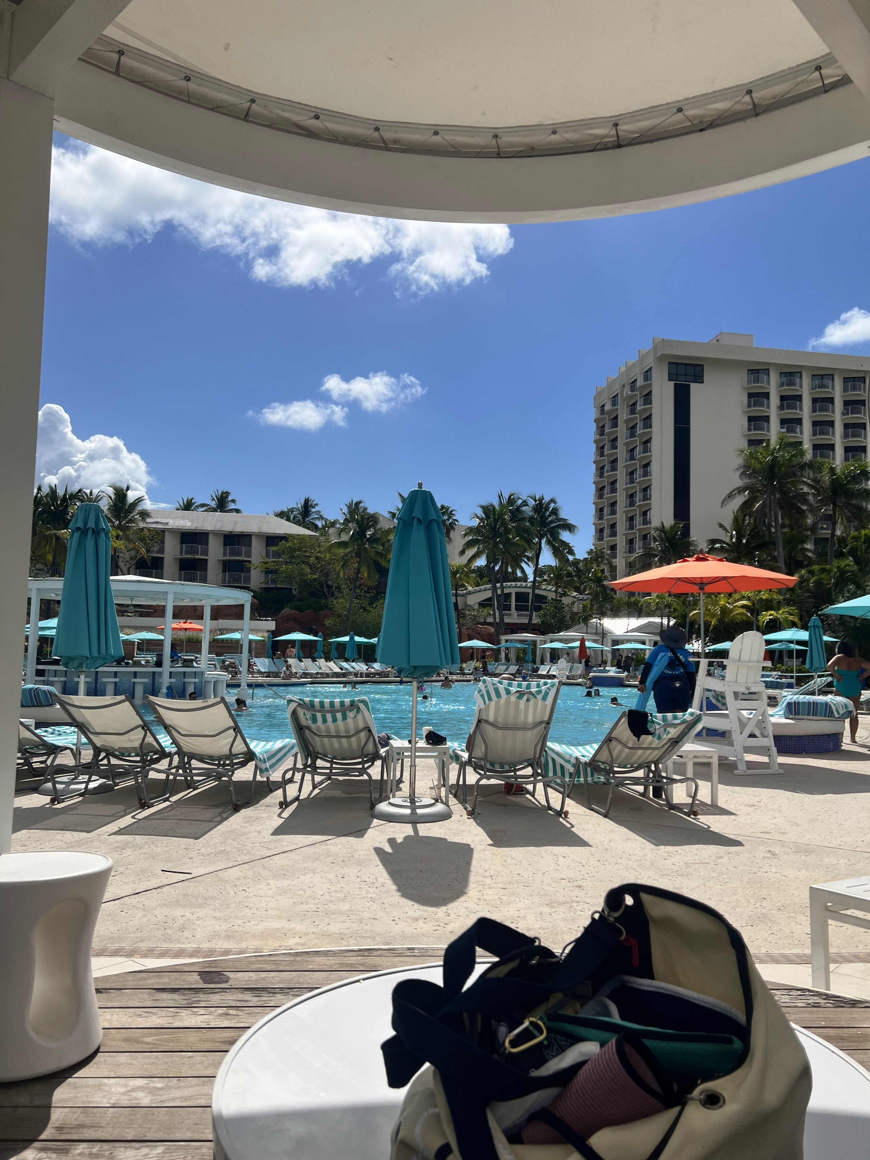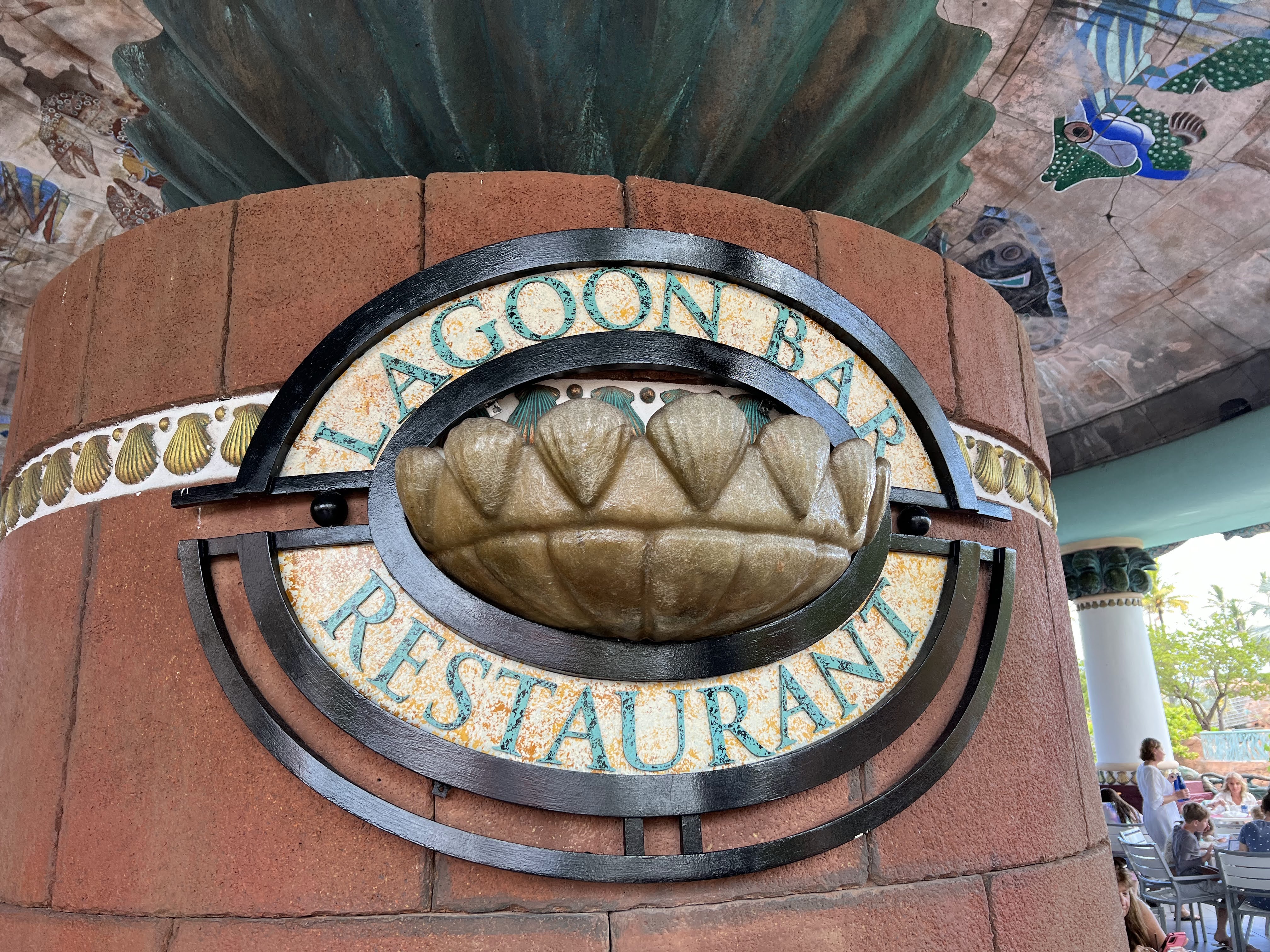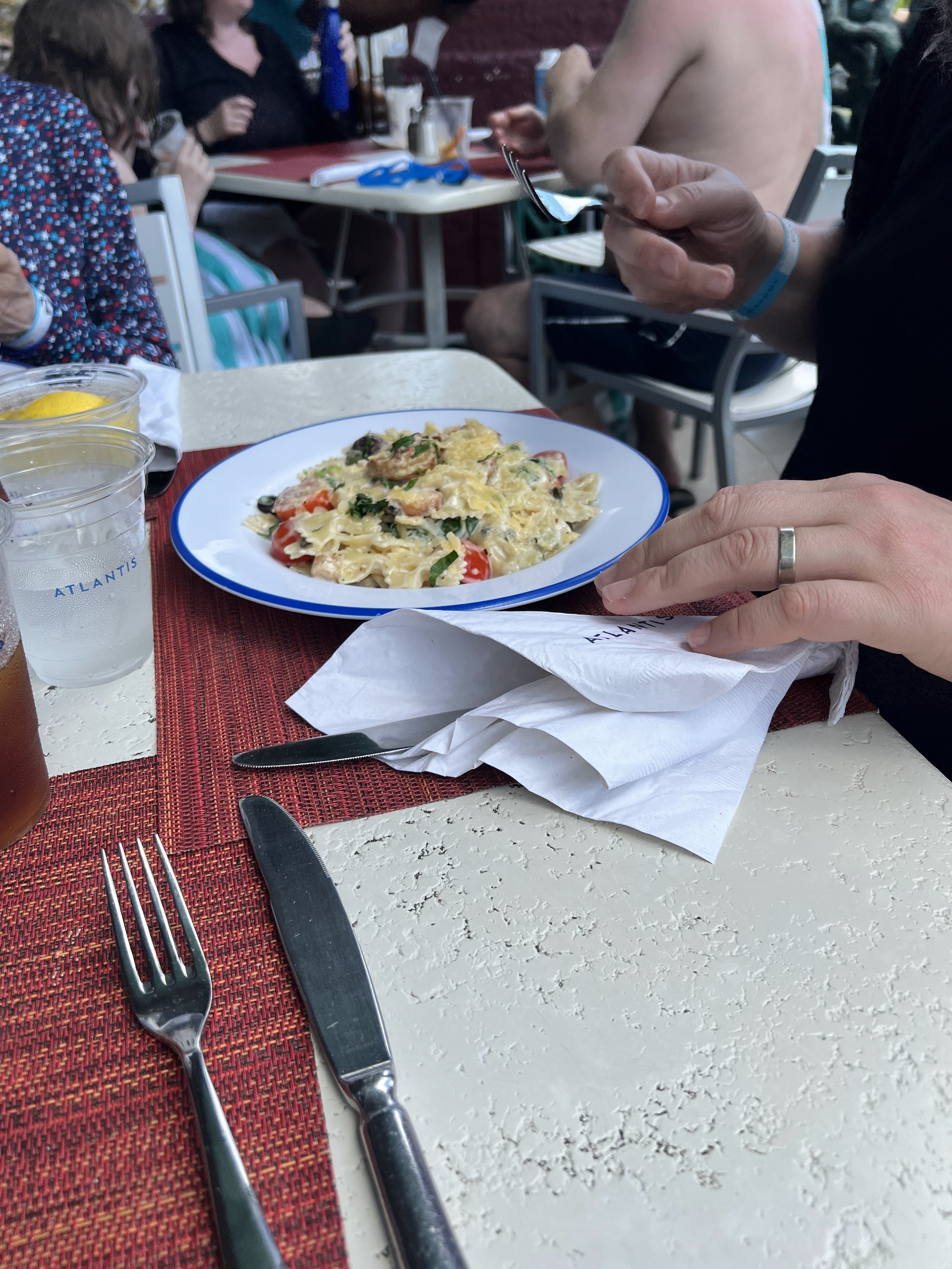 CSP & I jumped in the pool as soon as we got covered in SPF. We swam and chilled in whatever shade we could find. It was a beautiful day today! It was about 82* and partly cloudy. Around noon we got hungry for lunch so we walked over a small bridge to the Lagoon Bar & Grill. It’s an all fresco restaurant with an open kitchen. V cool.