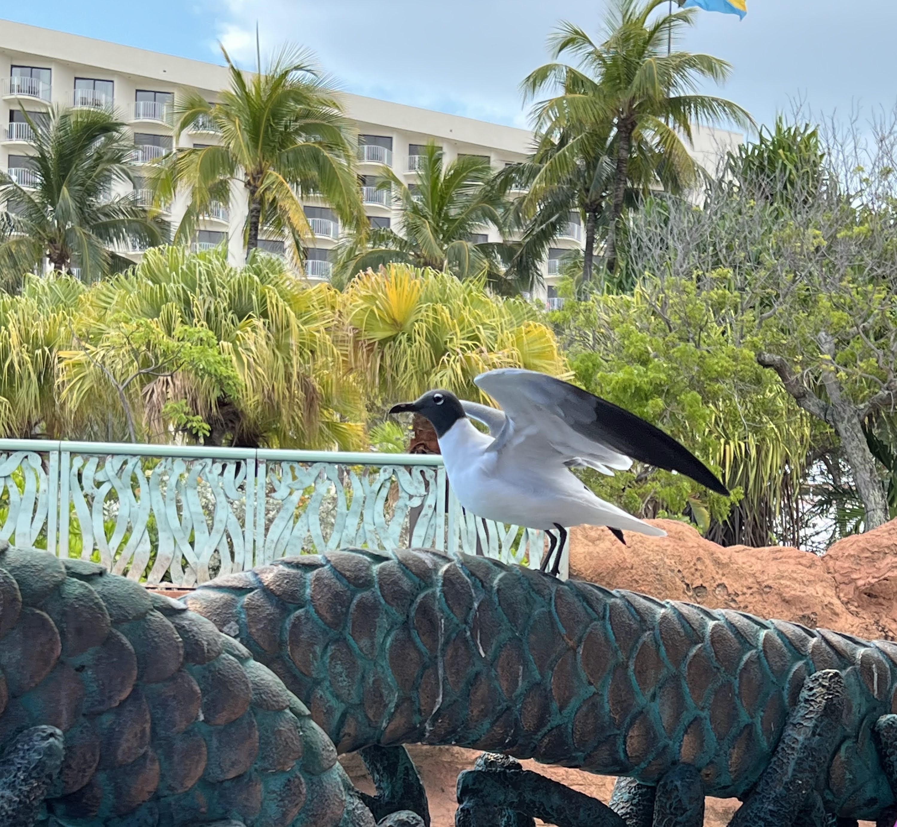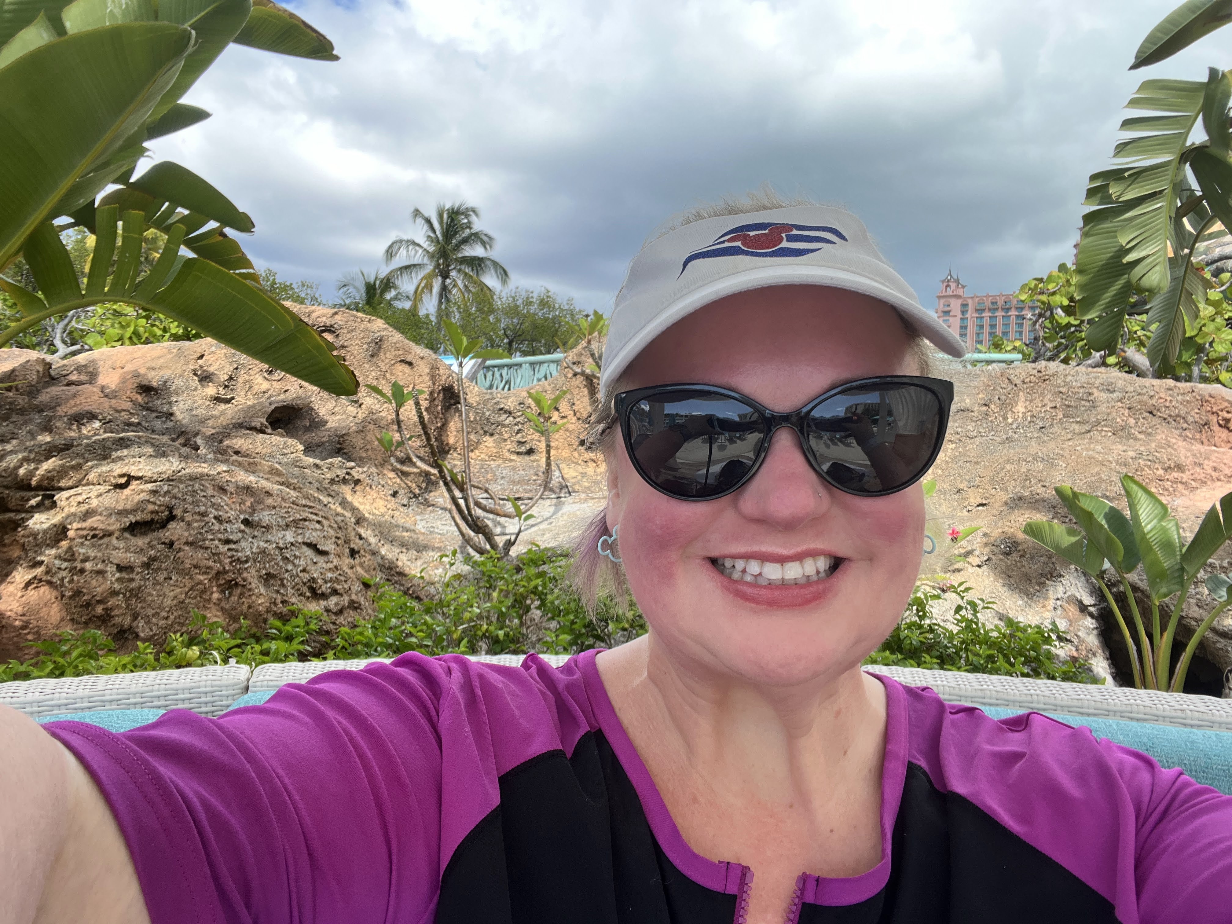 45 minutes after this photo ^^^ was taken, MIL appeared back at the cabana sans CSP, BUT with CSP’s slides (his Crocs sandals). Apparently MIL had waited for a while where CSP had gotten into the raging river (at the calm spot of the river, before the rapids). But CSP didn’t return so she came back to the cabana in a panic looking for him. At this point it’s 3pm. We had to leave by 3:45 pm to make it back to the ship on time (taxi ride plus a long walk to the pier). I said he’d show up at the cabana at some point, but she was worried because since CSP was in the water he didn’t have his phone, a watch, or any way to tell time. I went to the restroom on the other side of the Coral Pool. By the time I got back to the cabana MIL was pacing with a worried look on her face and she had corralled 2 Atlantis employees (one of which was Brickell our cabana host). Brickell told me they don’t have a PA system so there was no way of calling for CSP. At this point MIL was worried we were going to have to leave CSP at Atlantis to make it back to the ship on time. No sense in all of us being stranded in Nassau! Ha! But then he appeared (like I knew he would). He walked up and said to MIL- why did you take my shoes?? It was a HOT walk back on that pavement! LOL