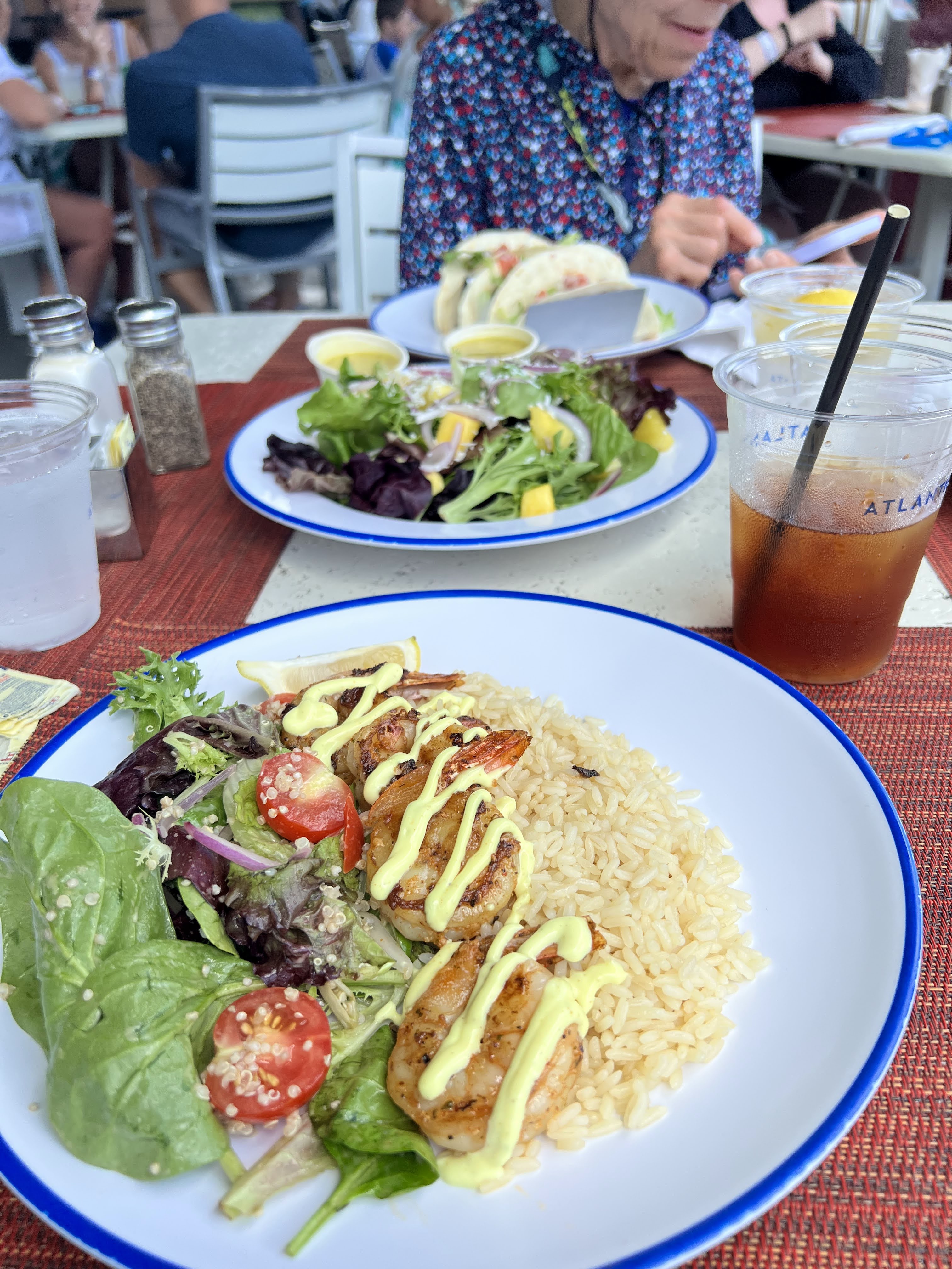 Lunch was really good! I had shrimp with rice pilaf and salad (although the lettuce got hot being smushed up against the hot food and y’all know I HATE hot lettuce). We got a tropical salad for the table and MIL had cobia fish tacos.