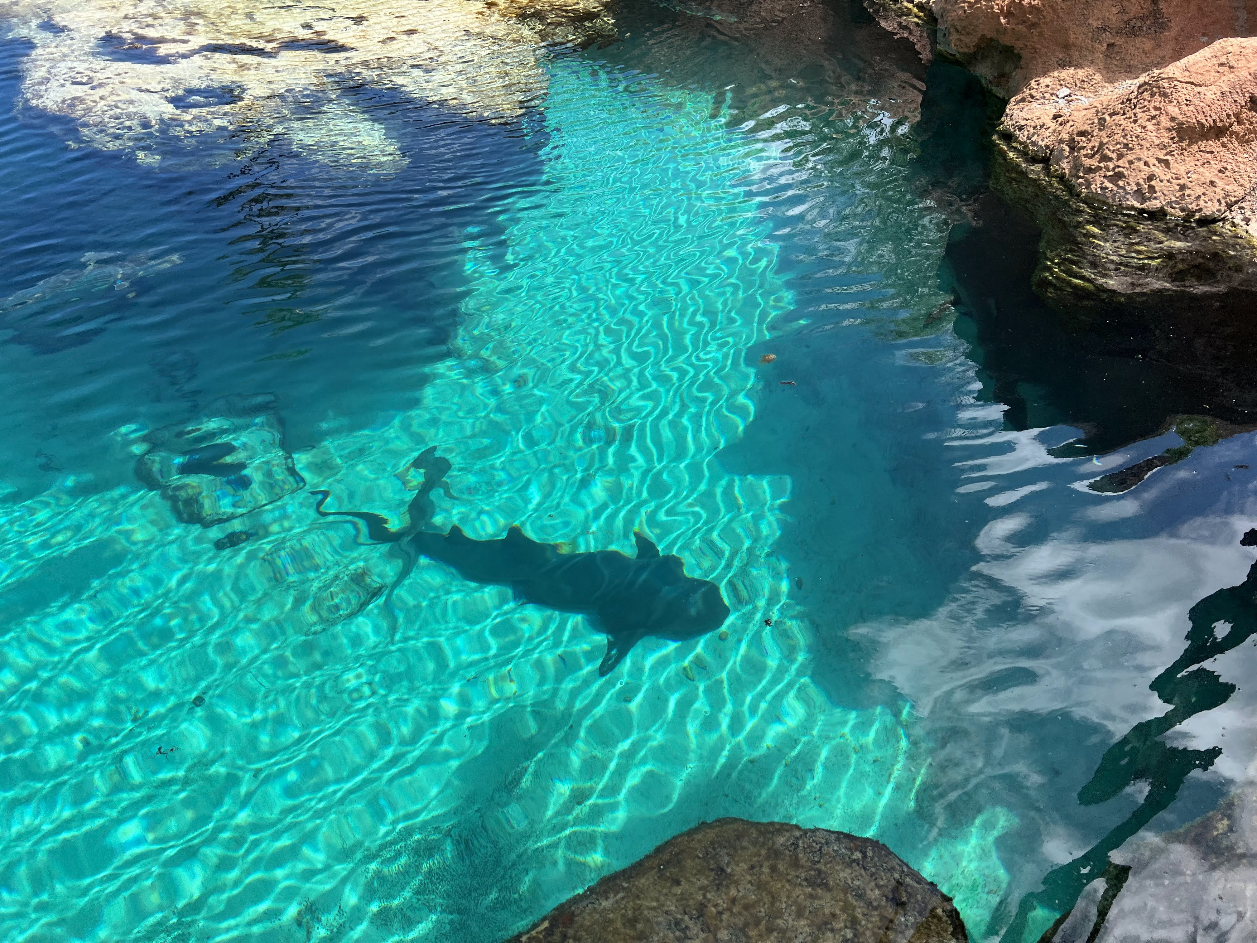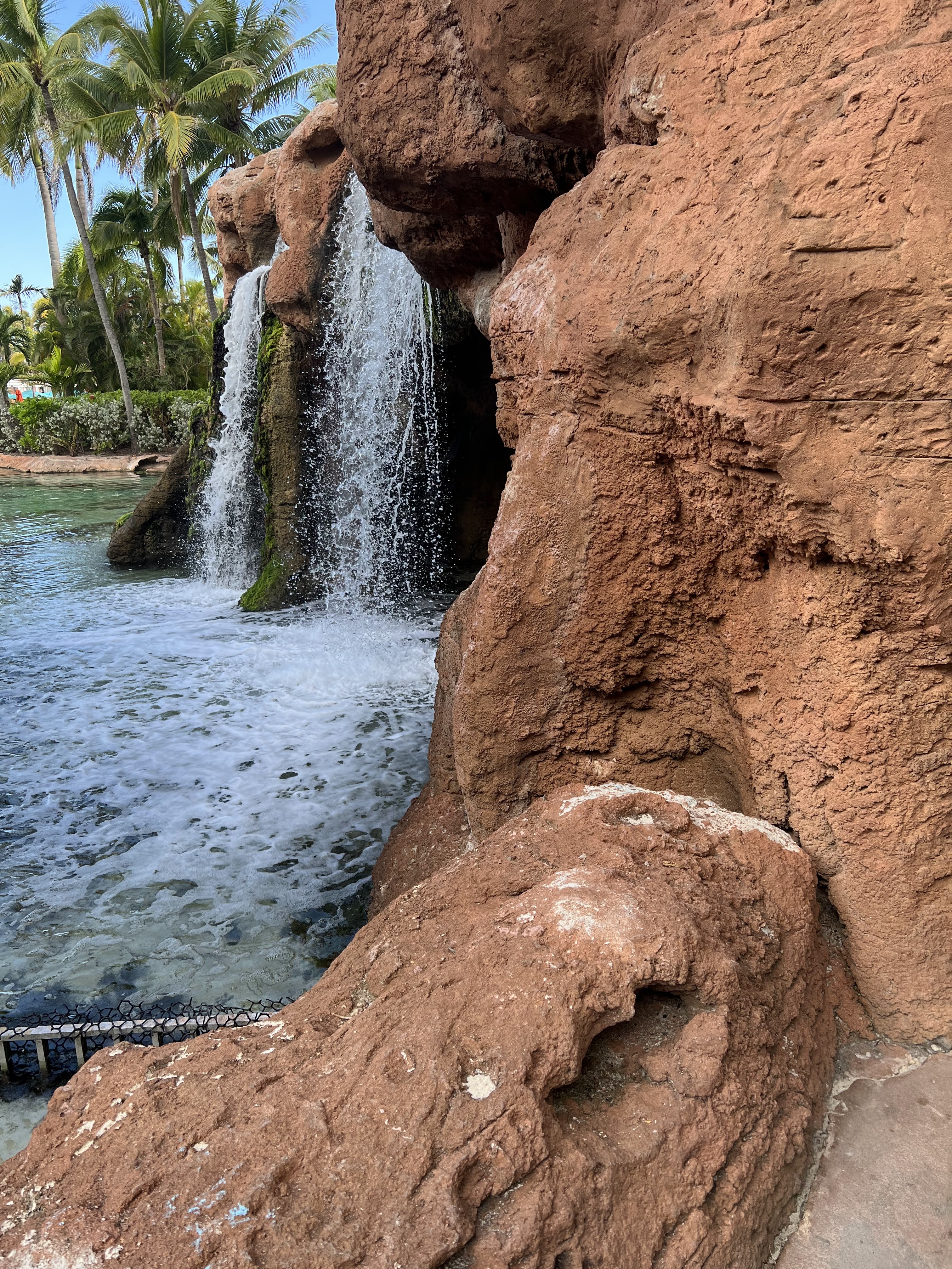 We got to Atlantis and once we figured out where to go to get our wristbands we made our way out to the water area and walked under this waterfall to our assigned pool cabana. It was kinda stinky in the grotto tbh.