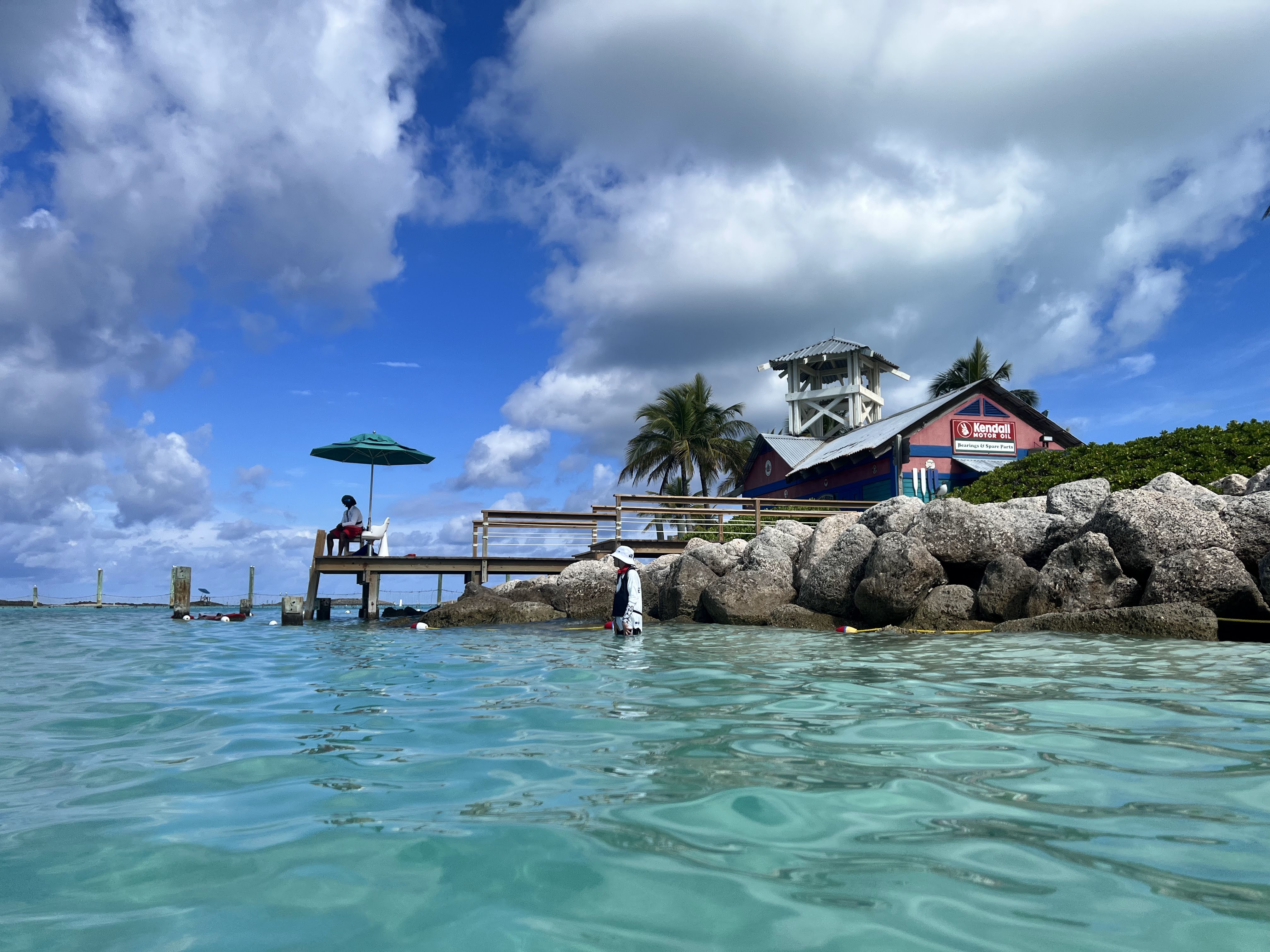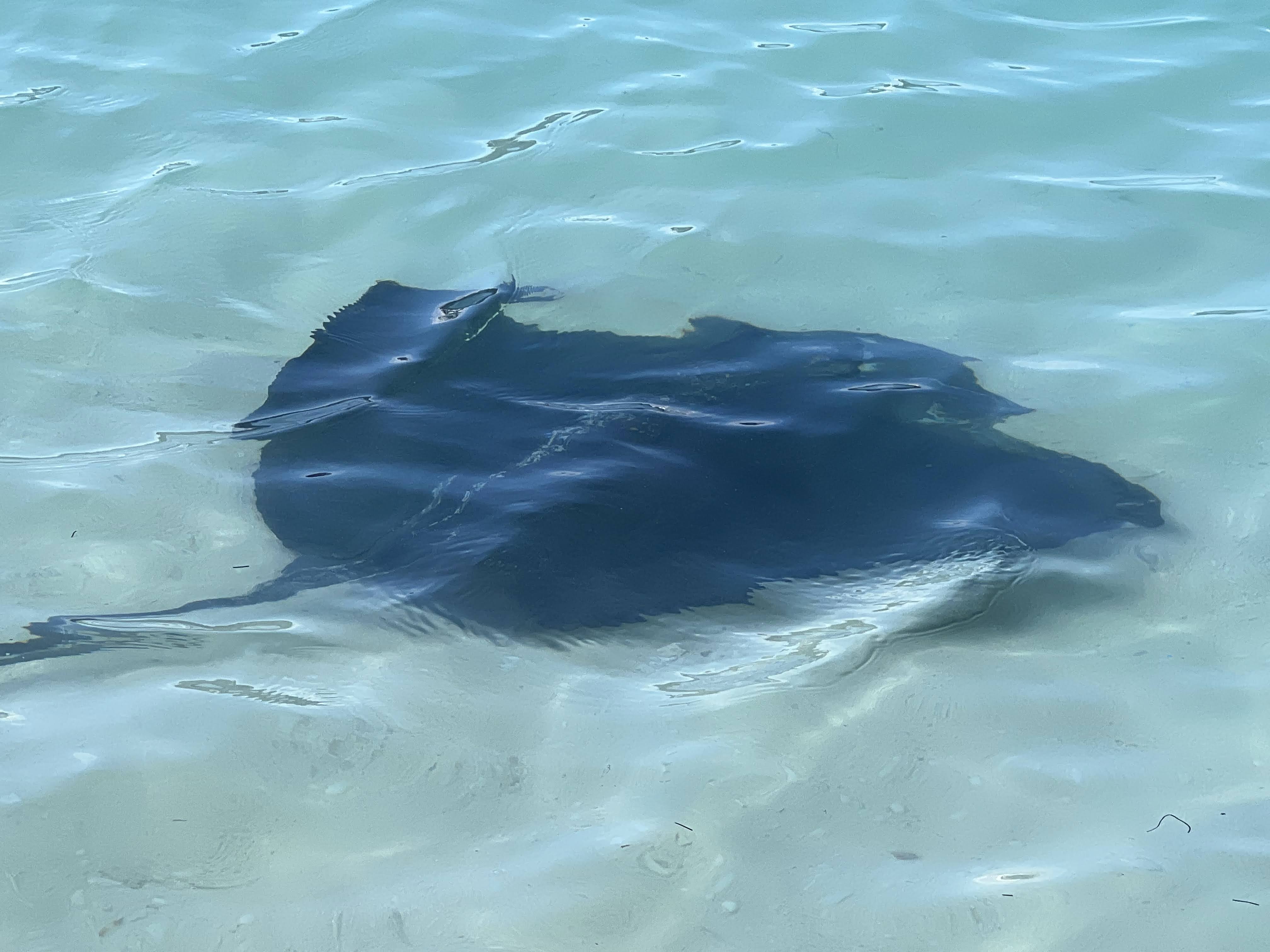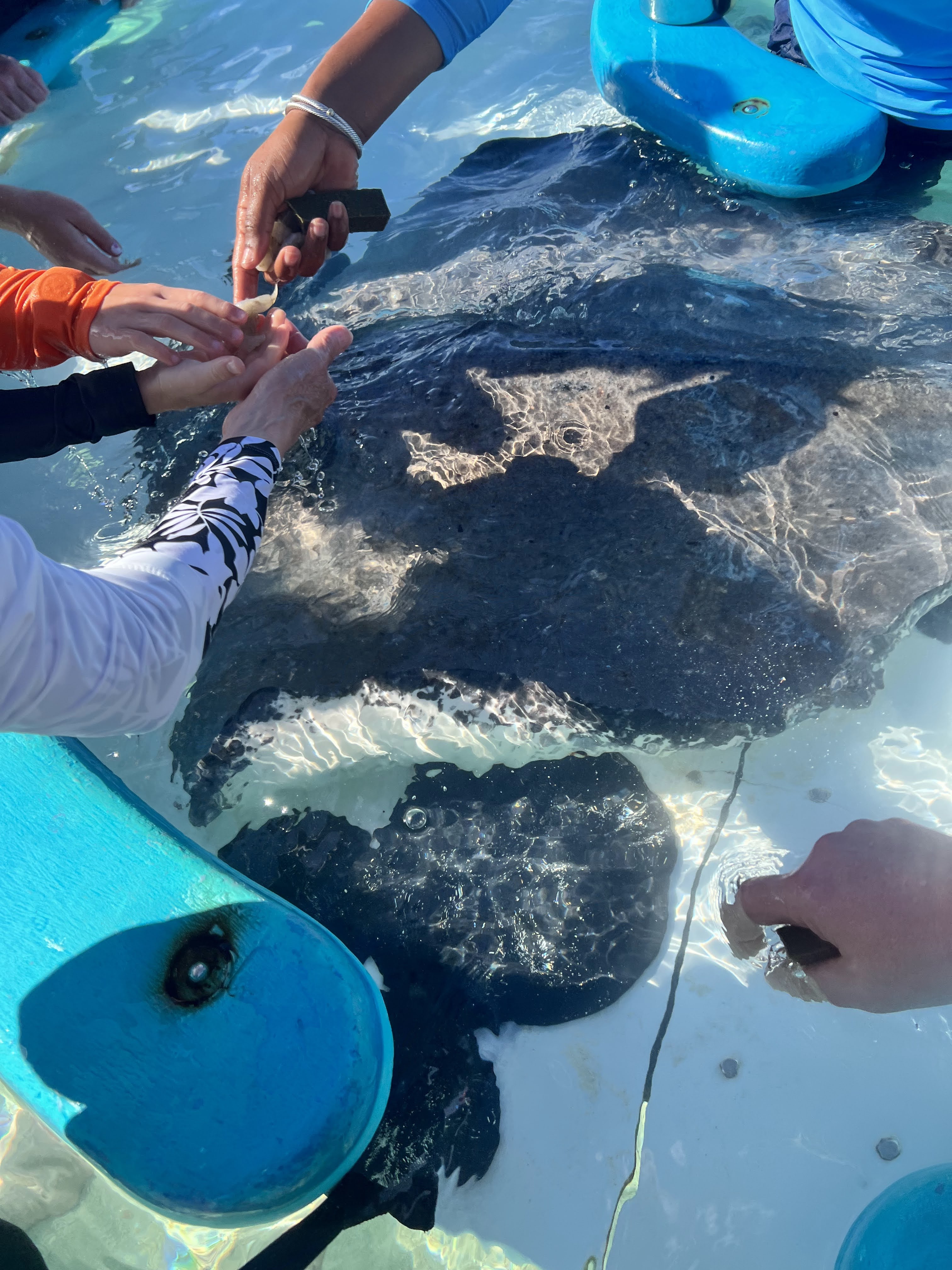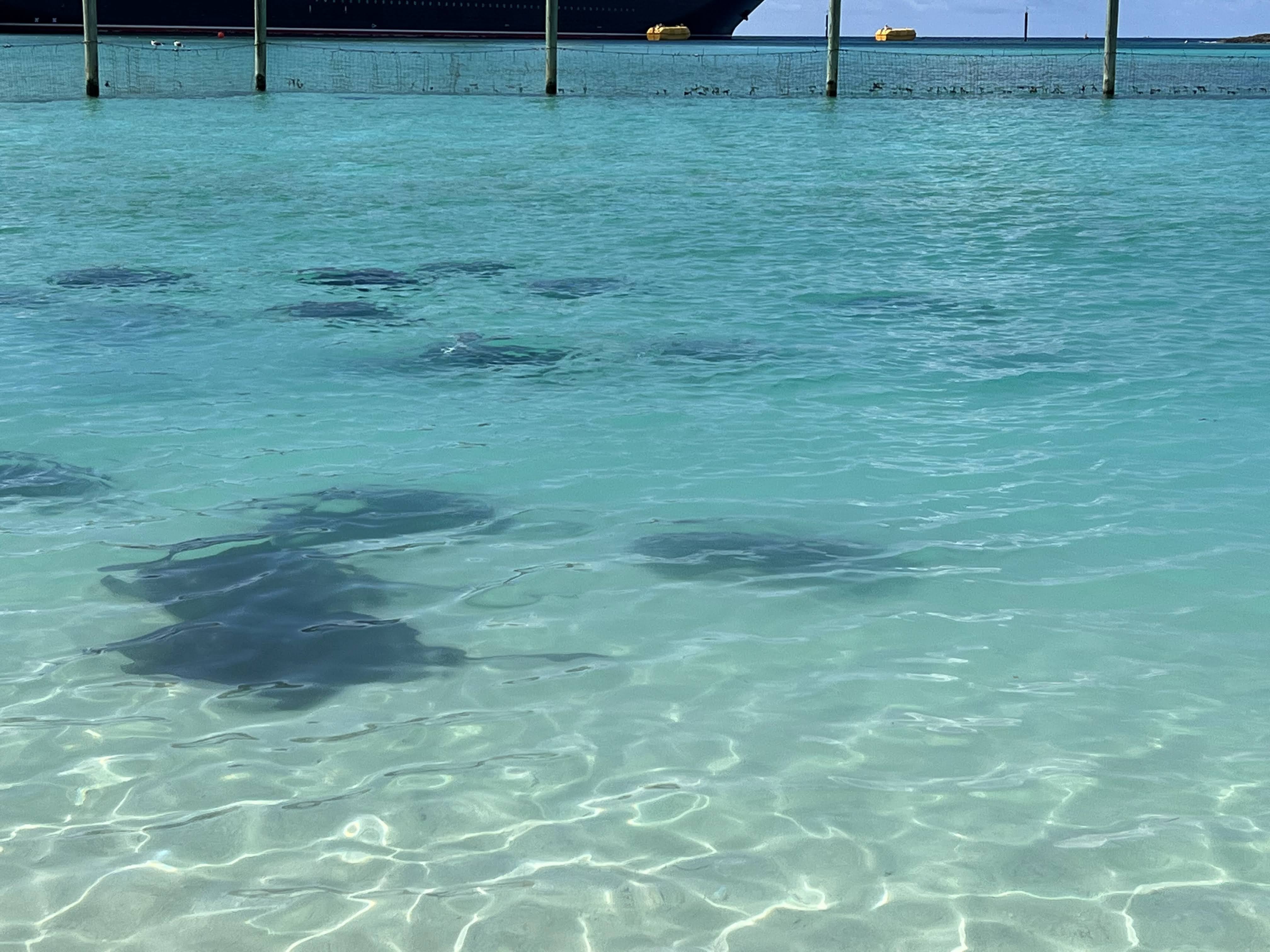 We had a surprise excursion booked for 9 am on the island so we woke up early and ate breakfast at Cabanas buffet. Then we debarked and took the tram to the stingray hut. Today we’re feeding and swimming with stingrays! This was another birthday surprise for MIL as she’s never interacted with stingrays before!