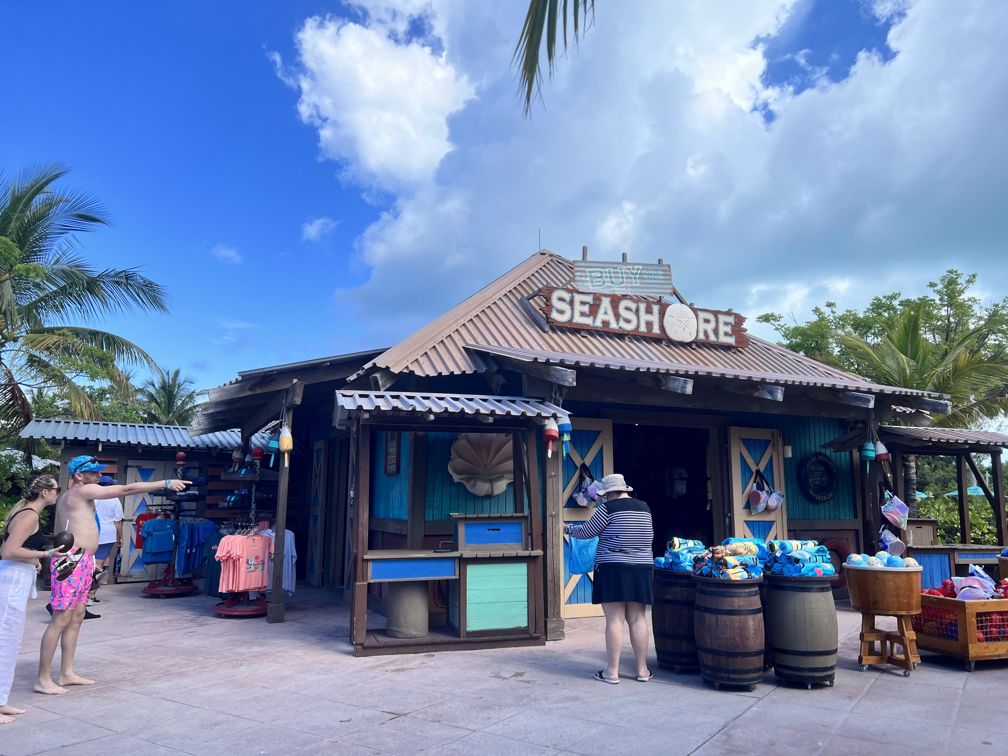 Toward the entrance of the family beach is a gift shop and some drink kiosks.