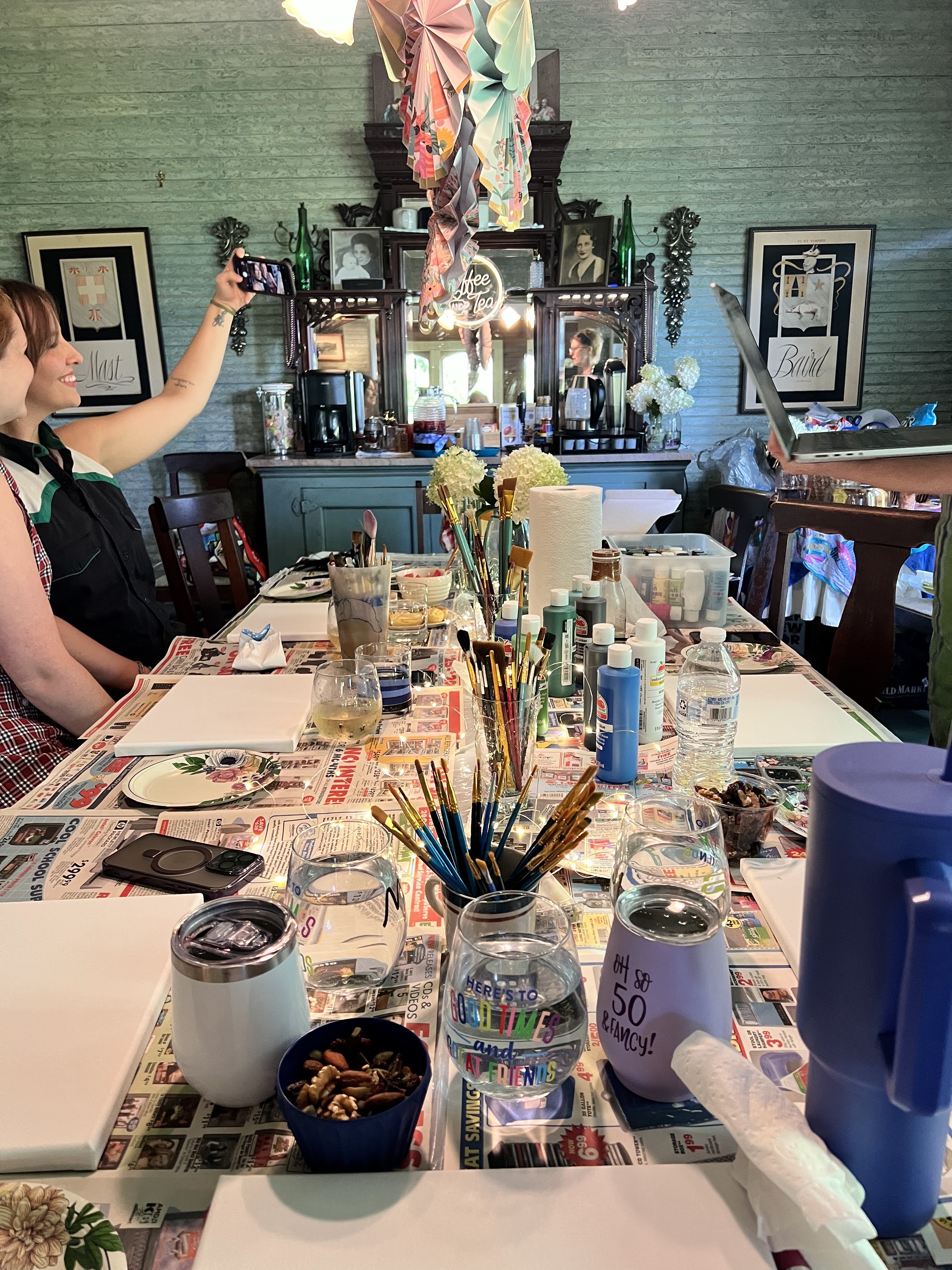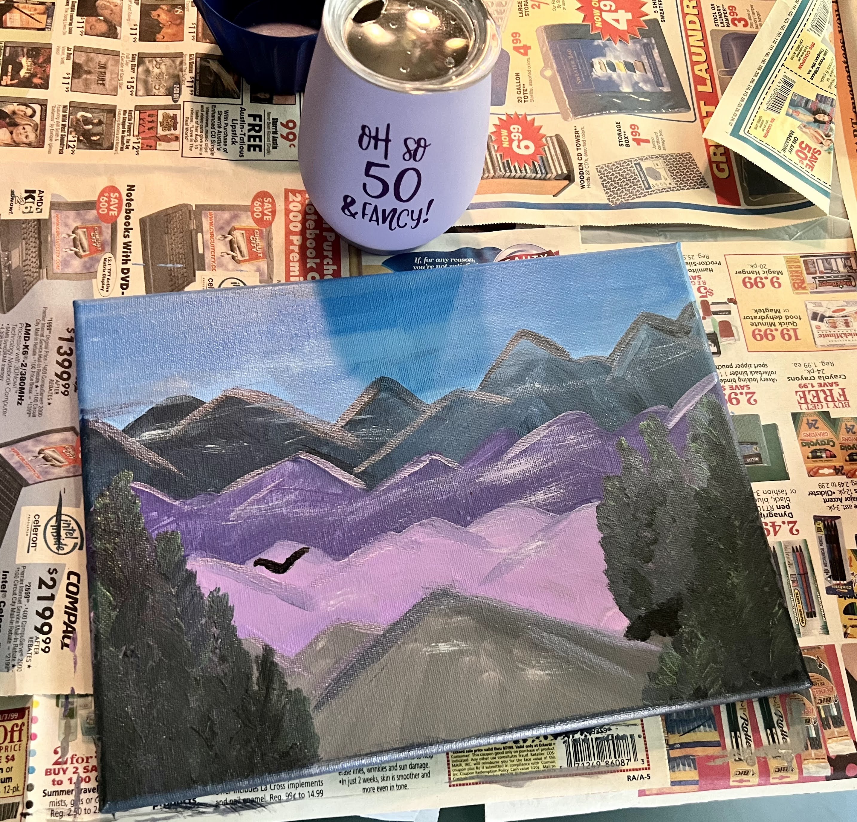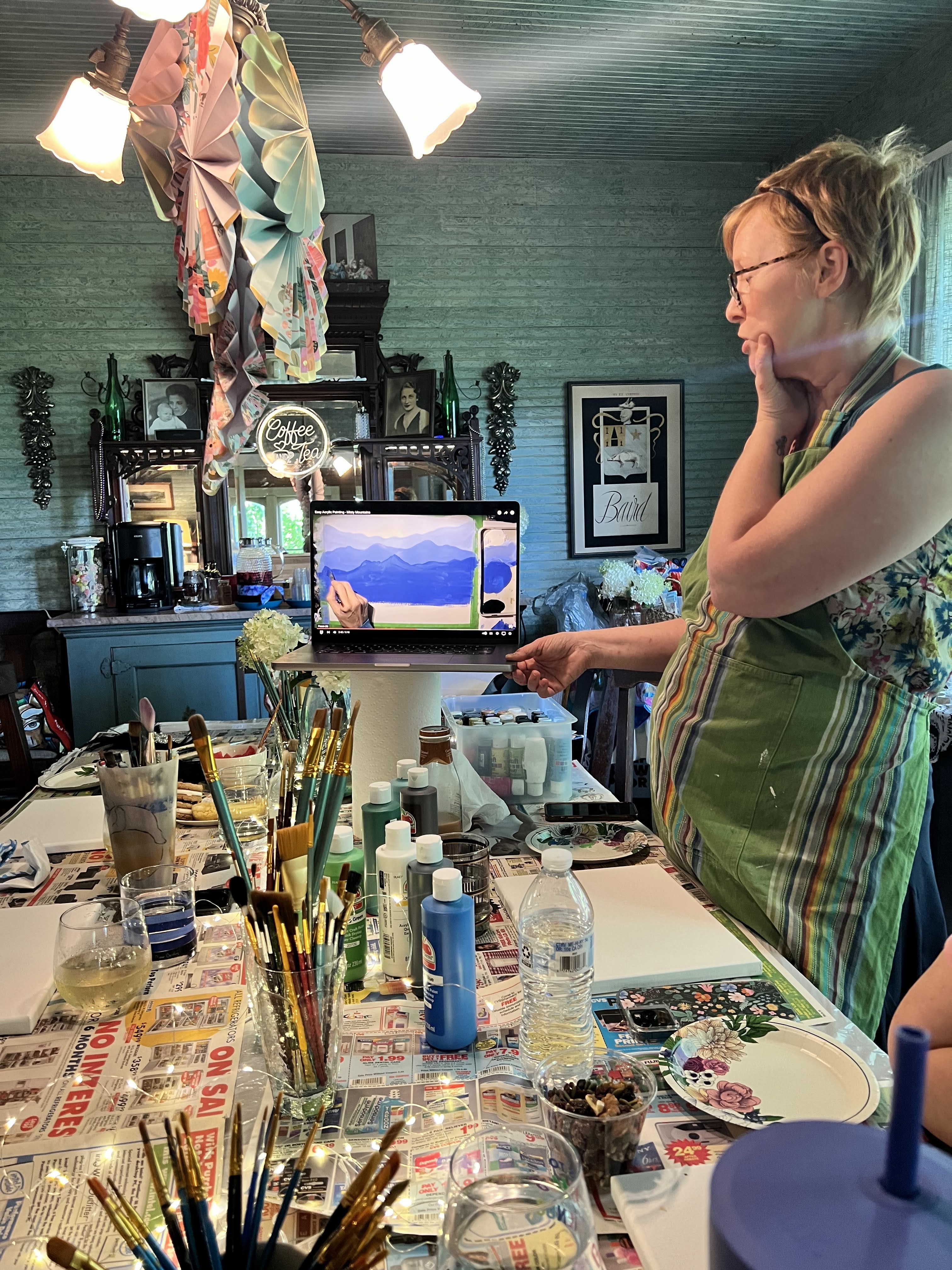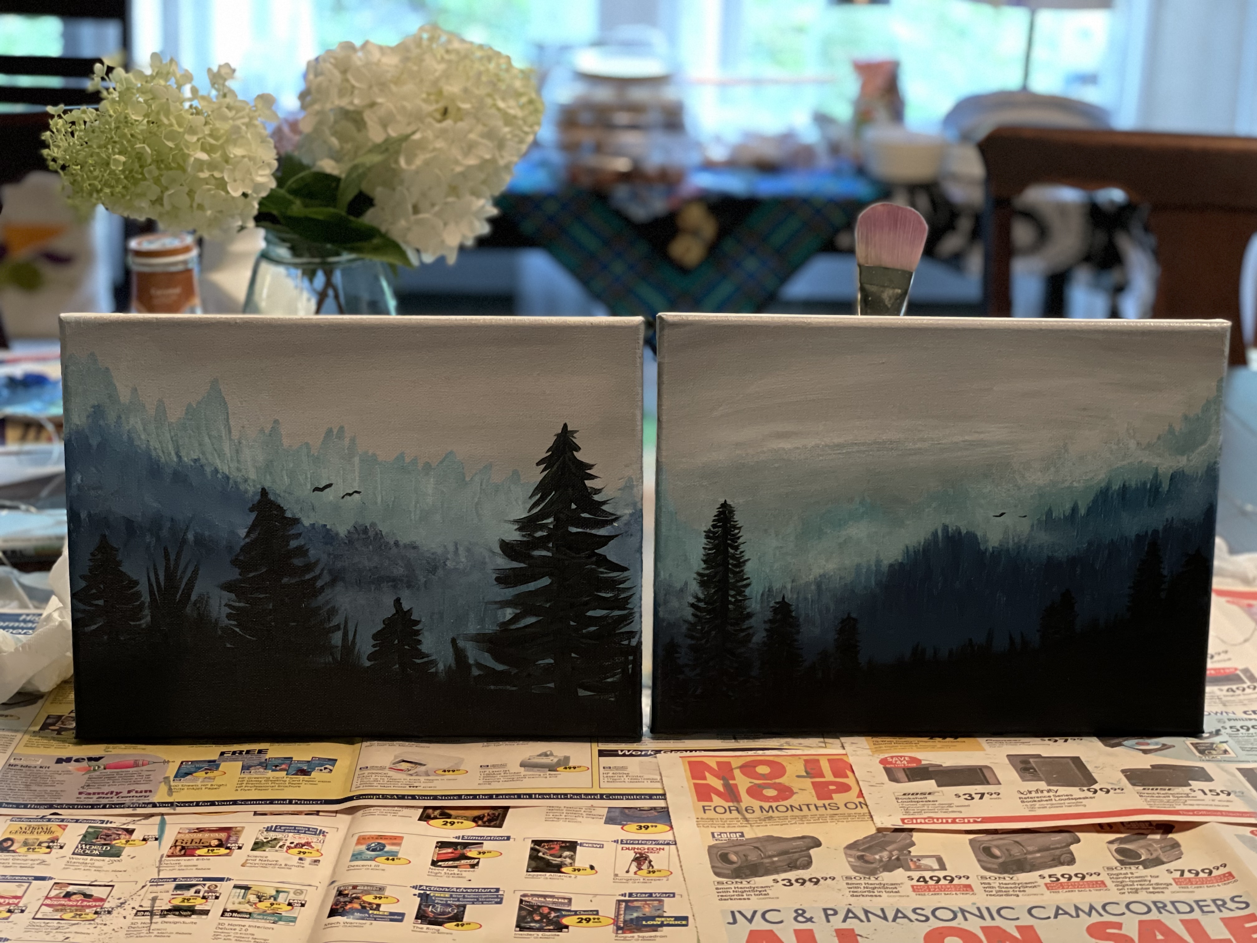 Sara & the girls turned the dining room into our own Paint & Sip!!! Paints, brushes, water cups, and canvases for us all! Sara pulled up a tutorial of a mountain scene on YouTube.