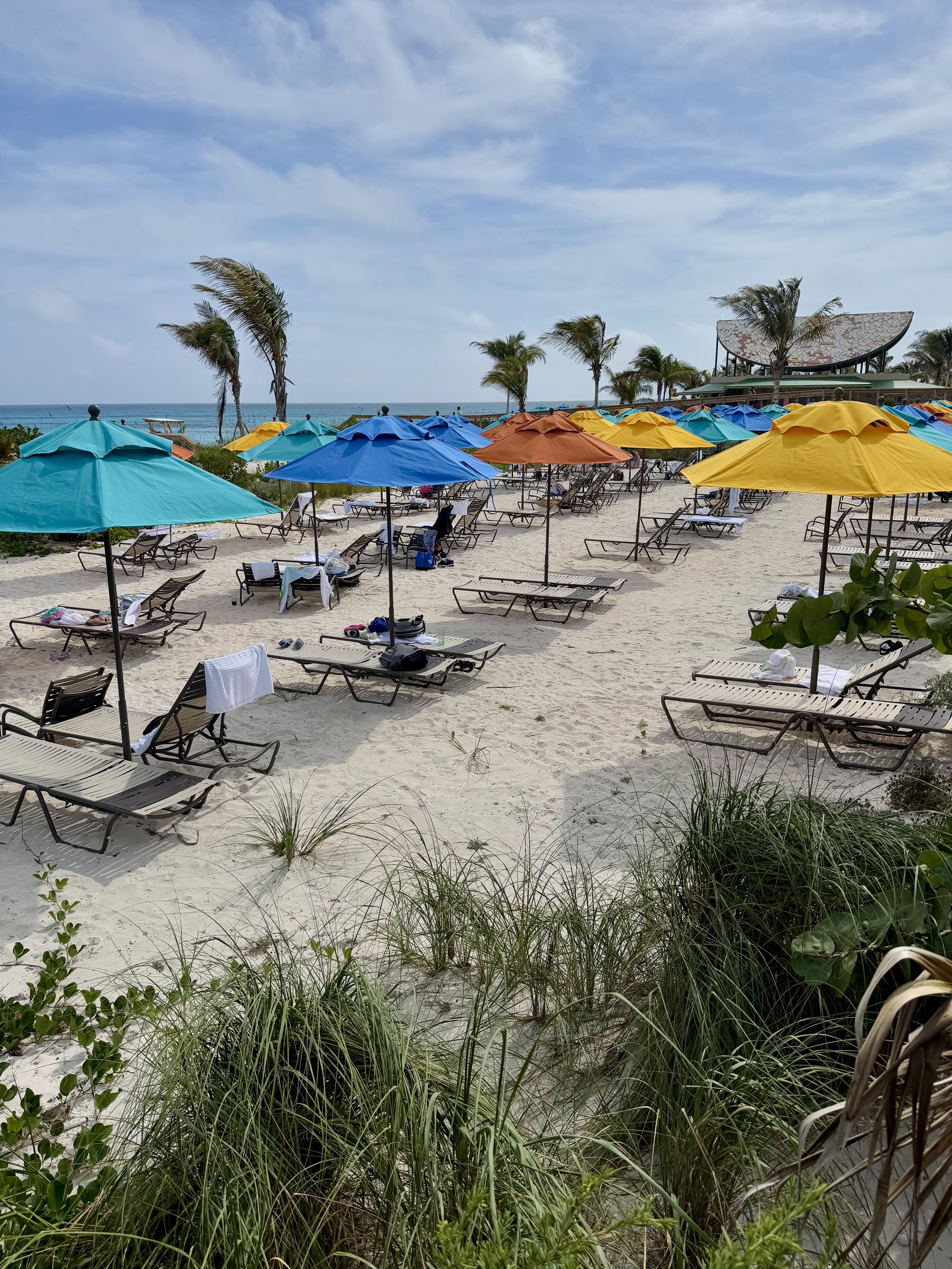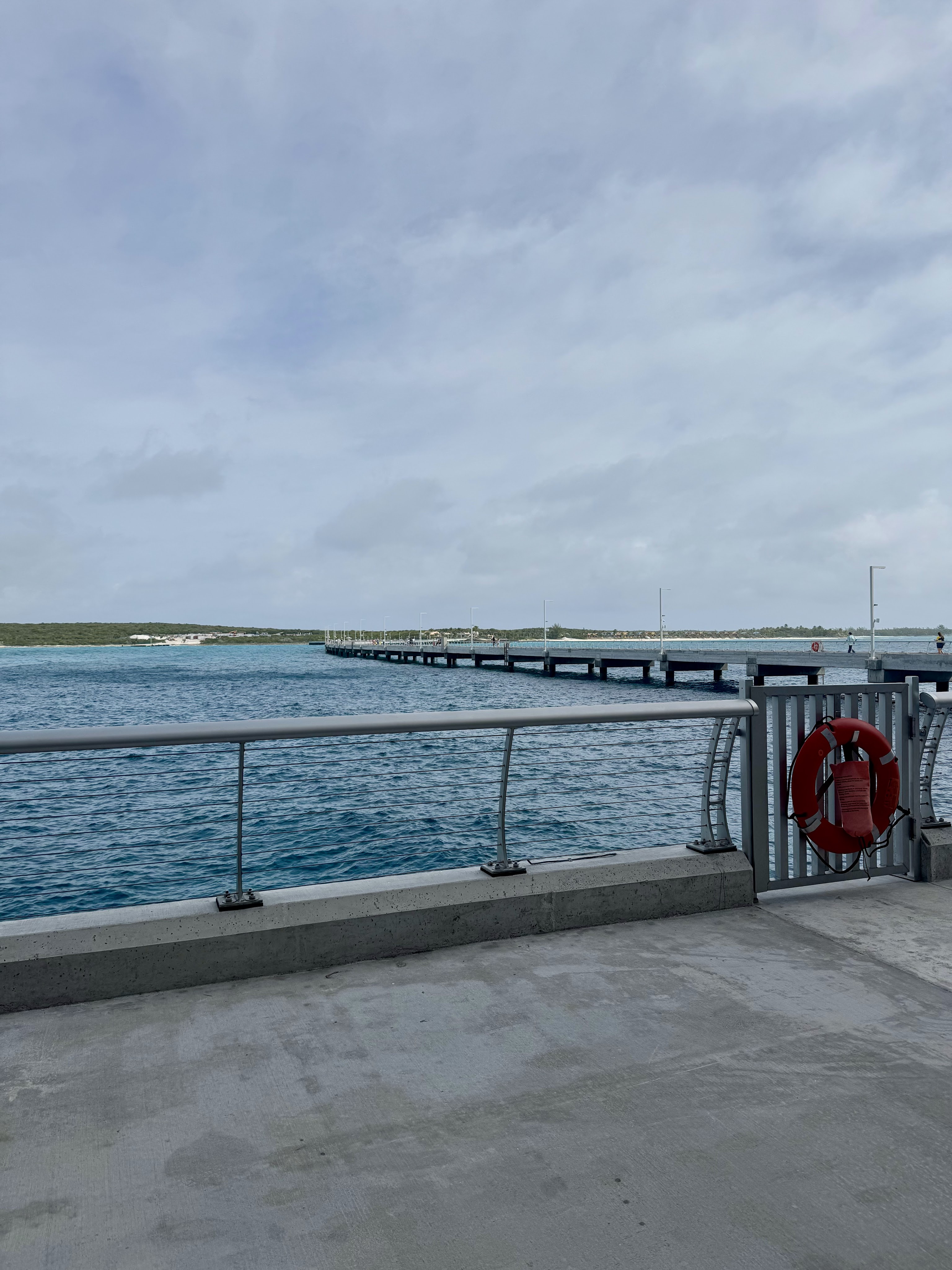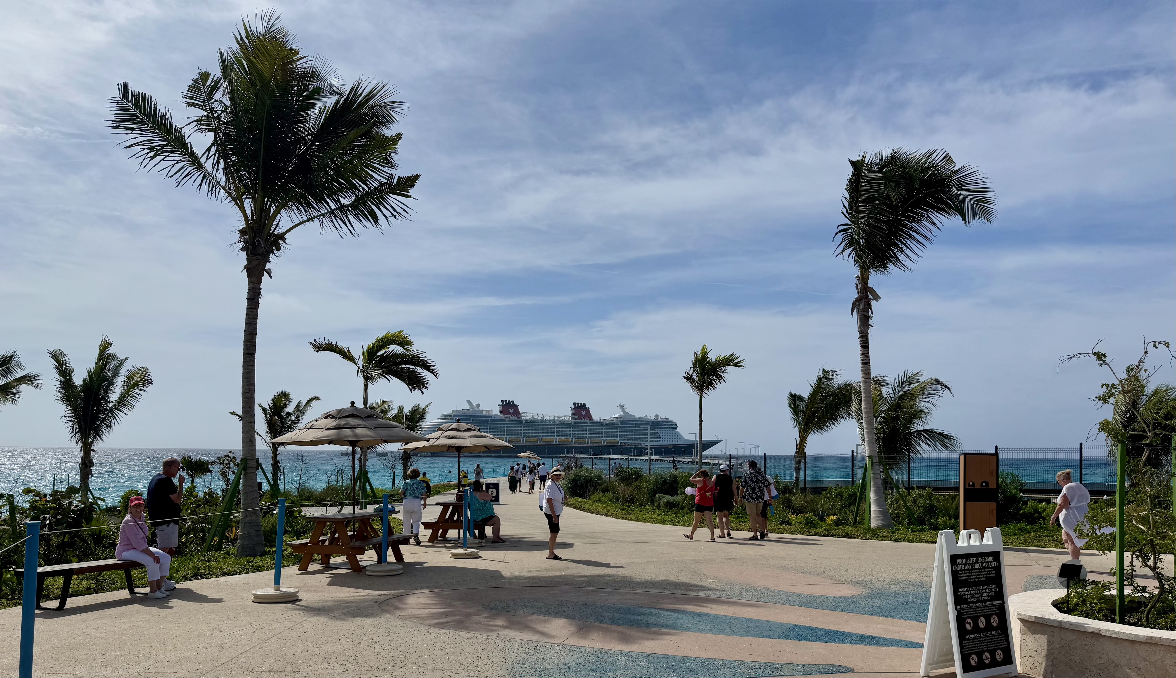 We disembarked and took in the sight of the pier from the ship to the island. YIKES. It’s a half mile long with no shade or benches. There is one water station. Not that much of a problem in late January, but imagine walking back to the ship in July with small, tired, HOT children in tow. Again, I say YIKES. Do better Disney!