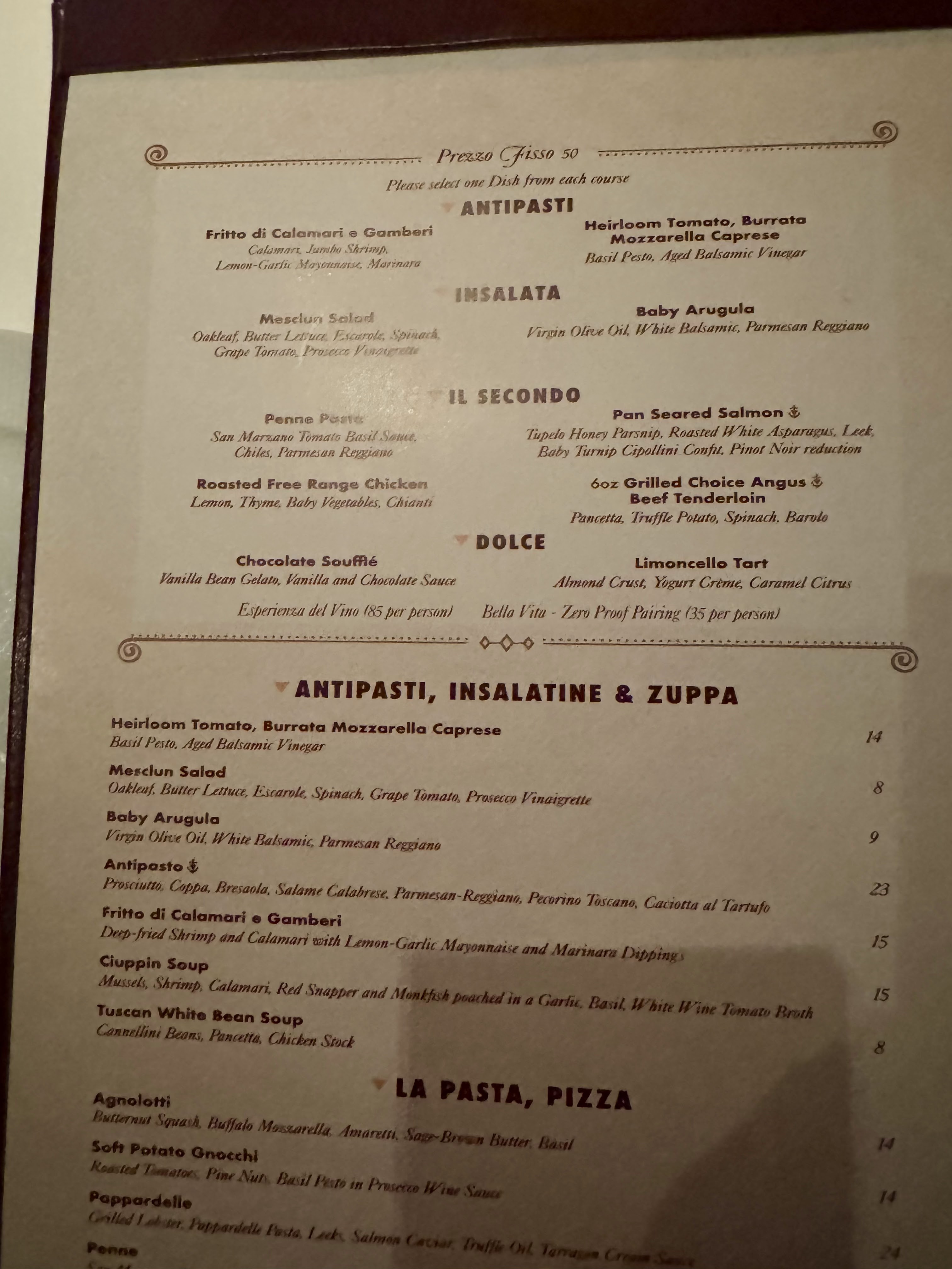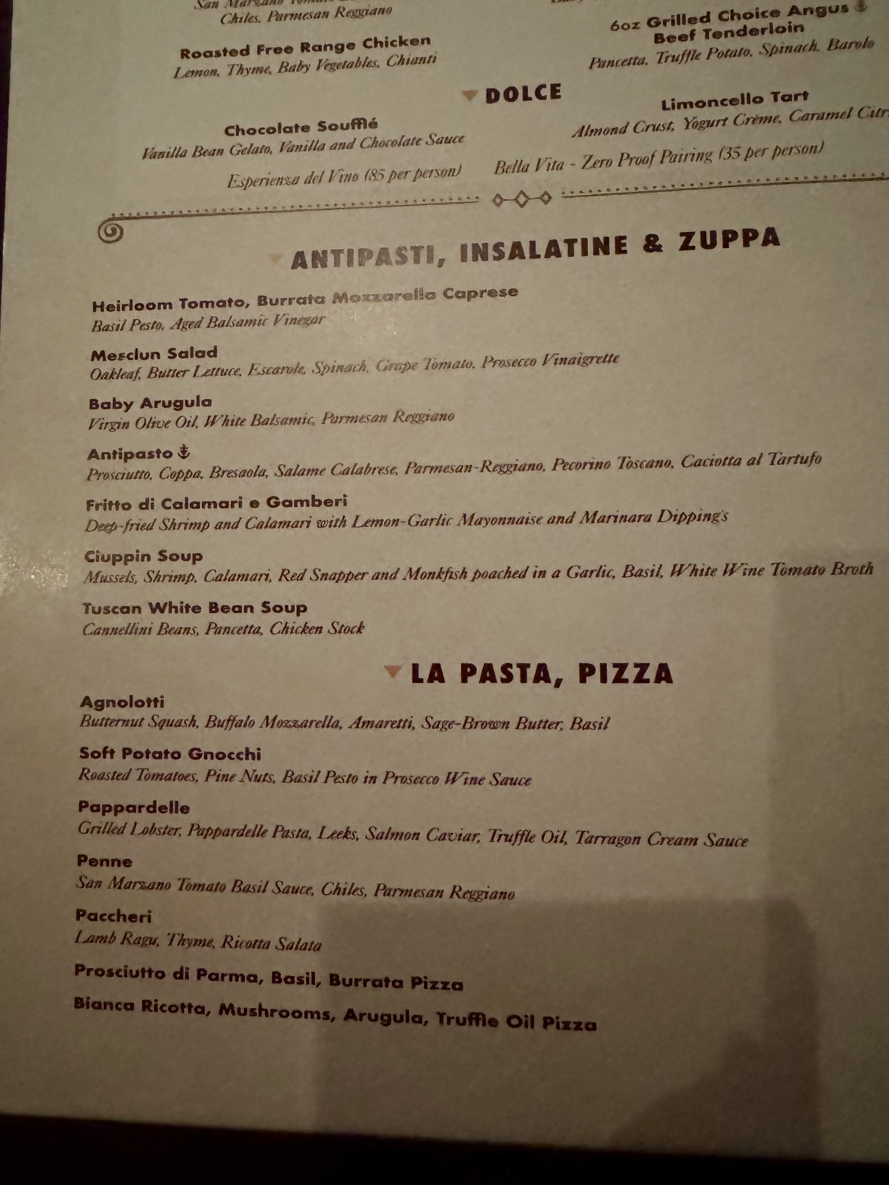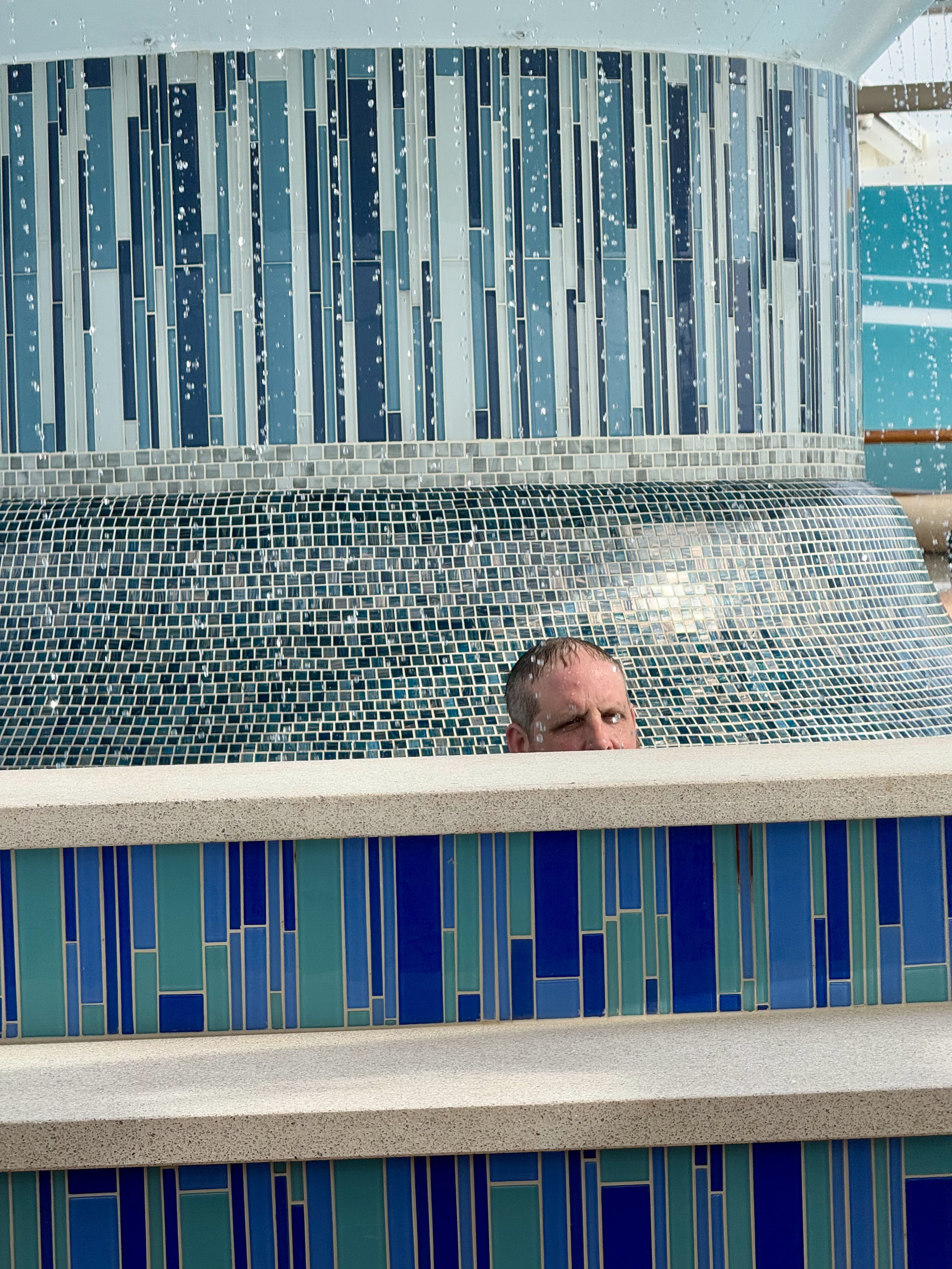 At about 5:30 we went back to try and get CSP a ride on the Aquaduck again. I found a chair on deck 11 by the giant movie screen that gave me a great view of the Aquaduck. But, just like yesterday CSP appeared again at my side in less than 10 minutes! There was a 45 minute wait to ride the Aquaduck and then they were closing it for maintenance. Whomp whomp. We didn’t have time for CSP to wait the 45 minutes because we had a dinner reservation at Palo tonight for 8 pm. Palo is the adults only Italian restaurant. We love it!