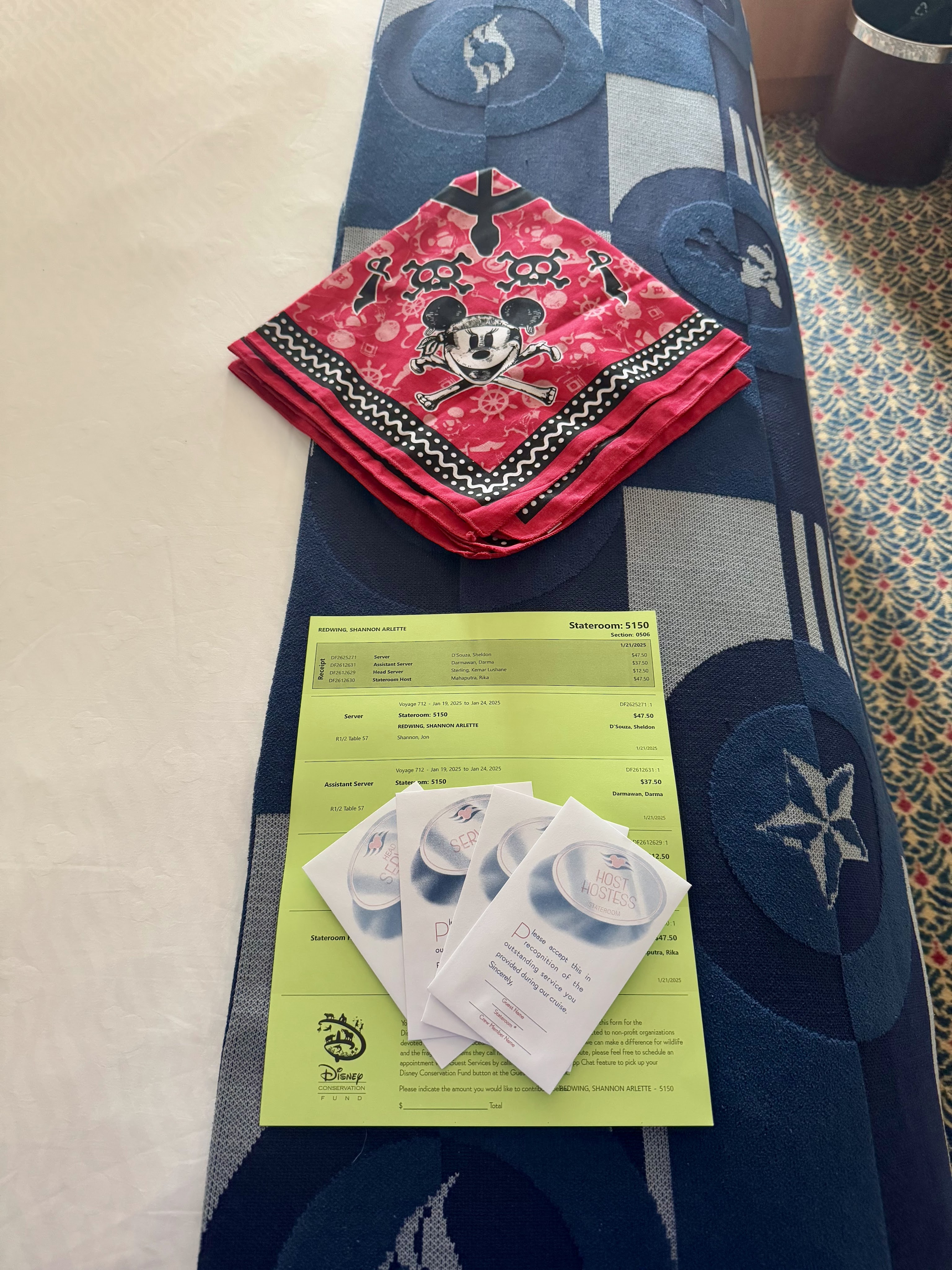 For Pirate night DCL give you a bandana for each person in your party. Also pictured below are the gratuity envelopes. We pre pay our gratuities so the green paper is how much we paid to each crew member. You can tear the perforated paper and put each slip in their corresponding envelopes then present them to the crew. You can also add some cash to the envelopes if you’d like.