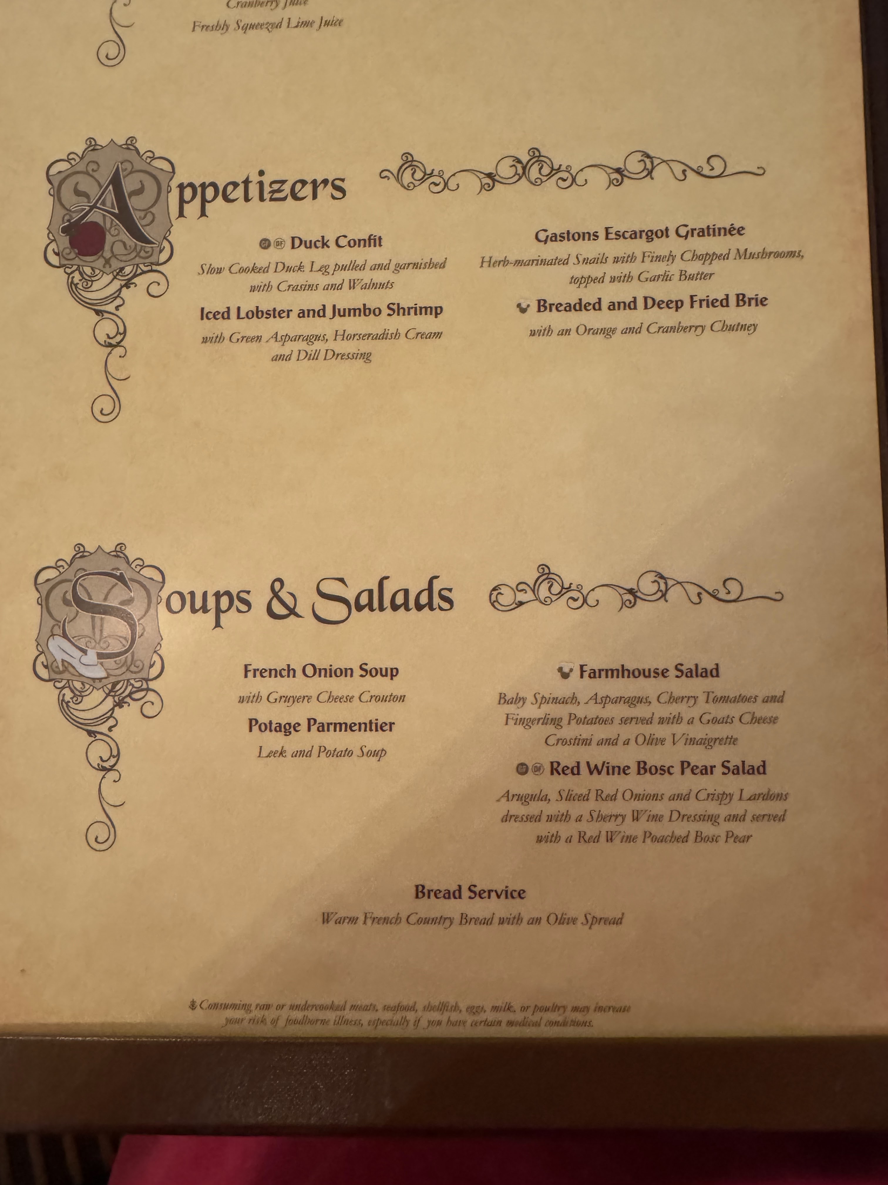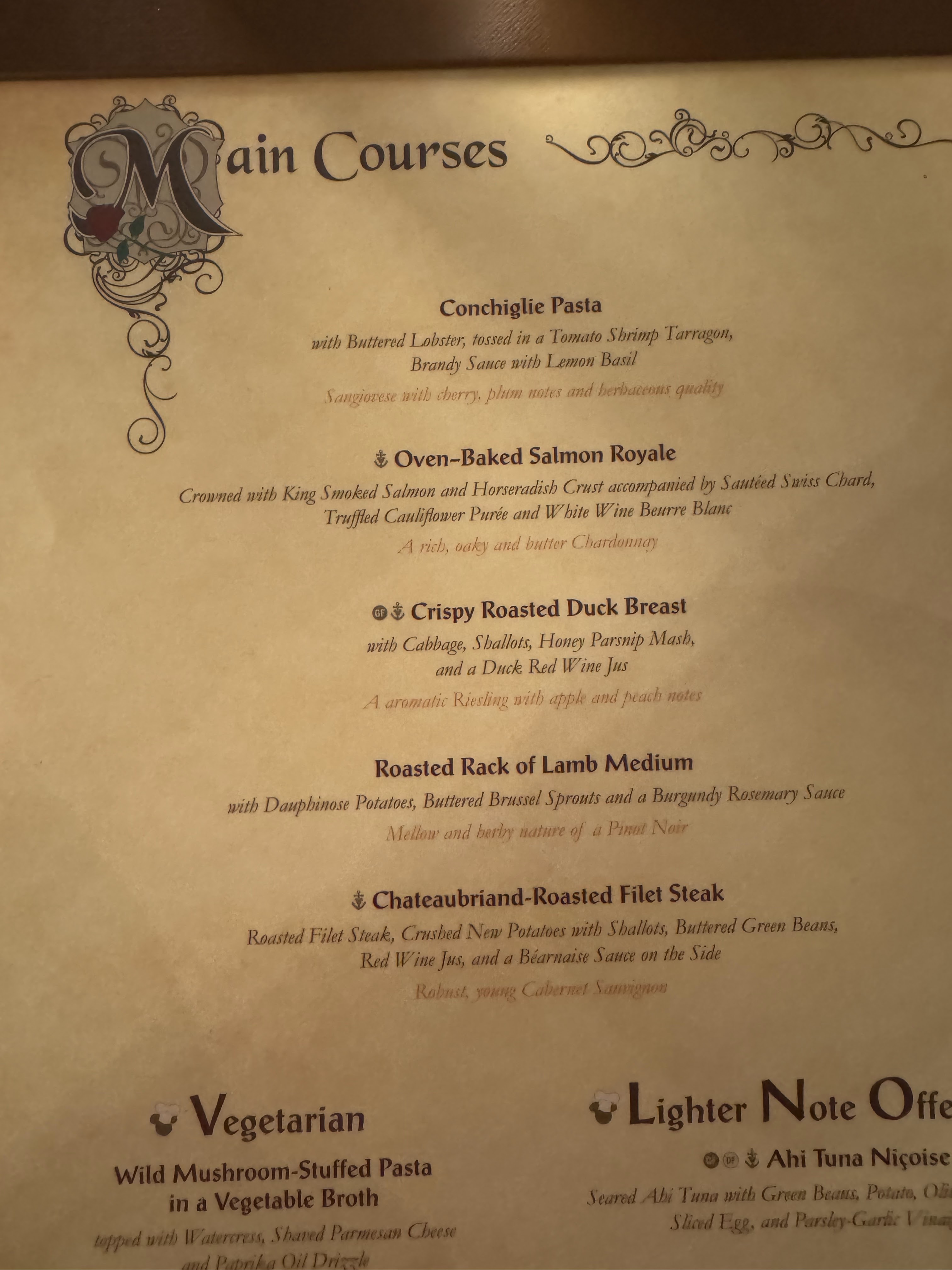 Tonight’s dinner was back in Royal Court. We were so not hungry! LOL. Between brunch and our room service snack we picked at our dinner. This did not please Sheldon, our server! He kept saying “You don’t like it? I’ll bring you something else!”