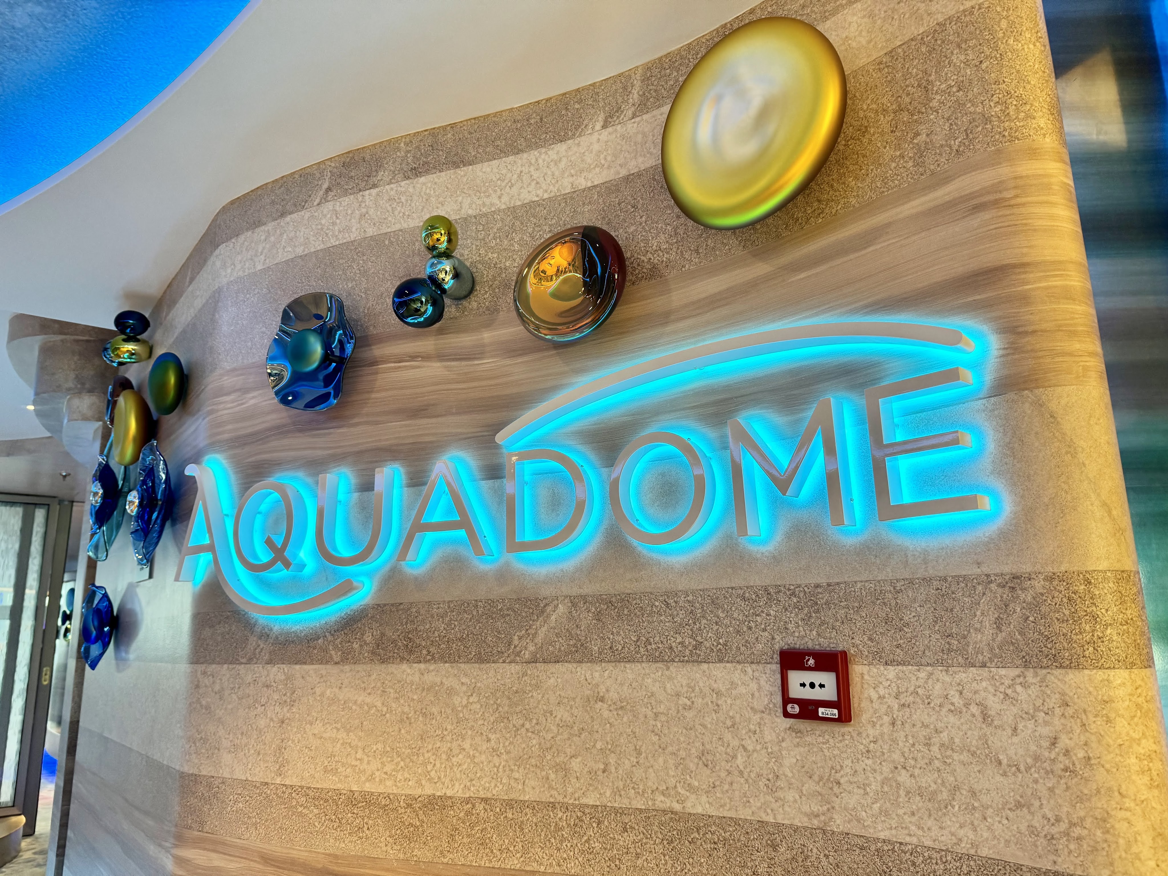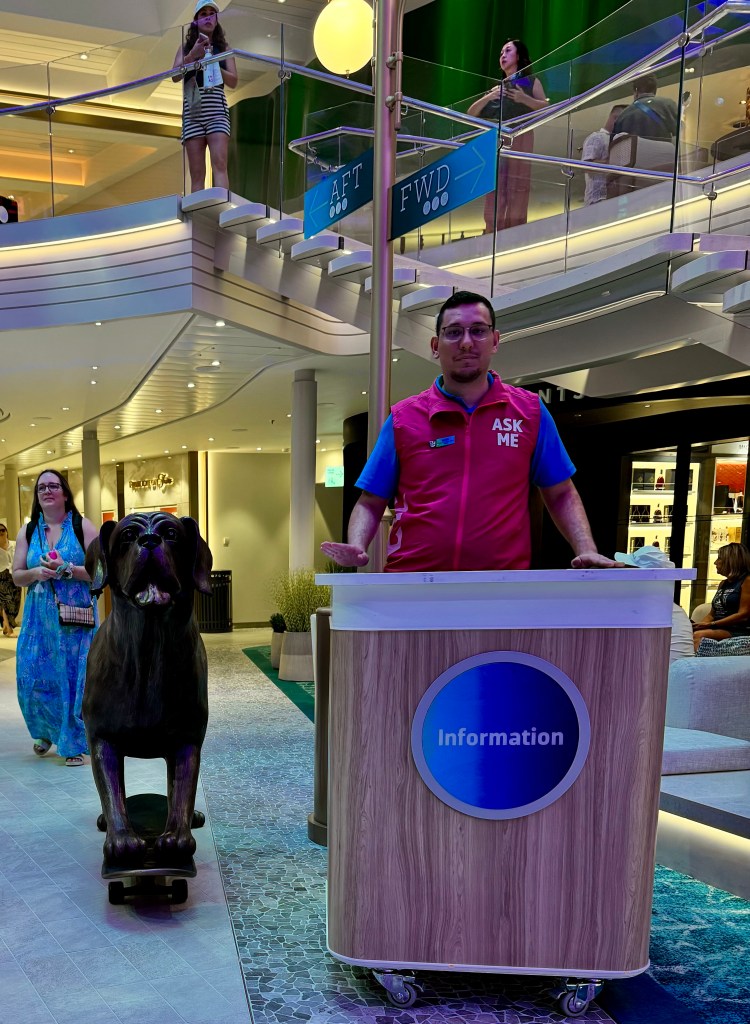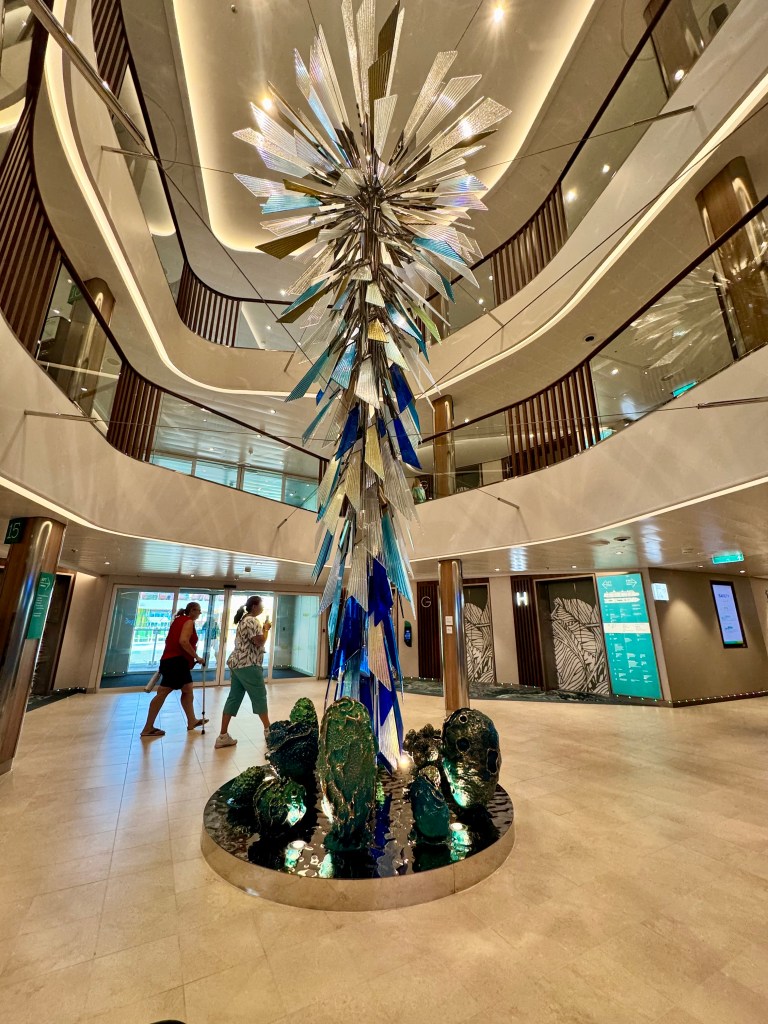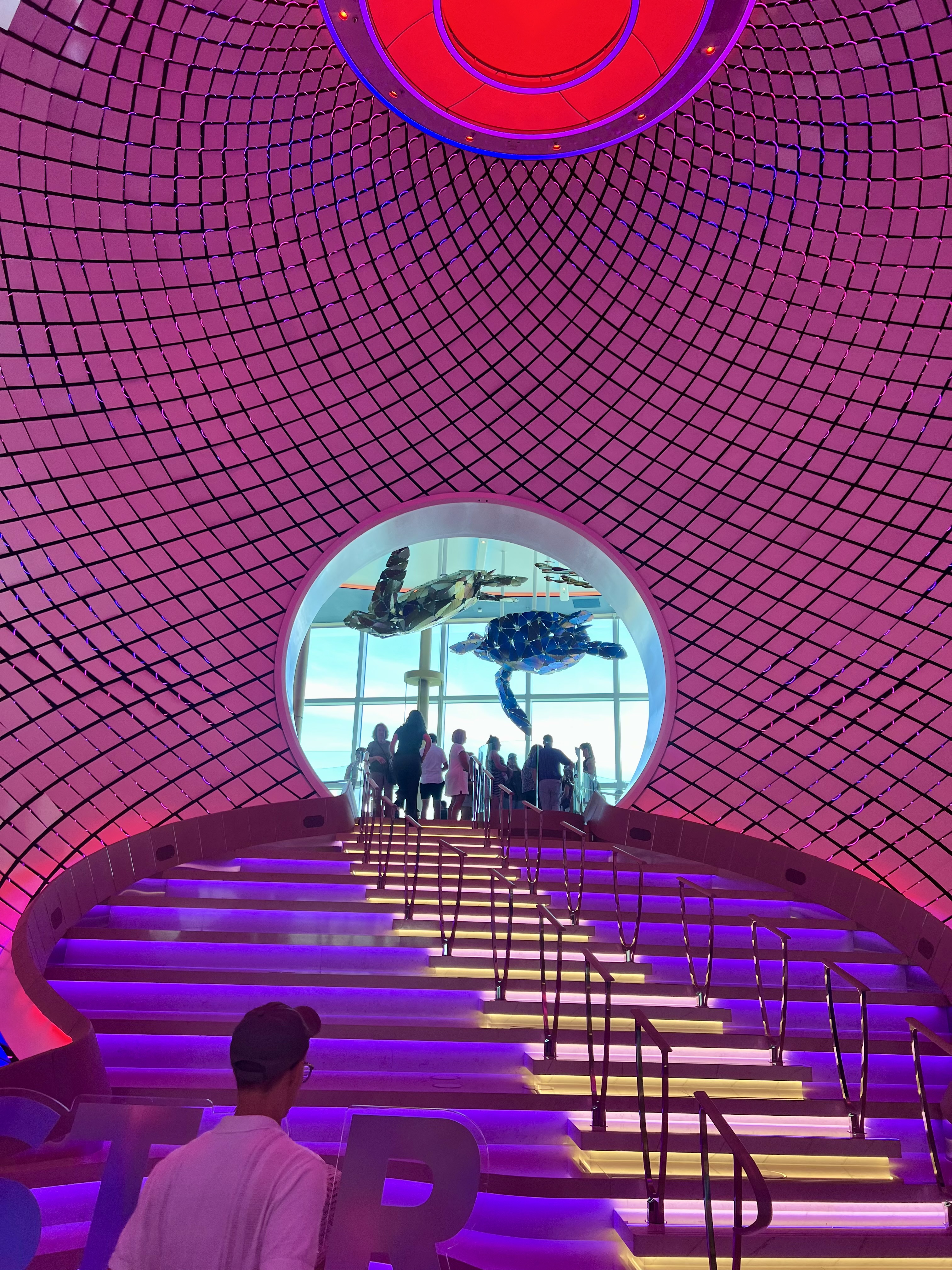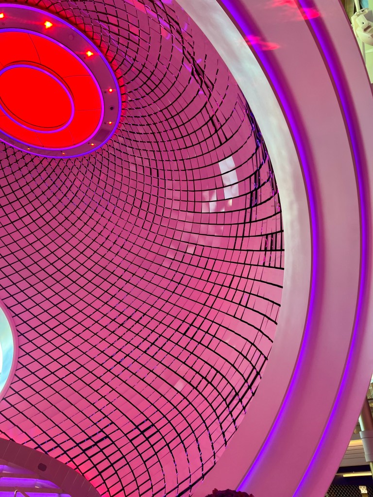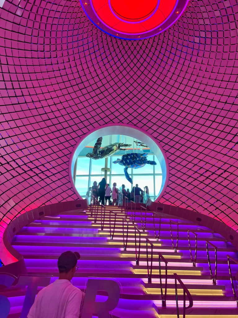 One stop during our scavenger hunt was the Pearl, the showpiece of the Star of the Seas! It’s gorgeous! It is made up of all these dynamic tiles that move and are backlit by LED lights that change colors. There’s a staircase in the middle of it that takes you from deck 5 to 6 and to the Pearl Cafe.