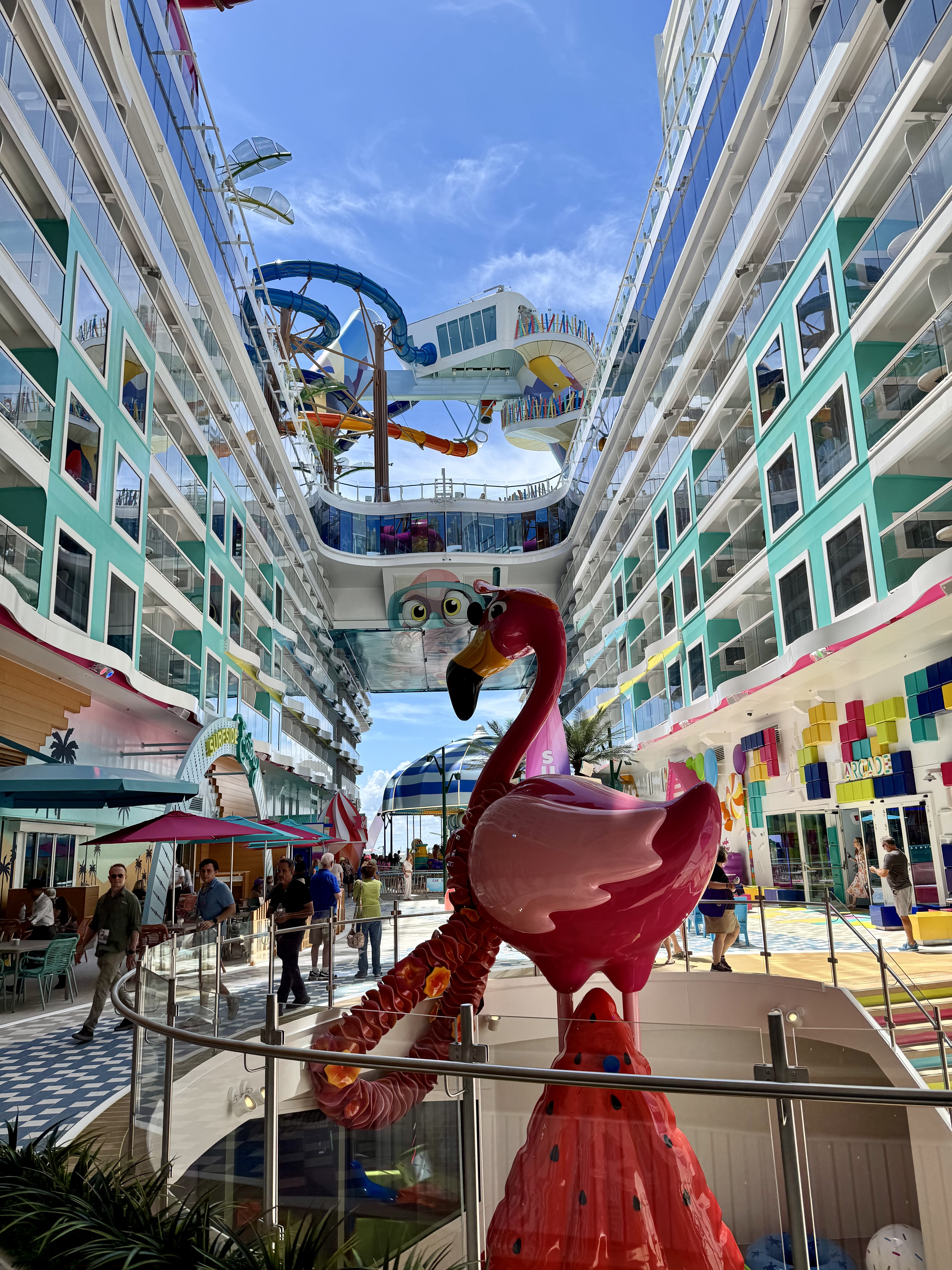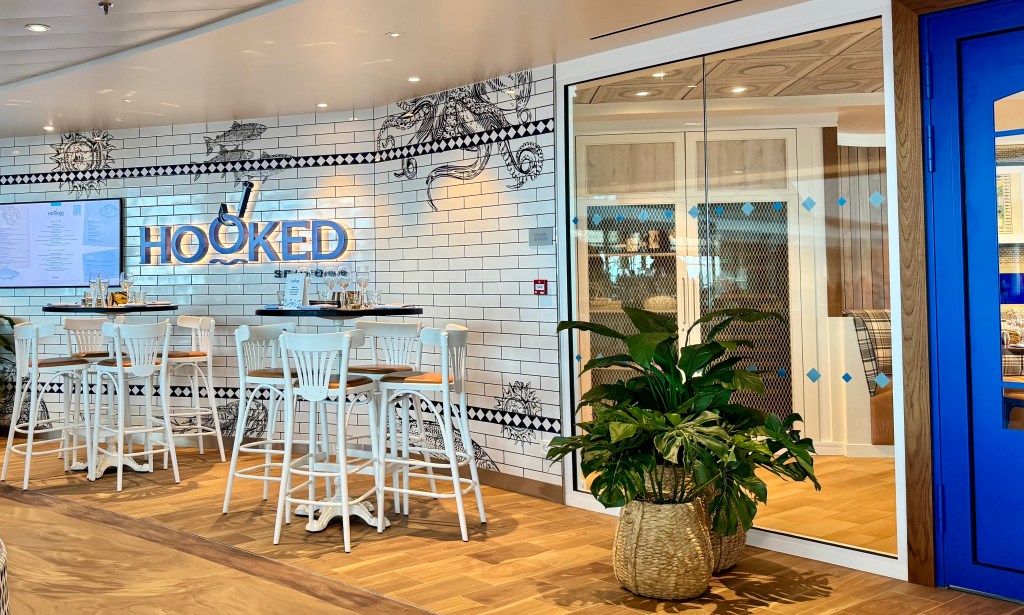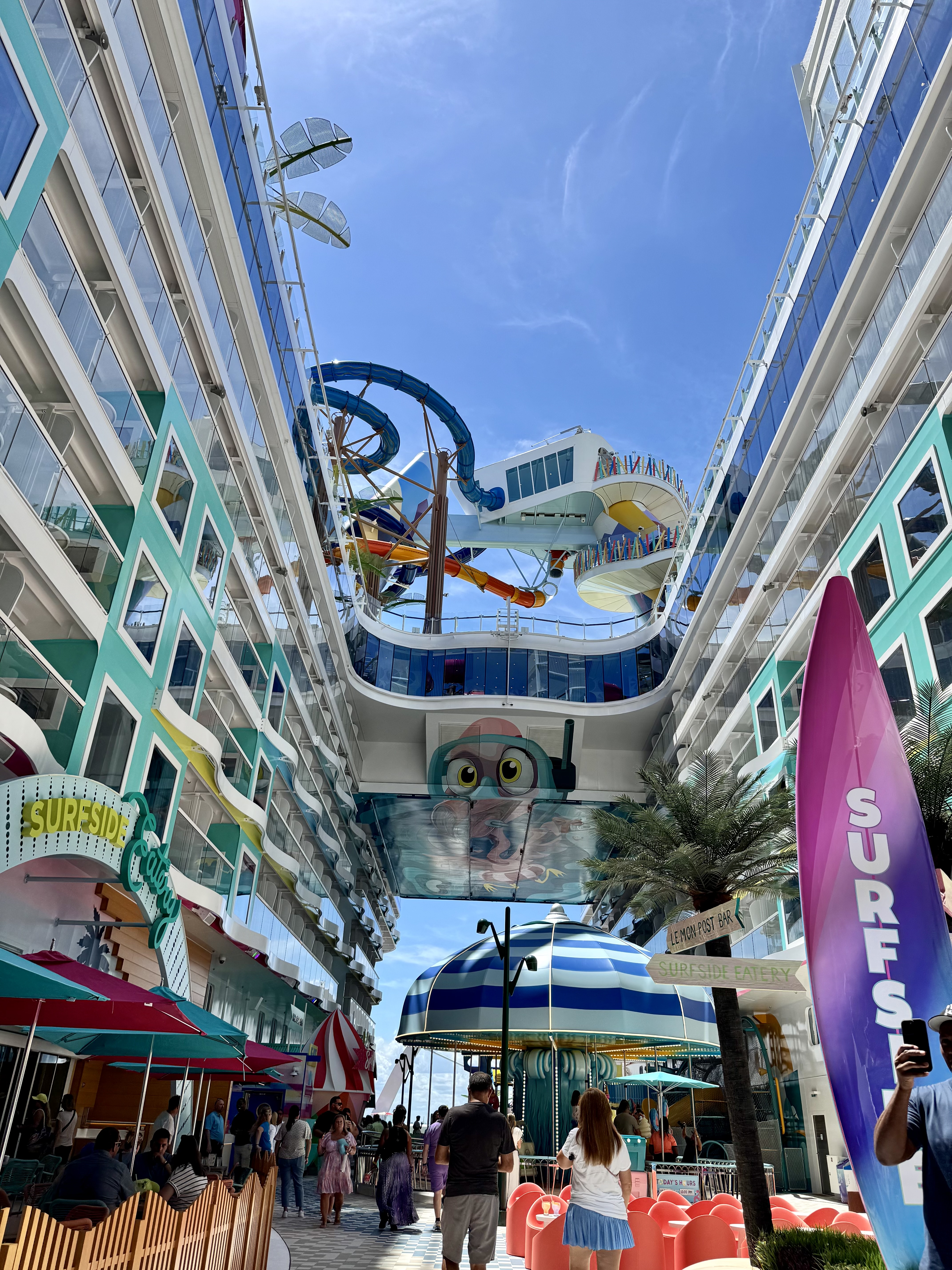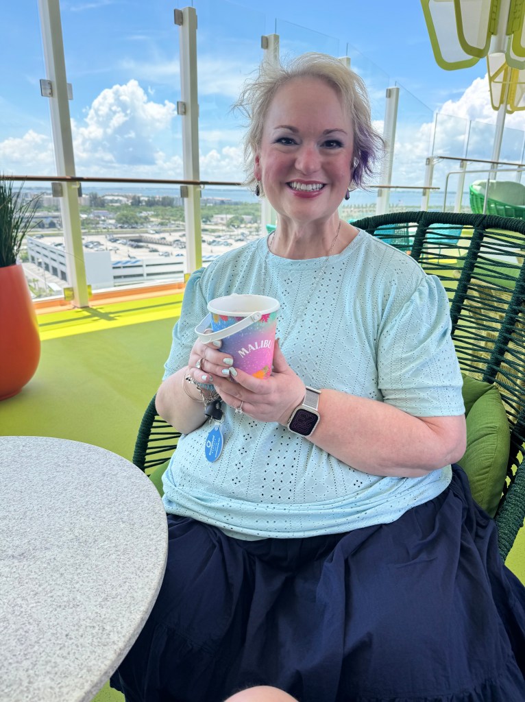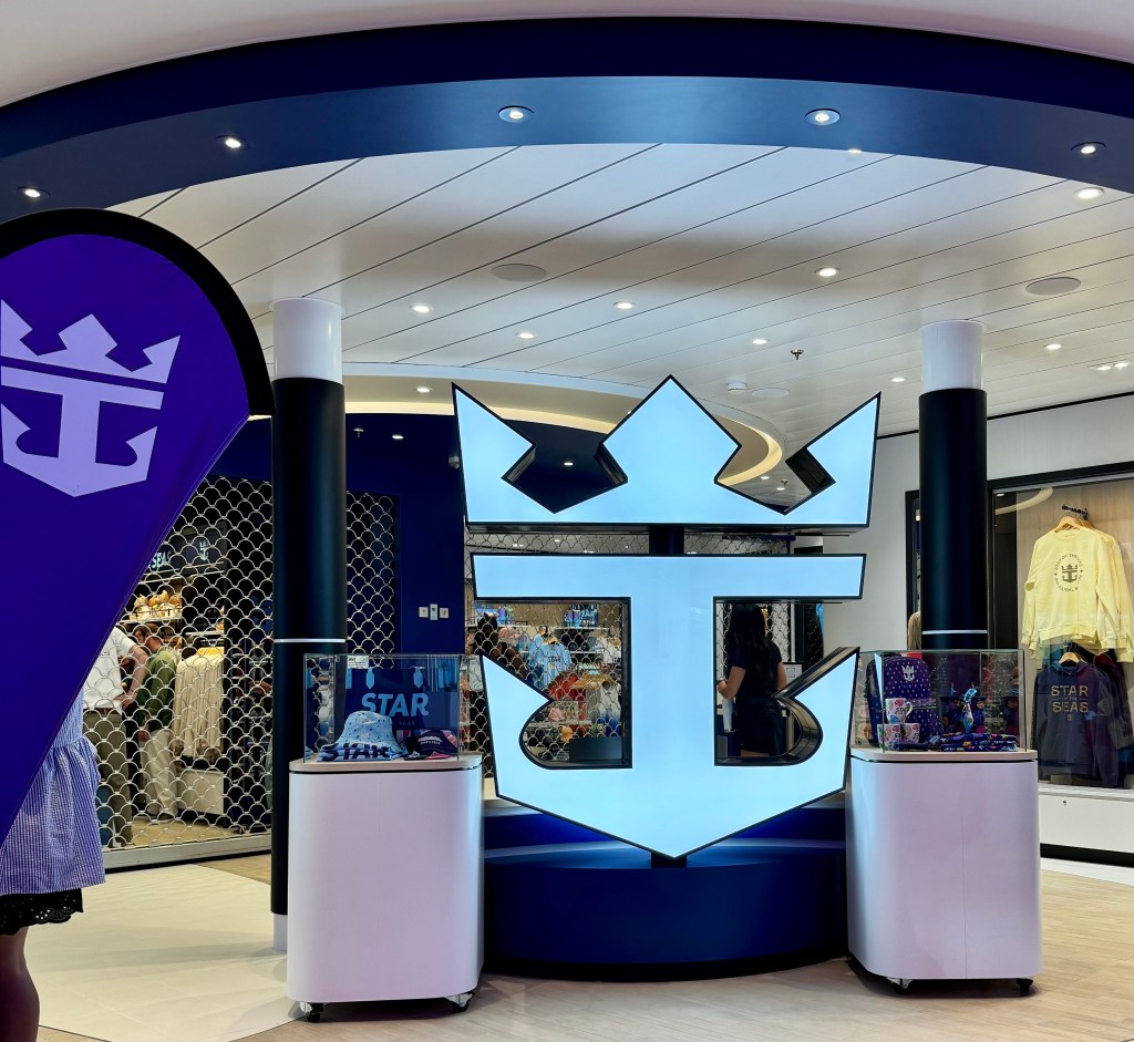 One stop during our scavenger hunt was the Pearl, the showpiece of the Star of the Seas! It’s gorgeous! It is made up of all these dynamic tiles that move and are backlit by LED lights that change colors. There’s a staircase in the middle of it that takes you from deck 5 to 6 and to the Pearl Cafe.