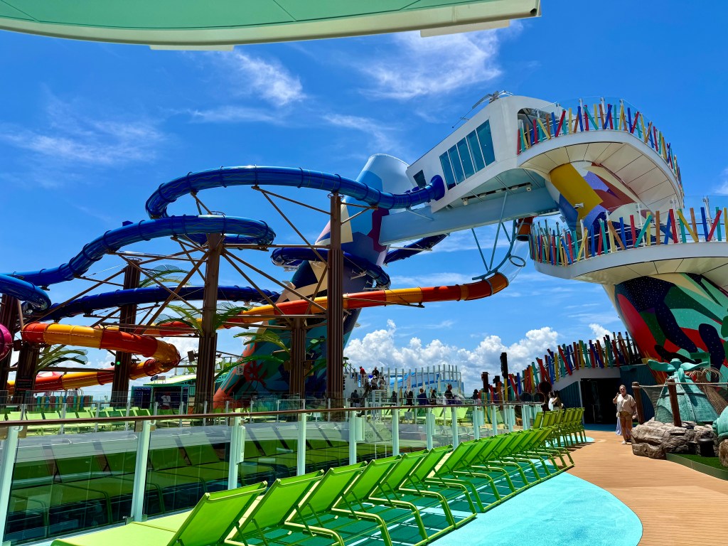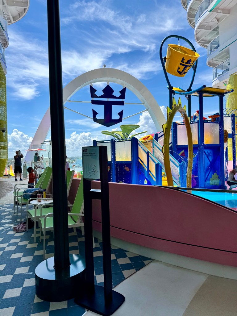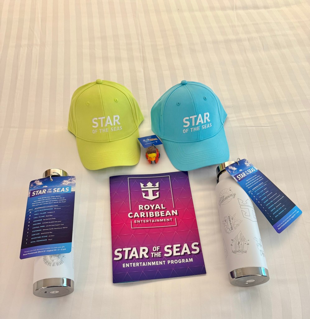 There are little illustrations all over them that correspond to features of the Star of the Seas. There’s a card hanging from the bottle that tells you where to go, and when you get to the destination you can collect a sticker that corresponds with the illustrations. Collect all of the stickers and on Day 3 we will get a prize! Love a scavenger hunt! Plus we’ll really learn our way around the ship.