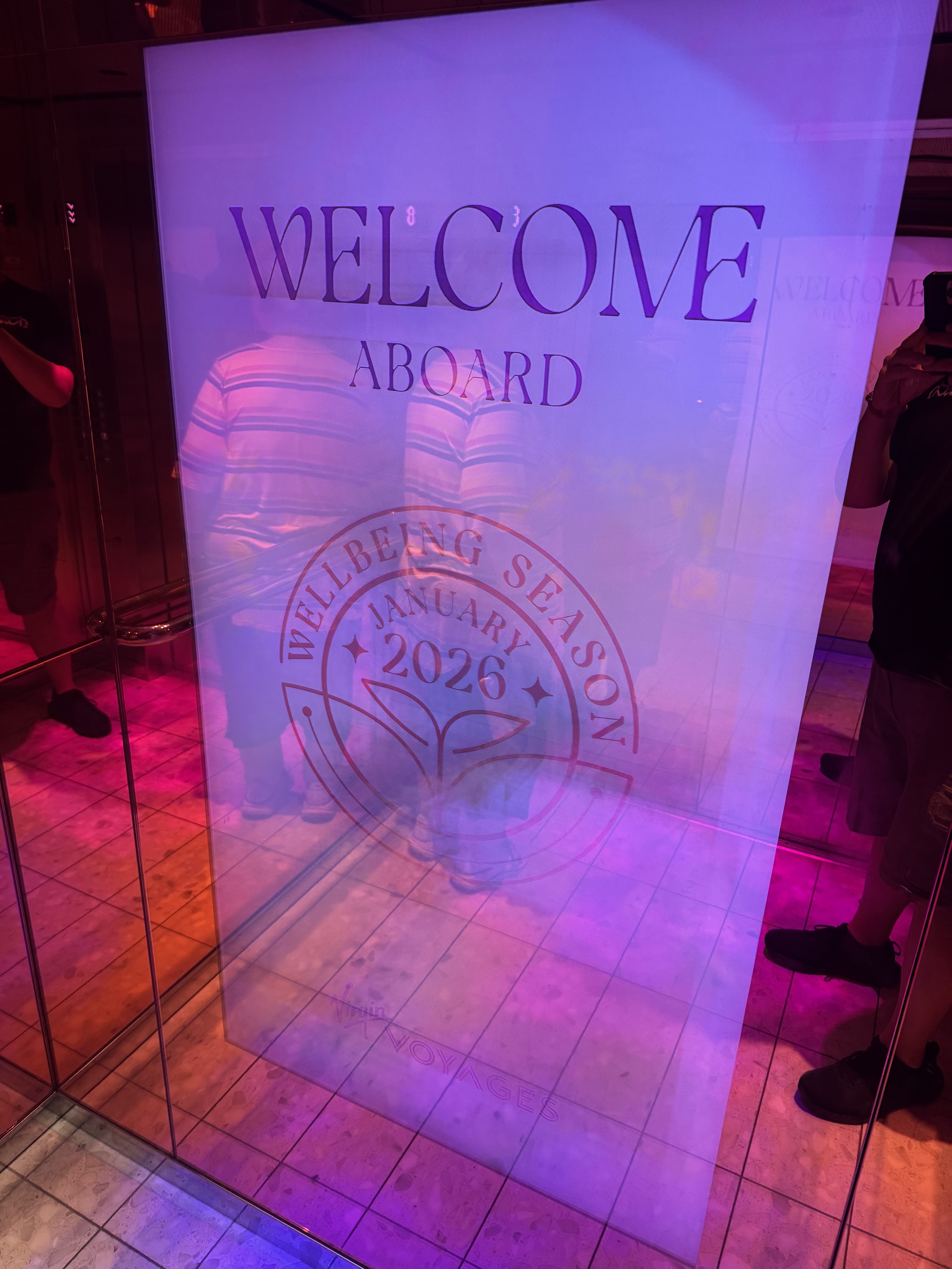 We walked over to the terminal from the parking garage at about 2:20 PM and found that they were already letting our boarding group get on the ship. Embarkation was easy peasy and quick. We were walking down the gangway to the ship when I spotted Adam the Spark. Virgin ships don’t have cruise directors like most cruise ships do. They have the Happenings Cast instead- a group of people with different specialties who lead the sailors in activities all around the ship. Adam the Spark hosted most of the trivia tournaments on our last cruise. Anyway, I was about to board the ship and Adam was greeting the sailors. He saw me and yelled “She’s back! It’s my gorgeous girl with the purple hair!!!” I couldn’t believe he remembered me! We had only had one conversation on our last cruise! Apparently I’m famous! LOL