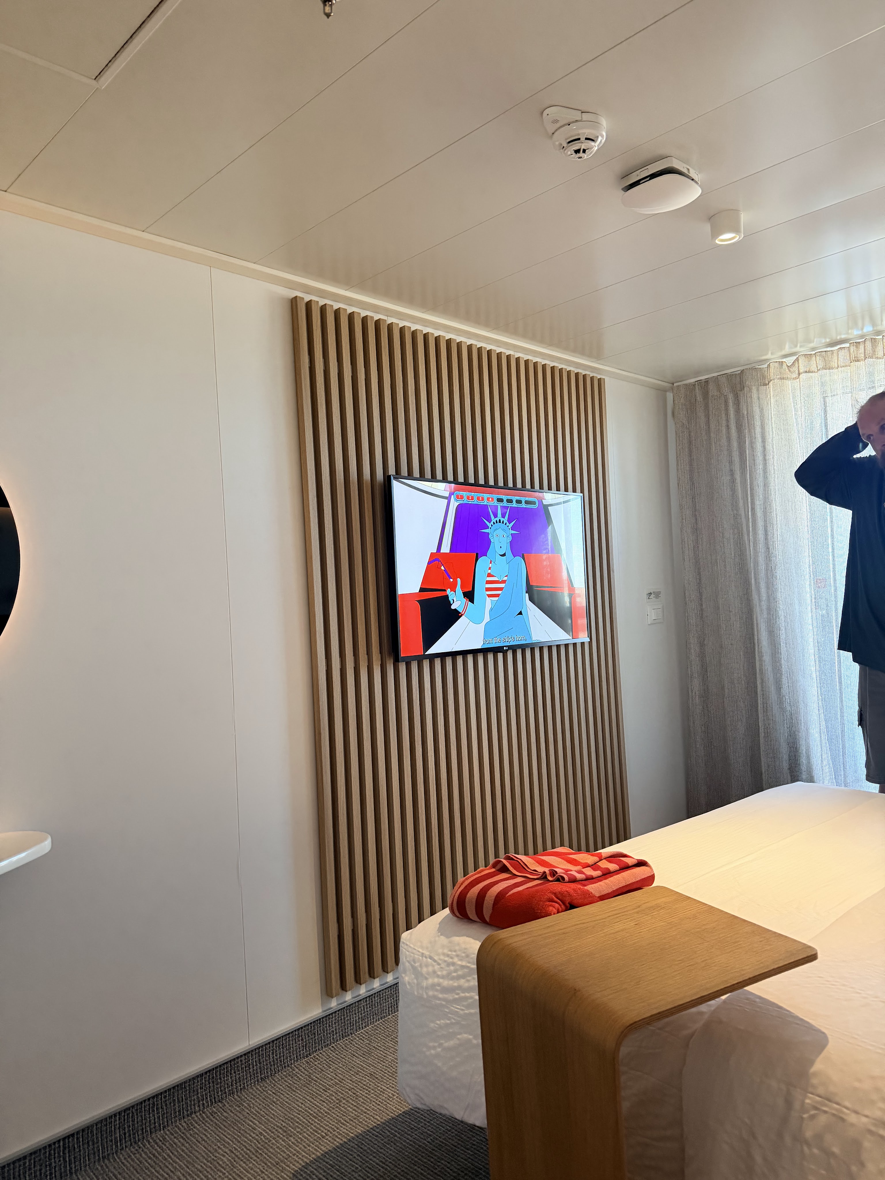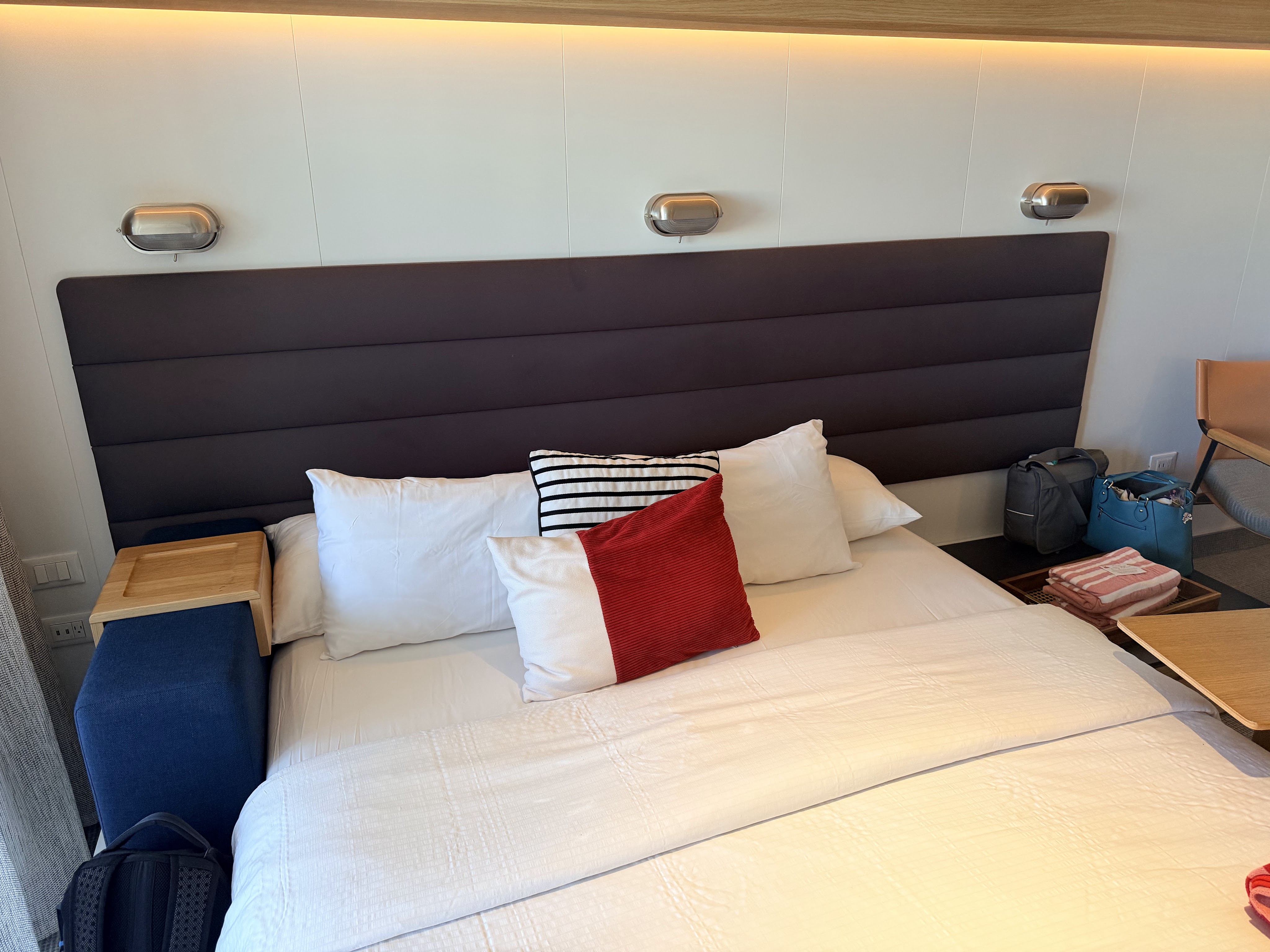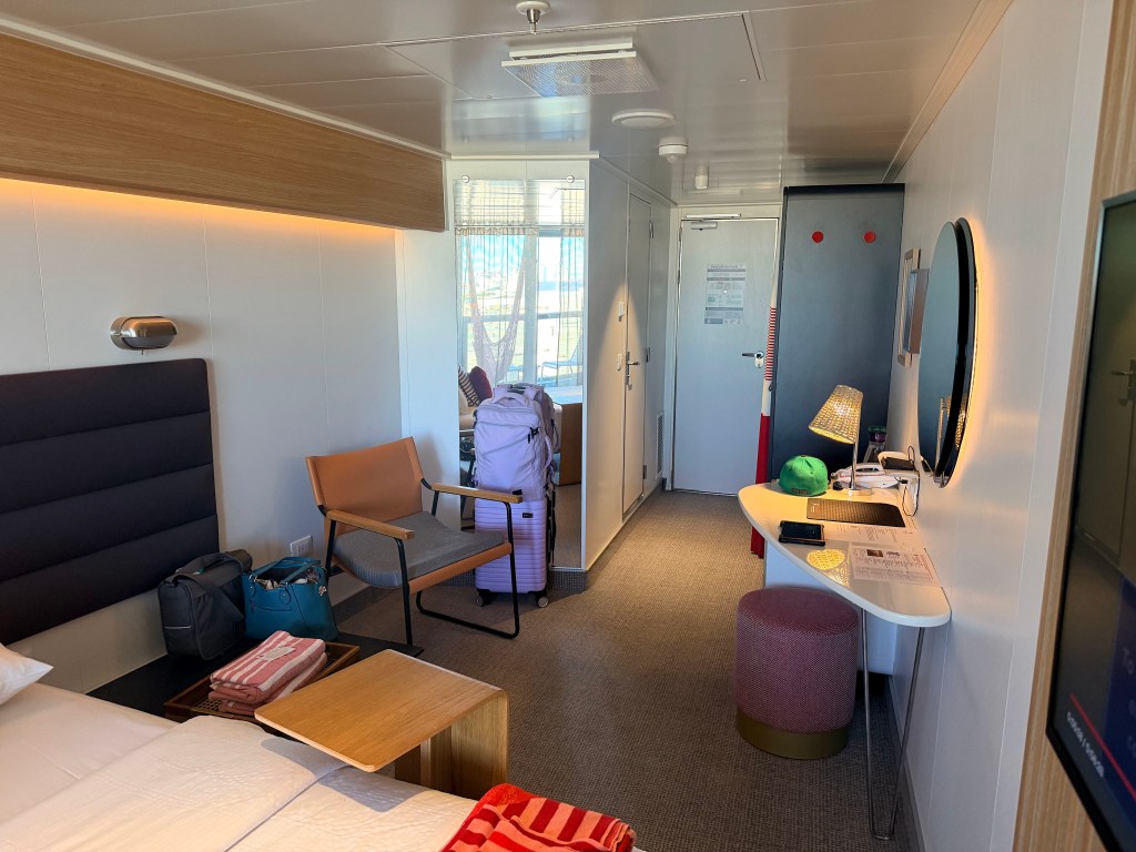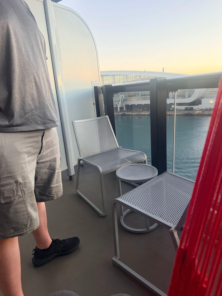 After boarding we went straight to our room, 10102Z, to drop our carryon bags. I had a surprise for CSP. I hadn’t told him that I’d booked us a special room with a larger balcony (without having to pay more!). It’s all because of the way the ship is designed that 10102Z’s balcony juts out a bit at an angle, providing us with a good deal more room out there than the standard Sea Terrace room.
