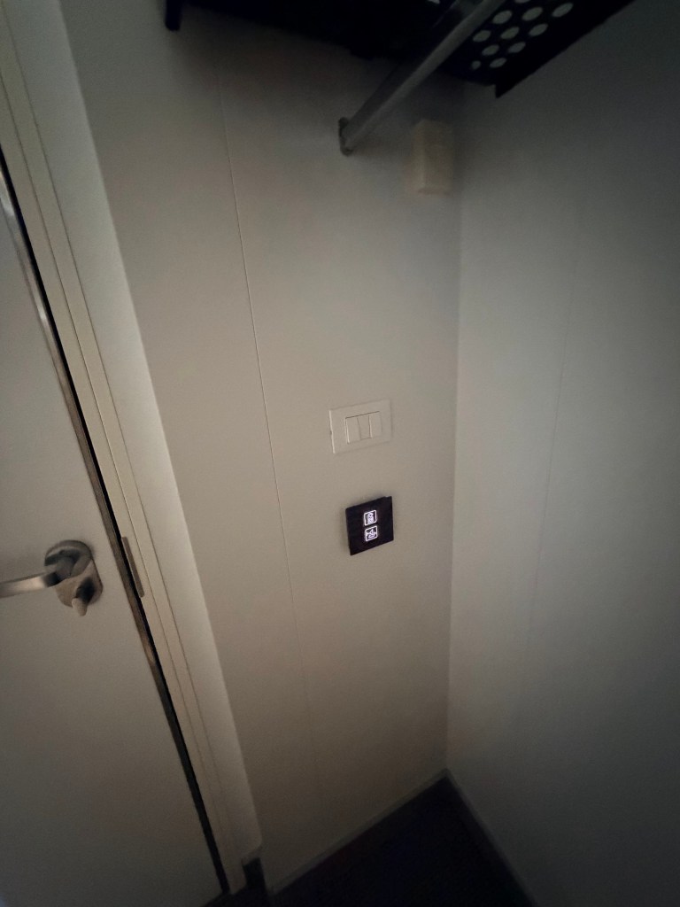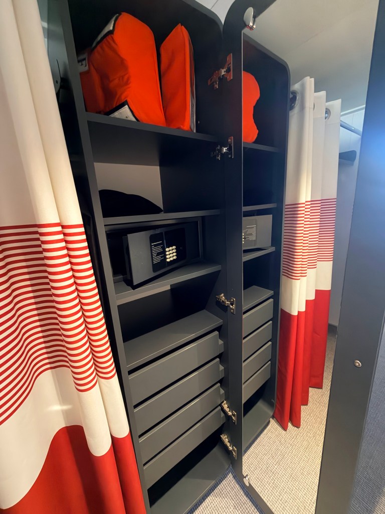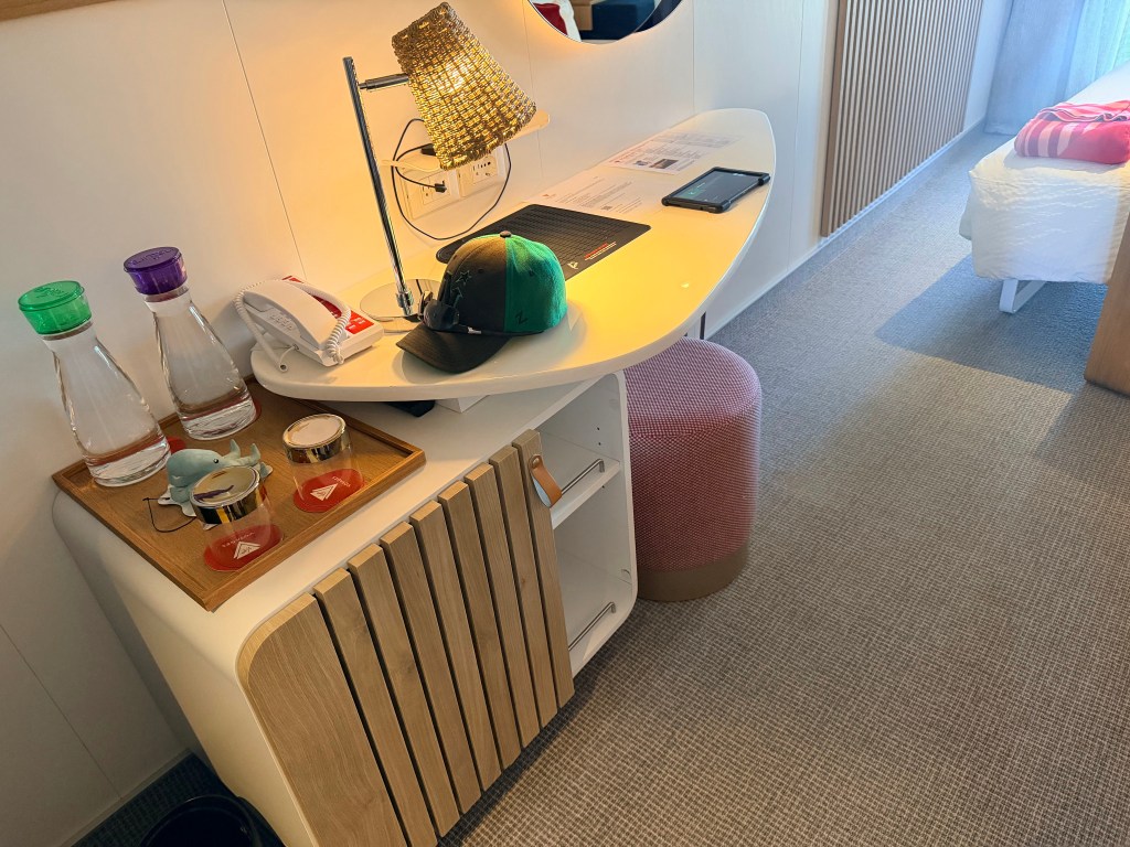 As soon as we dropped our bags, our room steward Roel came by to introduce himself. SO nice! I took pictures of the room and filmed the above tour. BTW, this time around I found the included hair dryer! It is in a black bag on the black shelf in the black closet. No wonder I missed it last cruise! It’s a wee travel hair dryer though, so if you need more power than a stiff breeze to dry your hair, I suggest bringing your own!