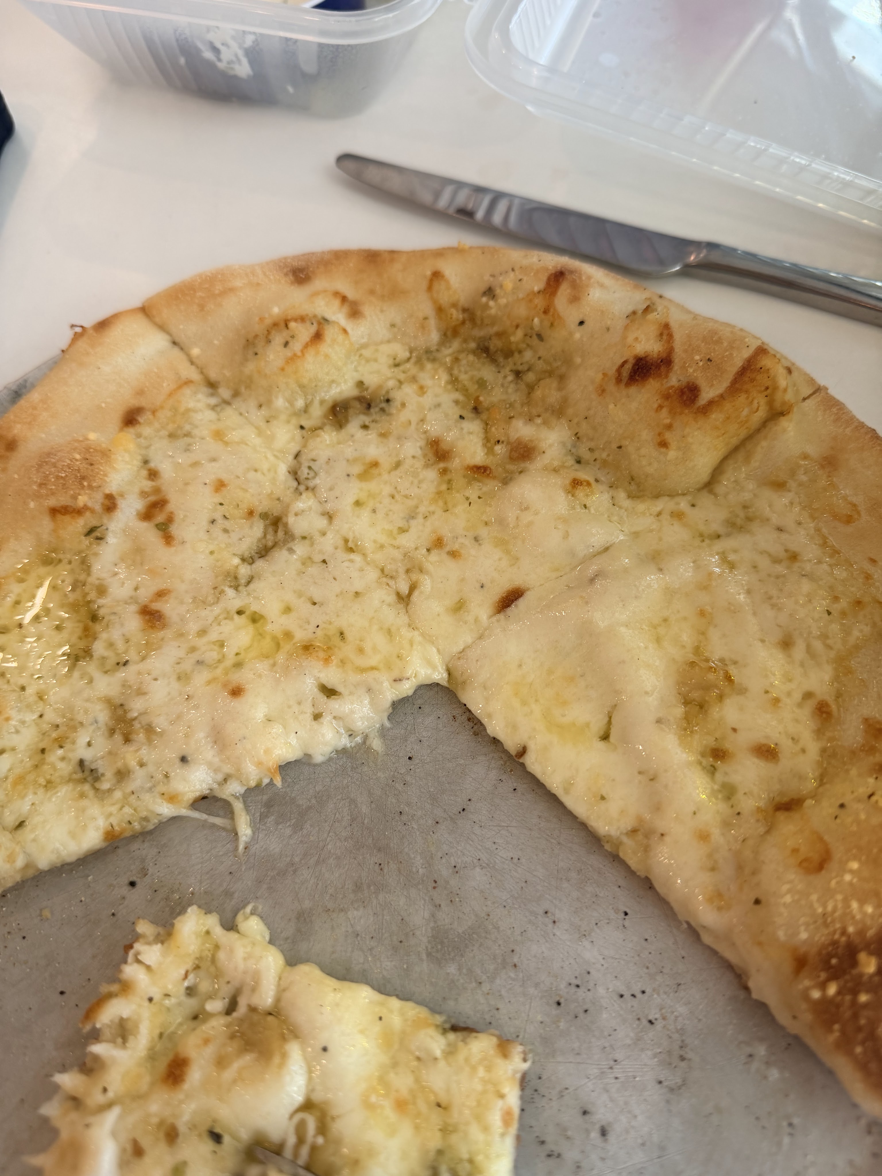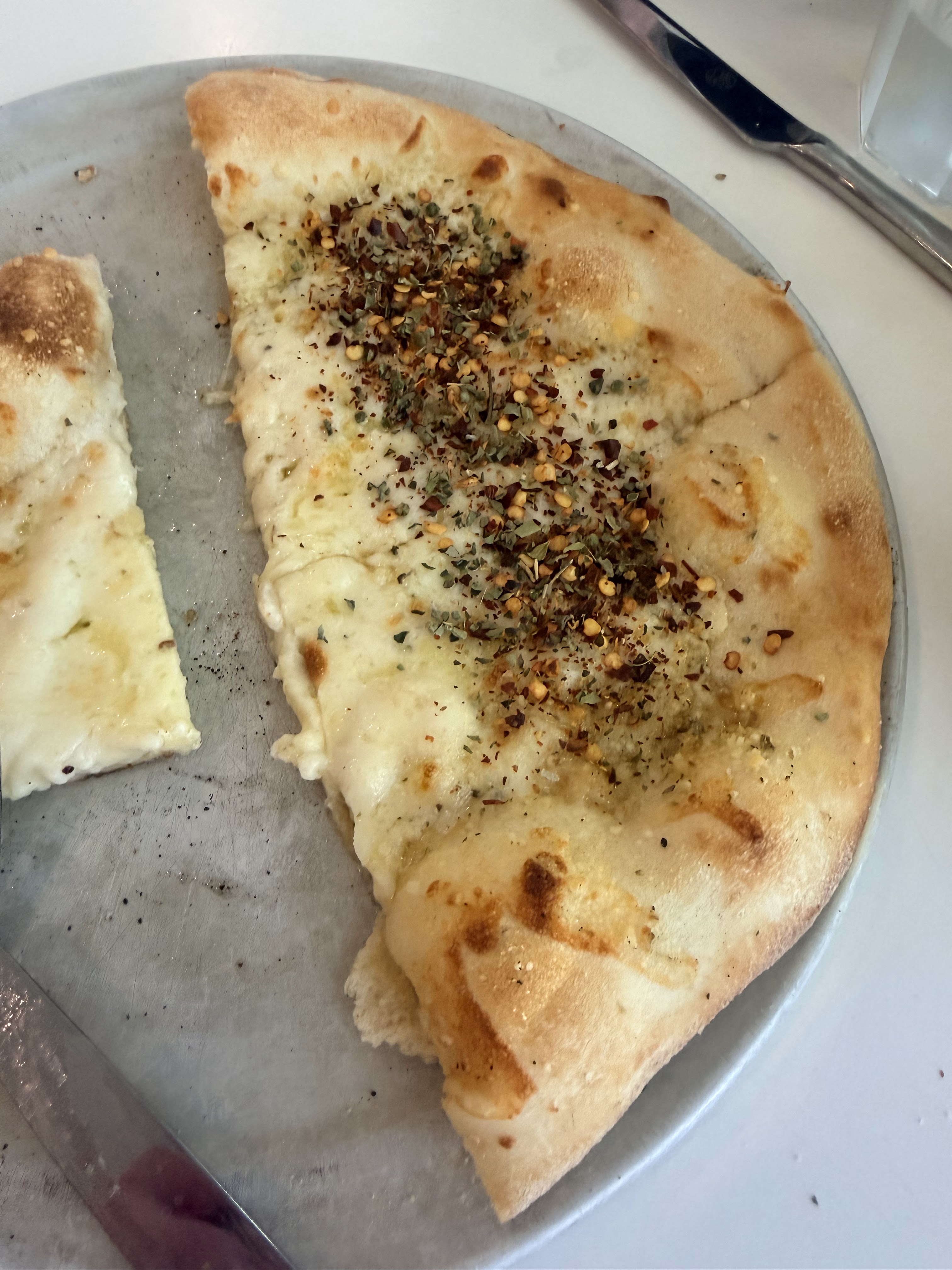We chose to split the Pretty Fly for a White Pie pizza. Look at how much red pepper CSP topped his half with!!! I don’t know how he has any tastebuds left!!!