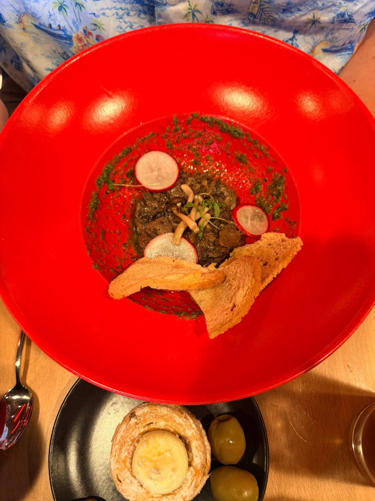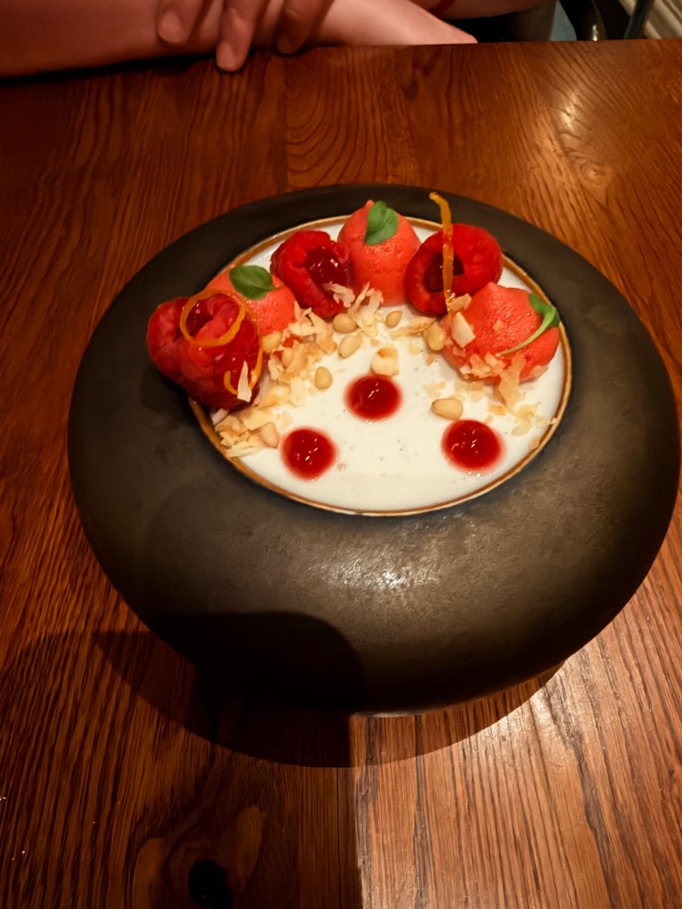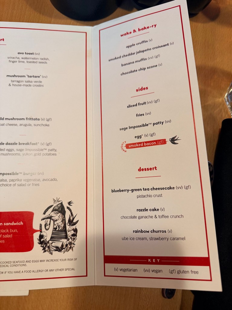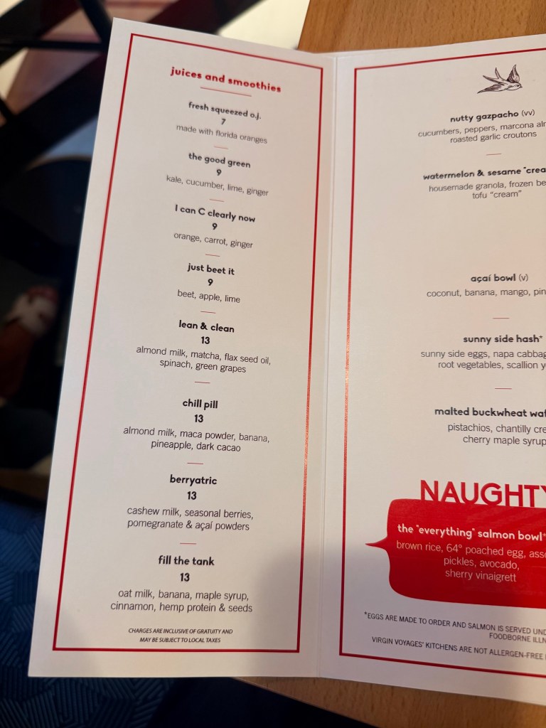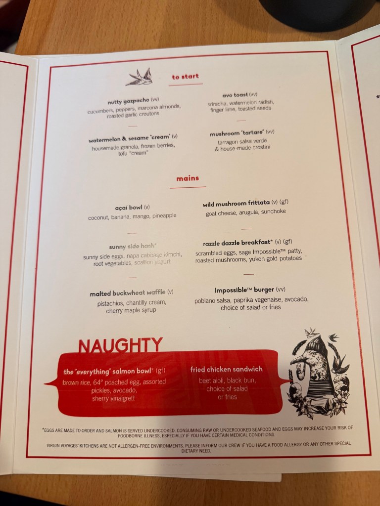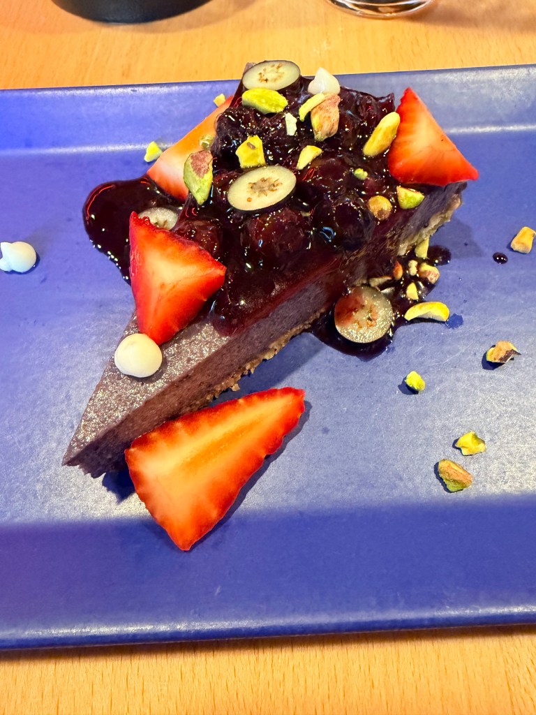I’m not a fan of cake, so I got the blueberry green tea cheesecake for dessert. I should have gotten the razzle cake!!! Oh well, now we have another reason to book another Virgin Voyage!