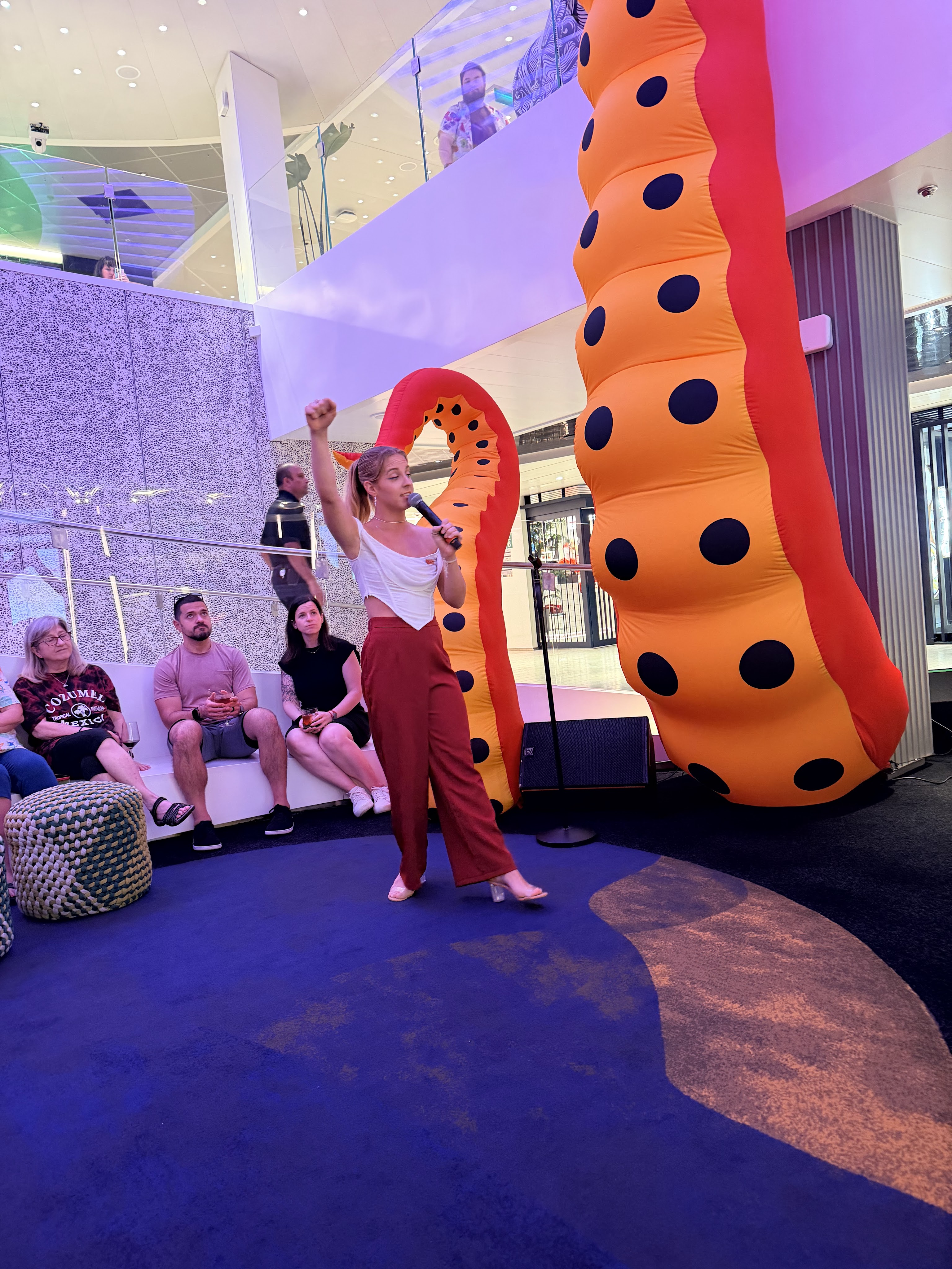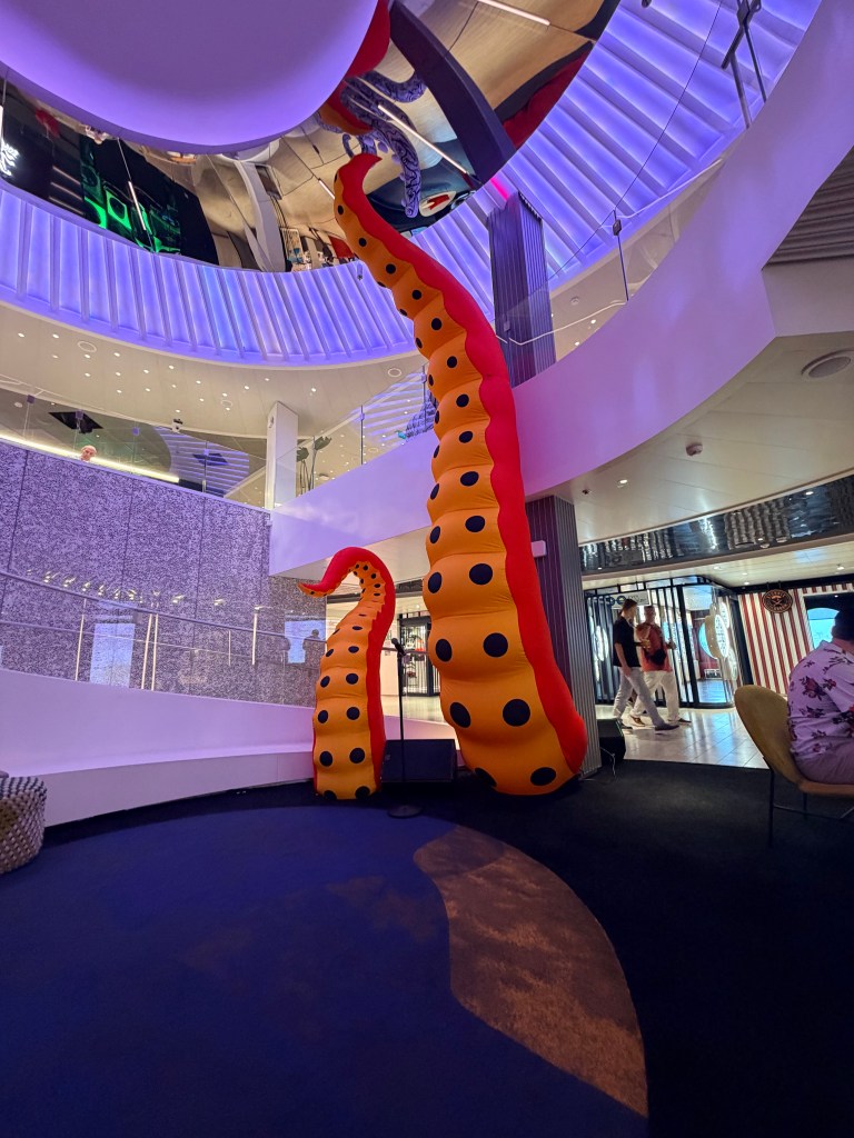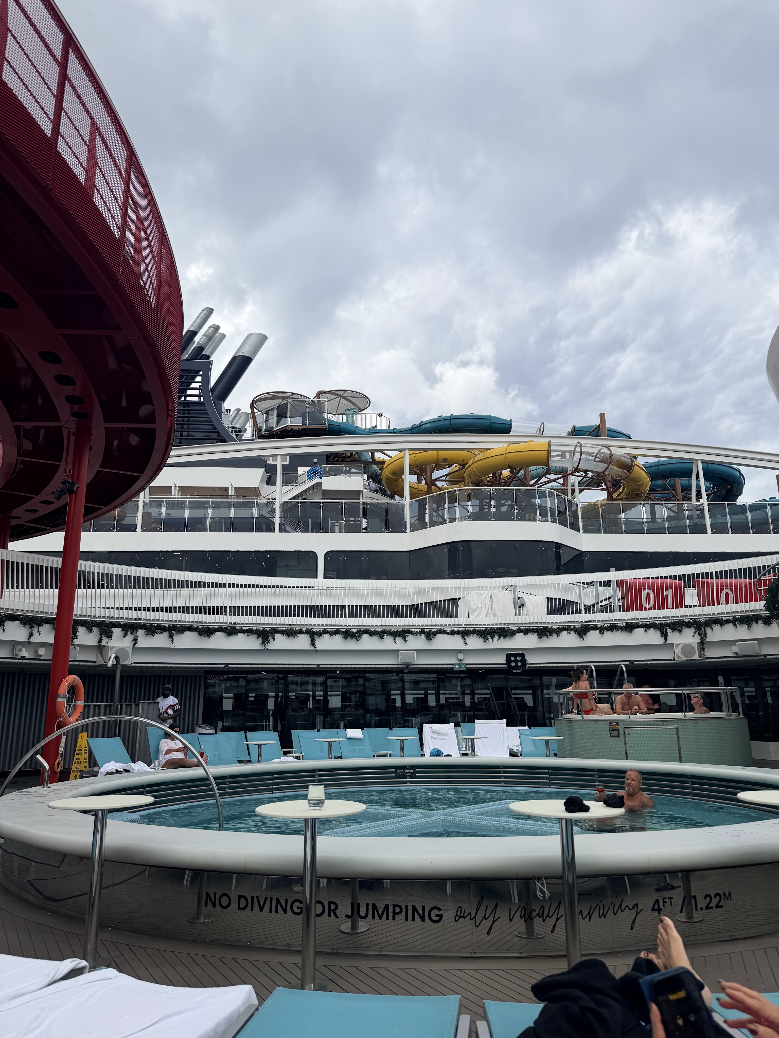 We decided to stay on the ship today and take advantage of an empty ship! So after brunch we changed into our swimsuits and headed up to the X shaped pool. It’s like a giant hot tub without the hot. There are bubbles! It rained on us a bit.
