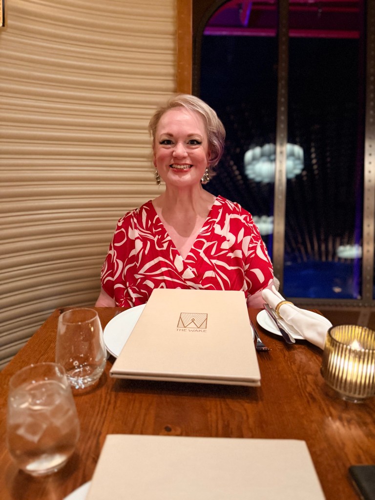 Then we raced back to our room to shower and dress for dinner at the Wake. I wore my red dress and CSP wore a navy shirt and khaki pants. HA! He doesn’t have anything red yet!