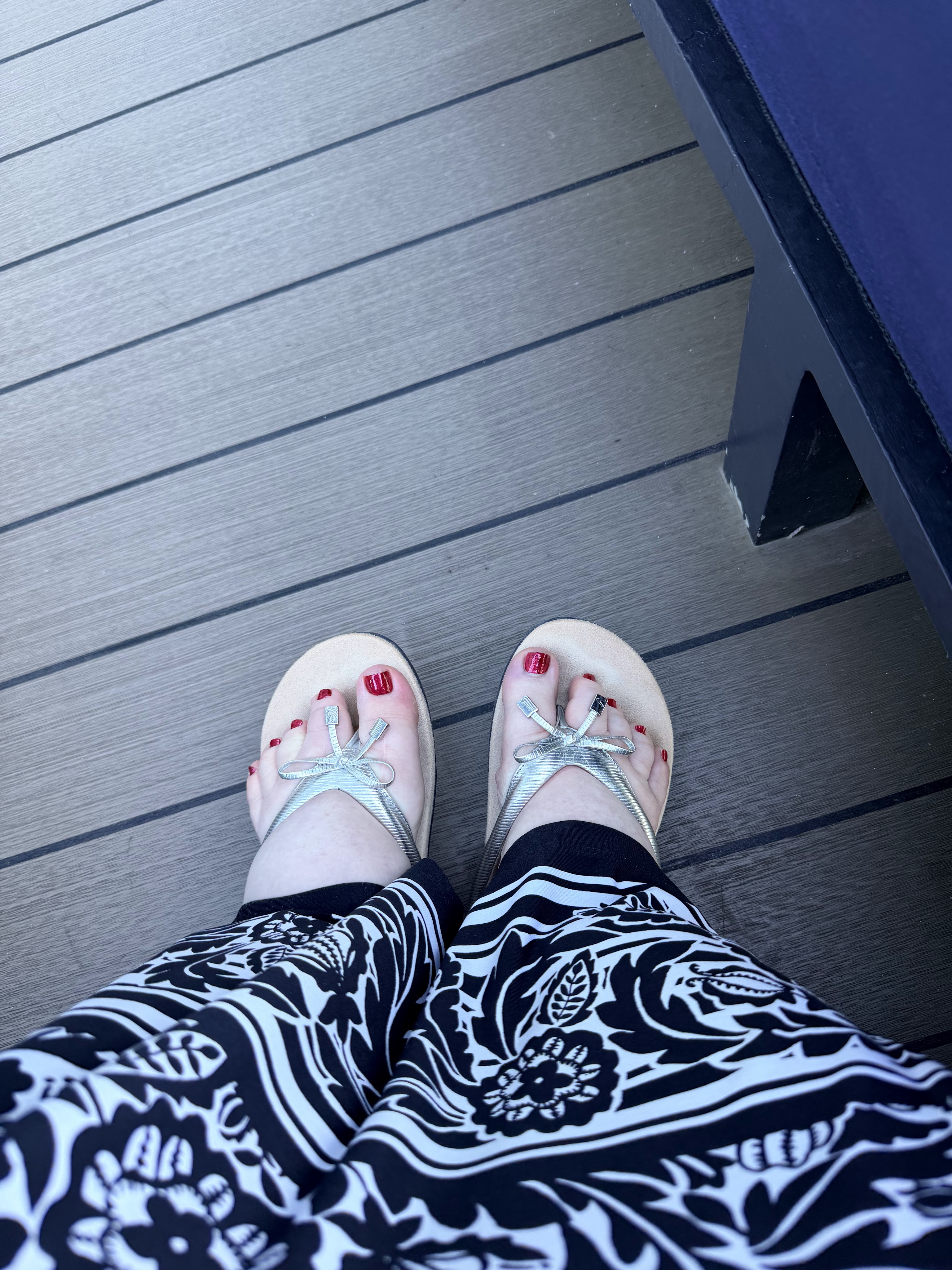 We woke up and had breakfast in the Galley. Then at 10:30 we went to the pool deck. I dropped CSP off on a comfy lounger and I went in to The Tune Up for a pedicure. The nail polish on my 4th toe on my right foot had fallen completely off! It was driving me bananas and we still have Sailor Loot to spend, so I decided to treat myself. I haven’t had a pedicure in years! I always do my own. The Tune Up is on the pool deck and the floor to ceiling windows give you amazing sea views while you’re being pampered.