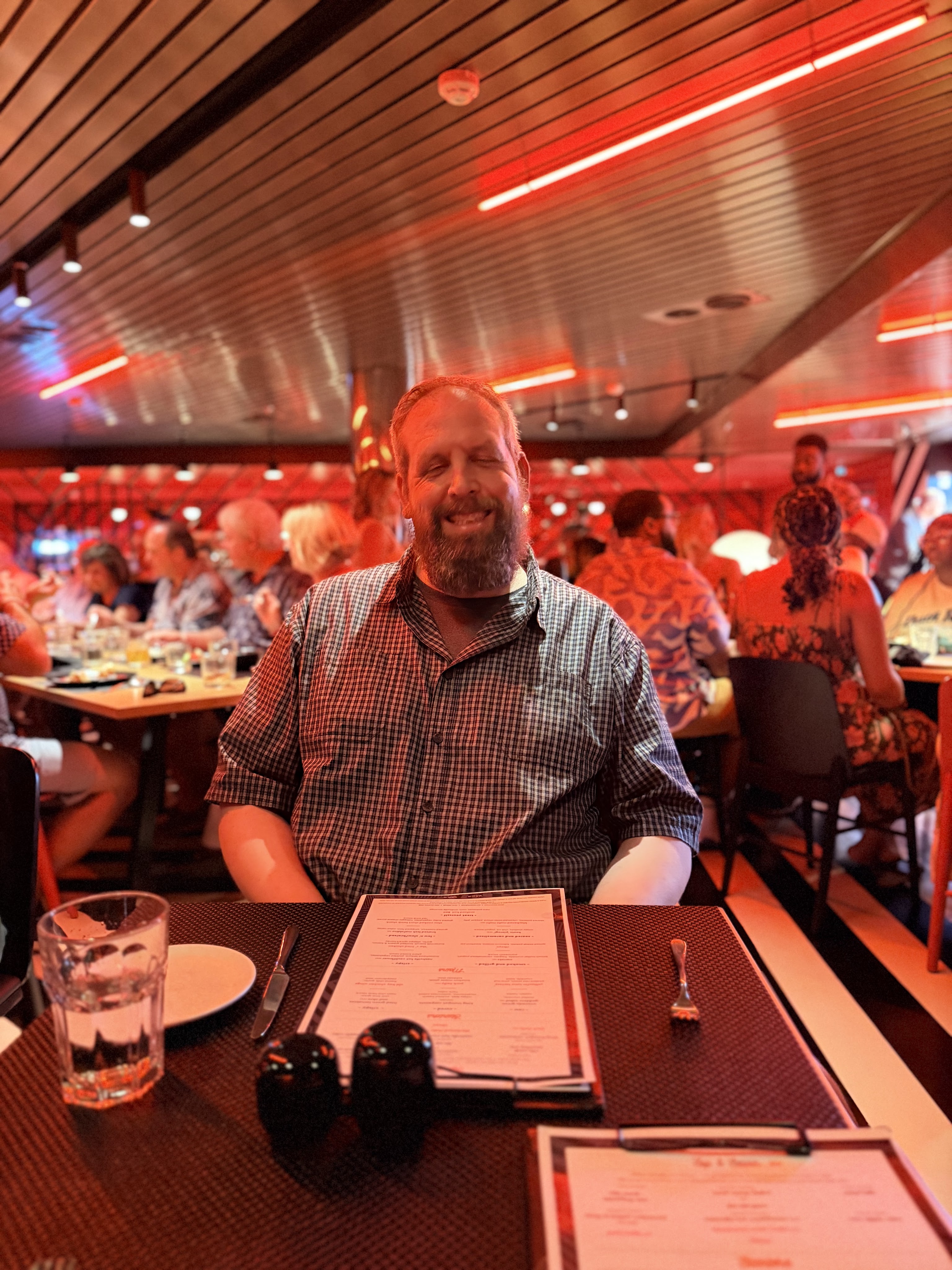 We hadn’t seen him all week! He was the Happenings cast member who welcomed us onto the ship and remembered me from our last cruise.