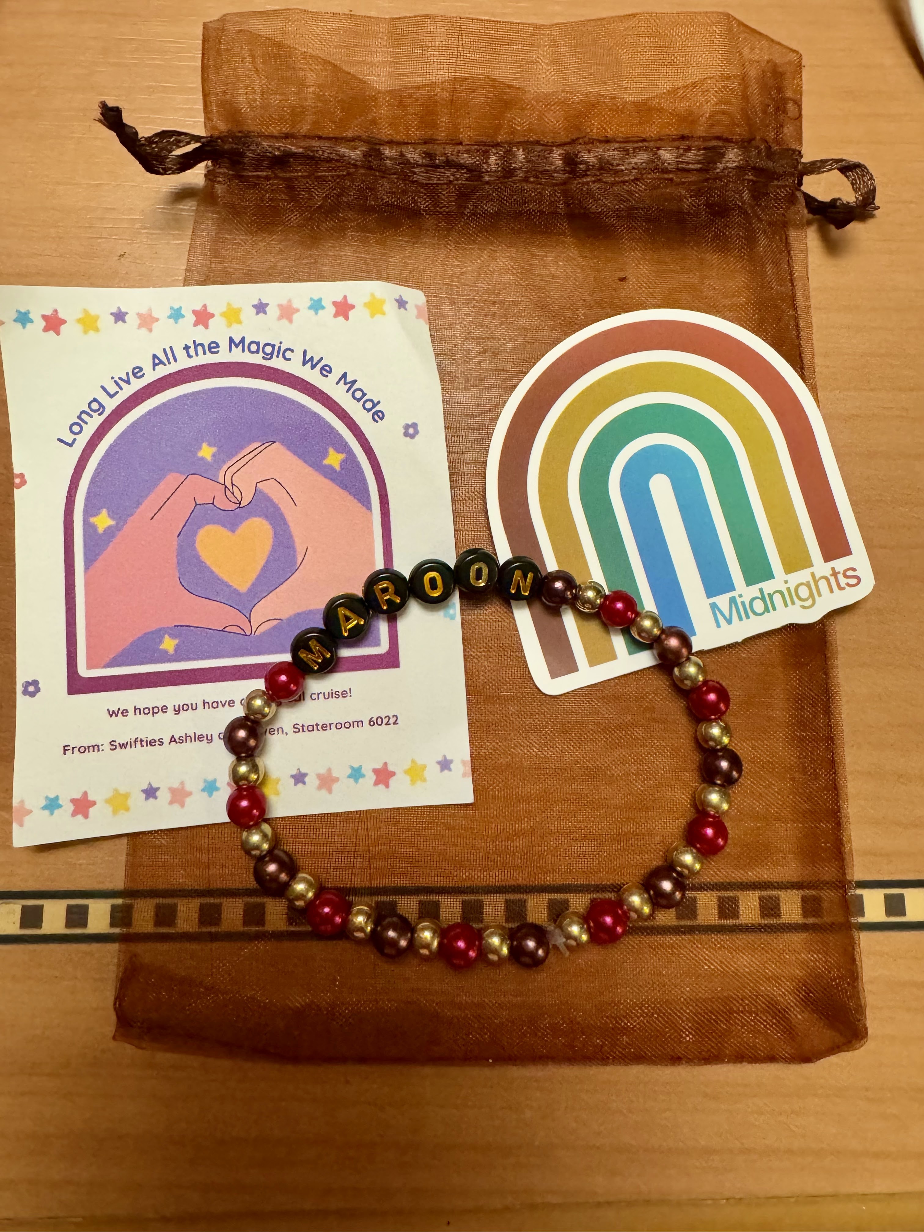 We stopped by our room to grab our cups for drinks. I found I’d been pixie dusted! A fellow Swiftie made me a friendship bracelet! So sweet!